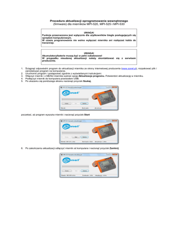 Procedura aktualizacji oprogramowania wewnętrznego (firmware) dla mierników MPI-520, MPI-525 i MPI-530 UWAGA! Funkcja przeznaczona jest wyłącznie dla użytkowników biegle posługujących się sprzętem komputerowym. W czasie programowania nie wolno wyłączać miernika ani rozłączać kabla do transmisji. UWAGA! Akumulatory/baterie muszą być w pełni naładowane! W przypadku nieudanej aktualizacji należy skontaktować się z serwisem producenta. 1. Ściągnąć odpowiedni program do aktualizacji miernika ze strony internetowej producenta (www.sonel.pl), rozpakować plik i zainstalować program na komputerze. 2. Uruchomić program i postępować zgodnie z wyświetlanymi instrukcjami. 3. Włączyć miernik i z MENU miernika wybrać opcję Aktualizacja programu. Potwierdzić aktualizację w mierniku. 4. Podłączyć miernik do komputera przewodem USB. 5. Po ukazaniu się poniższego ekranu nacisnąć przycisk Szukaj, poczekać, aż program wyszuka miernik i nacisnąć przycisk Start 6. Po zakończeniu aktualizacji odłączyć miernik od komputera i nacisnąć przycisk Zamknij