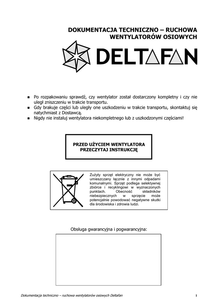 DOKUMENTACJA TECHNICZNO – RUCHOWA WENTYLATORÓW OSIOWYCH Po rozpakowaniu sprawdź, czy wentylator został dostarczony kompletny i czy nie uległ zniszczeniu w trakcie transportu. Gdy brakuje części lub uległy one uszkodzeniu w trakcie transportu, skontaktuj się natychmiast z Dostawcą. Nigdy nie instaluj wentylatora niekompletnego lub z uszkodzonymi częściami! PRZED UśYCIEM WENTYLATORA PRZECZYTAJ INSTRUKCJĘ ZuŜyty sprzęt elektryczny nie moŜe być umieszczany łącznie z innymi odpadami komunalnymi. Sprzęt podlega selektywnej zbiórce i recyklingowi w wyznaczonych punktach. Obecność składników niebezpiecznych w sprzęcie moŜe potencjalnie powodować negatywne skutki dla środowiska i zdrowia ludzi. Obsługa gwarancyjna i pogwarancyjna: Dokumentacja techniczno – ruchowa wentylatorów osiowych Deltafan 1 1. WPROWADZENIE Wentylatory przeznaczone są do wentylacji ogólnej. Obudowy i wirniki wentylatorów ściennych są całkowicie odporne na działanie czynników chemicznych i nie wymagają konserwacji. Silniki posiadają stopień ochrony IP 44, IP 55, IP 56 lub IP 66, co zabezpiecza je przed działaniem pyłu i wody. Wentylatory standardowo nie są wyposaŜone w urządzenia sterujące i regulujące. Prędkość obrotowa wentylatorów osiowych, wyposaŜonych w silniki jednofazowe, moŜe być regulowana w sposób ciągły poprzez opcjonalne zastosowanie mikroprocesorowych regulatorów prędkości obrotowej, np. serii SPA, a trójfazowych – za pomocą przemiennika częstotliwości (falownik). 2. OPIS OGÓLNY Silniki indukcyjne klatkowe, napędzające wentylator są silnikami specjalnymi, budowy zamkniętej, przeznaczonymi do zastosowania, jako napęd elektryczny do wentylatorów. Standardowo silniki posiadają wykonanie: klasa izolacji F, stopień ochrony IP 44, IP 55, IP 56 lub IP 66, rodzaj pracy S1, chłodzenie powietrzem. Napięcie zasilania: silniki jednofazowe 230V 50Hz, korpus A1. Silniki spełniają wymagania normy PN-88/E-06701, PN/E-06701, IEC 34-1, VDE 0530. Wentylatory przeznaczone są do przetłaczania powietrza bez zanieczyszczeń lepkich, Ŝrących lub stwarzających zagroŜenie wybuchem. Dopuszczalna temperatura przetłaczanego powietrza wynosi 40°C lub 60°C dla wentylatorów w wykonaniu standardowym. Urządzenie skonstruowano w oparciu o polskie normy: PN-77/M - 43021 - Wentylatory - ogólne wymagania i badania PN-80/M - 43122 - Wentylatory - Hałas. Wartości dopuszczalne PN-93/N - 01359 - Klasy dokładności wywaŜania wirników 3. MIEJSCE MONTOWANIA WENTYLATORA Wentylator w ramie - ściana budynku lub sufit. Do zamontowania do ściany naleŜy uŜyć odpowiednio duŜych i mocnych wkrętów z kołkami rozporowymi oraz podkładkami. Miejscami mocowania są specjalne zagłębienia w ramie wentylatora. Producent nie nawierca otworów w ramie wentylatora w celu umoŜliwienia indywidualnego montaŜu przez uŜytkownika. Wentylator kominowy przeznaczony jest do montowania w przewodach kominowych na wysokości większej niŜ 2,5 metra od posadzki. JeŜeli odległość od posadzki jest mniejsza niŜ 2,5 metra, to do wentylatora musi zostać zamontowana siatka osłonowa. Wentylator kanałowy przeznaczony jest do wentylacji ogólnej pomieszczeń o charakterze uŜytkowym i przemysłowym - montaŜu w kanale w dowolnej pozycji. Za szkody powstałe w wyniku zamontowania wentylatora niezgodnie z instrukcją producent nie ponosi odpowiedzialności. 4. PODŁĄCZENIE ZASILANIA Wentylatory wyposaŜone są w silniki jednofazowe lub trójfazowe. NaleŜy podłączać je do sieci o właściwym napięciu zgodnie ze schematem podłączenia, który znajduje się w 2 Dokumentacja techniczno – ruchowa wentylatorów osiowych Deltafan miejscu podłączenia zasilania na kaŜdym silniku. Zawsze, bezwarunkowo, wymagane jest podłączenie obudowy silnika za pomocą wkrętu z uziemieniem w instalacji elektrycznej. Wkręt zerujący znajduje się na korpusie silnika w skrzynce zaciskowej. Przewód zasilający silnik winien być dobrany zgodnie z PN-/E-. W przypadku niewłaściwie dobranego przewodu (długi o małym przekroju) wystąpią duŜe spadki napięć utrudniające rozruch silnika. Zaleca się stosowanie bezpiecznika topikowego zabezpieczającego instalację elektryczną przed skutkami zwarcia w silniku. KaŜdy silnik wymaga zastosowania termicznego wyłącznika silnikowego w celu uniknięcia przegrzania się. Zabezpieczenie powinno być dobrane przez uŜytkownika zgodnie z parametrami silnika, zamontowanego w wentylatorze podanymi na tabliczce znamionowej. W przypadku wentylatorów trójfazowych wymagane jest zastosowanie czujnika zaniku faz i wyłącznika termicznego silnika. Wentylatory trójfazowe mogą być sterowane falownikami jednofazowymi i trójfazowymi (podłączenie silnika wentylatora zgodnie z instrukcją obsługi falowników). Wentylatory dostarczane są bez okablowania i wtyczek elektrycznych. Schemat podłączenia silnika znajduje się od wewnętrznej strony pokrywy skrzynki zaciskowej. Dla silników jednofazowych właściwy kierunek wirowania wału silnika uzyskuje się poprzez przełączenie mostków, zgodnie ze schematem połączeń. Dla silników trójfazowych właściwy kierunek wirowania wału silnika uzyskuje się przez zmianę połączenia 2 faz. Silniki trójfazowe wykonane na napięcie 230/400V fabrycznie są połączone w gwiazdę, a rozruch tych silników jest bezpośredni. SCHEMAT PODŁĄCZENIA SILNIKA JEDNOFAZOWEGO IP66 SCHEMAT PODŁĄCZENIA SILNIKA JEDNOFAZOWEGO IP44 SCHEMAT PODŁĄCZENIA SILNIKA TRÓJFAZOWEGO Dokumentacja techniczno – ruchowa wentylatorów osiowych Deltafan 3 5. URUCHOMIENIE Przed uruchomieniem silnika naleŜy sprawdzić: czy wirnik silnika obraca się lekko, czy silnik jest właściwie zerowany, czy kondensator jest właściwie podłączony do fazy pomocniczej (silnik jednofazowy), czy silnik posiada właściwe zabezpieczenie, czy kierunek wirowania wirnika wentylatora jest zgodny z załoŜonym, czy rezystancja izolacji jest zg