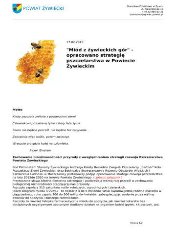 Starostwo Powiatowe w Żywcu ul. Krasińskiego 13 +48 33 860 50 23 [email protected] 17.02.2015 "Miód z żywieckich gór" opracowano strategię pszczelarstwa w Powiecie Żywieckim Motto Kiedy pszczoła zniknie z powierzchni ziemi Człowiekowi pozostaną tylko cztery lata życia Skoro nie będzie pszczół, nie będzie też zapylania. Zabraknie więc roślin, potem zwierząt. Wreszcie przyjdzie kolej na człowieka. Albert Einstein Zachowanie bioróżnorodności przyrody z uwzględnieniem strategii rozwoju Pszczelarstwa Powiatu Żywieckiego . Pod Patronatem Starosty Żywieckiego Andrzeja Kalaty Beskidzki Związek Pszczelarzy „Bartnik” Koło Pszczelarzy Ziemi Żywieckiej, oraz Beskidzkie Stowarzyszenie Rozwoju Obszarów Wiejskich i Kształcenia Ludności w Moszczanicy postanowiły podjąć opracowanie strategii rozwoju pszczelarstwa na lata 2015do 2020 na terenie Powiatu Żywieckiego. ( zobacz załącznik ) Przytoczone słowa Alberta Einsteina ostrzegają i podkreślają ważną rolę pszczół w zachowaniu biologicznej różnorodności otaczającej nas przyrody. Pszczoły zapylają 315 gatunków roślin rolniczych, ogrodniczych i zielarskich. Jeden kilogram miodu /720ml./ - to nektar z 3 do 5 milionów sztuk kwiatów.Jedna rodzina pszczela w ciągu jednego roku zapyla 300 do 500 milionów kwiatów, zabezpieczając wydanie przez roślinę owoców do spożycia i dalszego rozmnażania. Pszczoły to również fabryka farmaceutyczna miodu do spożycia, jak również lekarstw bez obciążonych negatywnymi ubocznymi skutkami działań na organizm ludzki (pyłek, kit pszczeli, jad, Strona 1/2 Starostwo Powiatowe w Żywcu ul. Krasińskiego 13 +48 33 860 50 23 [email protected] miody odmianowe). Strategie opracowano metodą grupową – technika grup nominalnych, z wykorzystaniem elementów burzy mózgów. W opracowaniu uczestniczyli pszczelarze Powiatu Żywieckiego, członkowie Beskidzkiego Związku Pszczelarskiego „Bartnik” oraz przedstawiciele ARiMR, ŚODR, KRUS, BSROWiKL. Opracowanie pozwala spojrzeć na zabezpieczenie biologicznej równowagi środowiska Powiatu Żywieckiego, włączając do współpracy mieszkańców. foto www.funkydiva.pl Strona 2/2 Powered by TCPDF (www.tcpdf.org)