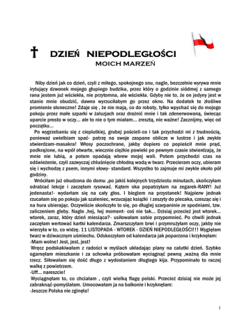 † DZIEŃ NIEPODLEGŁOŚCI MOICH MARZEŃ Niby dzień jak co dzień, czyli z miłego, spokojnego snu, nagle, bezczelnie wyrywa mnie irytujący dzwonek mojego głupiego budzika, przez który o godzinie siódmej z samego rana jestem już wściekła, nie przytomna, ale wściekła. Gdyby nie to, że on jedyny jest w stanie mnie obudzić, dawno wyrzuciłabym go przez okno. Na dodatek te złośliwe promienie słoneczne! Zdaje się , że nie mają, co do roboty, tylko wpychać się do mojego pokoju przez małe szparki w żaluzjach oraz drażnić mnie i tak zdenerwowaną, świecąc uparcie prosto w oczy… ale to nie o tym miałam… zresztą, nie ważne! Zacznijmy, więc od początku… Po wygrzebaniu się z cieplutkiej, grubej pościeli-co i tak przychodzi mi z trudnością, ponieważ uwielbiam spać- patrzę na swoje zaspane oblicze w lustrze i jak zwykle stwierdzam-masakra! Włosy poczochrane, jakby dopiero co popieścił mnie prąd, podkrążone, na wpół otwarte, wiecznie ciężkie powieki po pewnym czasie stwierdzają, że mnie nie lubią, a potem opadają wbrew mojej woli. Potem przychodzi czas na odświeżenie, czyli zazwyczaj chluśnięcie chłodną wodą w twarz. Przecieram oczy, ubieram się i wychodzę z psem, innymi słowy- standard. Wszystko to zajmuje mi zwykle około pół godziny. Wróciłam już obudzona do domu ,po jakiś kolejnych trzydziestu minutach, skończyłam odrabiać lekcje i zaczęłam rysować. Kątem oka popatrzyłam na zegarek-RANY! Już jedenasta!- wydarłam się na cały głos. I biegiem na przystanek! Najpierw jednak rzucałam się po pokoju jak szaleniec, wrzucając książki i zeszyty do plecaka, czesząc się i na hura ubierając. Oczywiście skończyło to się, po długiej szarpaninie ze spodniami, tzw. zaliczeniem gleby. Nagle ,hej, hej moment- coś nie tak… Dzisiaj przecież jest wtorek… wtorek, zaraz, który dzień miesiąca?- usiłowałam sobie przypomnieć. Po chwili jednak zaczęłam wertować kartki kalendarza. Zmarszczyłam brwi i przymrużyłam oczy, jakby nie wierzyła w to, co widzę. 11 LISTOPADA - WTOREK - DZIEŃ NIEPODLEGŁOŚCI!!! Wygięłam twarz w dziwacznym uśmiechu. Odskoczyłam od kalendarza jak poparzona i krzyknęłam: -Mam wolne! Jest, jest, jest! Wręcz podskakiwałam z radości w myślach układając plany na calutki dzień. Szybko ogarnęłam mieszkanie i za schowka próbowałam wyciągnąć pewną ,ważną dla mnie rzecz. Siłowałam się dość długo z wydostaniem długiego kija. Przypominało to raczej walkę z powietrzem. -Uff... nareszcie! Wyciągnęłam to, co chciałam , czyli wielką flagę polski. Przecież dzisiaj nie może jej zabraknąć-pomyślałam. Umocowałam ja na balkonie i krzyknęłam: -Jeszcze Polska nie zginęła! 1 A ktoś z dołu dokończył: -Póki my żyjemy! Kiedy spojrzałam na chodnik, okazało się, że są to moje szalone przyjaciółki- Ewelina, Sara i Ewa, które właśnie miały do mnie wpaść. Zaczęłyśmy się śmiać. -Cześć dziewczyny, co tam słychać?- zaczęłam od progu, kiedy tylko weszły do środka. -W porządku- odpowiedziały zgodnie. -Dasz się porwać dzisiaj z domu?- zagadnęła Ewelina. -Na Zappio, będzie pół naszej szkoły- ciągnęła Sara. -To od „władzy wyższej„ zależy… -No jasne, jak zwykle. Ale muszę ci powiedzieć, że jeśli nie pójdziesz to będziesz żałować. Oprócz defilady symulacji powstań, będą akrobacje powietrzne samolotów wojskowych i nie tylko. Przede wszystkim można będzie pogadać z pilotami…-mówiła dalej Ewa, posyłając mi podejrzliwy uśmieszek. -No chodź, no nie daj się prosić… Wszystkie trzy zrobiły minki coś w stylu biednego psiaka, po czym popatrzyły po sobie i roześmiały się znowu. -No już dzwonie, tylko przestańcie- powiedziałam ze śmiechem w głosie. Po kilku minutach rozmowy uzyskałam zgodę. Po chwili wybiegłyśmy z domu. -To gdzie idziemy?- spytała Ewelina. -No jak to gdzie, na Zappio chyba nie?- zapytałam ze zdziwieniem. -Ok.,ale te pokazy mają się zacząć za…dwie godziny? A do tego czasu…-nie zdążyła skończyć, bo przerwała jej Sara. -Może pójdziemy do kościoła? Przecież są dzisiaj te Msze poświęcone pamięci o Dniu Niepodległości. -Eeee tam, to ja już wole TV włączyć, ponoć jakieś filmy historyczne puszczają i nie tylko.rzuciła Ewa. -Nuuuudy- odpowiedziałam razem z Eweliną. -No to ,co? Radia będziemy słuchać?- spytała z ironią Ewa. -No może jeszcze greckiego?- zapytała Ewelina. -Nie no ,dziewczyny błagam, czy my jesteśmy jakimiś starymi babciami co się przed radiem zbierają- odezwałam się. -RMF FM- zaśpiewała Sara. -Nie, jeszcze lepiej- Radio Maryja- zagrzmiałam poważnym tonem. Roześmiałyśmy się przechodząc przez ulice. Stanęłyśmy nagle po drugiej stronie. -Musimy coś wykombinować. -Hmmmm -Może pójdziemy się pohuśtać- powiedziałam ledwo dławiąc śmiech. Odwróciłam się i pokazałam im plac zabaw dla dzieci stojący za nami. Ponownie wybuchłyśmy śmiechem. W tym momencie zauważyłyśmy, że w naszą stronę idą: Hania, Sandra, Marcin i Bartek. -Hej ludzie, co tu robicie?- zapytał zaskoczony Marcin. Przywitaliśmy się każdy z każdym serdecznym całusem w policzek. -Nie mamy pojęcia gdzie iść.- odpowiedziałyśmy po chwili. 2 -Achaś, to tak jak my. Błąkaliśmy się jakieś pół godziny po Patisjonie, a teraz tutaj, eh!oznajmiła Hania. -Co tam słychać?- zaczęła Sandra. -Wszystko gra… Popatrzyliśmy po sobie. - I zapadła tak a niezręczna cisza…- nareszcie odezwał się Bartek. Roześmialiśmy się znowu. -Może jednak udamy się do metra i pojedziemy na Zappio. Tam przynajmniej coś wymyślimy.- popatrzyłam się na zegarek- Jest już za piętnaście pierwsza. -To i tak została godzina-powiedziała znużonym tonem Ewka. -Wy też tam idziecie?- przerwał Marcin. -No pewnie, a co lepszego mamy do roboty? Poza tym, jak co roku, będzie na pewno świetnie. -To chodźcie, pójdziemy razem. -OK. I ruszyl
