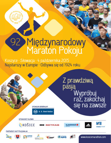 Międzynarodowy Maraton Pokoju Koszyce · Słowacja · 4 października 2015 Najstarszy w Europie · Odbywa się od 1924 roku SPONSOR GENERALNY Z prawdziwą pasją Wypróbuj raz, zakochaj się na zawsze SPONSORZY GŁÓWNI PARTNERZY INSTYTUCJONALNI www.kosicemarathon.com Maratońskie kamienie milowe 1924 NAJSTARSZY W EUROPIE Osiem pionierów maratońskich, inspirowanych maratonem olimpijskim w Paryżu, przed rozpoczęciem pierwszego roku 28 października 1924. 1961 SŁYNNY BIKILA Fenomenalny mistrz olimpijski z Rzymu i Tokio, Abebe Bikila był na ostatnich metrach w Koszycach witany wypełnionym stadionem. 1974 MARATON MIAŁ 50 Mistrz Europy i zwycięzca z Bostonu Ron Hill należał do gwiazd maratonu, który świętował 50tkę. Jego powrót do Koszyc w 2014 roku będzie dla niego i dla nas wielka chwila. 1997 MISTRZOSTWA ŚWIATA Koszyce gościł 6 Mistrzostwa Świata w półmaratonie, które według słów prezydenta IAAF Dr. Prima Nebiola nie były uznane za najbardziej udane w historii. 2014 Wybitni sympatycy Dziesięć tysięcy biegaczy oraz wybitni goście z całego świata przybyło pogratulować koszyckiemu maratonowi na jego 90-te urodziny. 2015 Z prawdziwą pasją 9 dyscyplin biegowych rozpocznie się w niedzielę, 4 października. Biała noc w przeddzień maratonu w zabytkowym centrum gotyckich Koszyc. Odsłonięcie nowych granitowych kolumn przy Rzeźbie Maratończyka. Expo MMM, Muzyczny maraton, konkurs fotograficzny Cvakni si maratón (Kliknij sobie maraton). Legendarny Aurèle Vandendriessche i jego Młodzieżowa sztafeta. Rozdawanie autografów oraz bogaty program weekendowy na głównej scenie MMM. Road to Rio – dążenie do uzyskania limitów kwalifikacyjnych do Igrzysk Olimpijskich w brazylijskim Rio de Janeiro, 2016. Wszystko to w magicznej atmosferze maratońskich Koszyc Wypróbuj raz, zakochaj się na zawsze