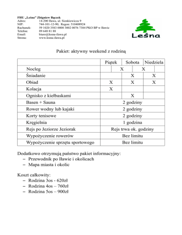 FHU „Leśna” Zbigniew Bączek Adres: 14-200 Iława, ul. Sienkiewicza 9 NIP: 744-101-12-90; Regon: 510408924 Rachunek: 59 1020 3583 0000 3002 0076 7384 PKO BP w Iławie Telefon: 89 648 81 88 Email: [email protected] Strona: www.lesna-ilawa.pl Pakiet: aktywny weekend z rodziną Piątek Nocleg Śniadanie Obiad Kolacja Ognisko z kiełbaskami Basen + Sauna Rower wodny lub kajaki Korty tenisowe Kręgielnia Rejs po Jeziorze Jeziorak Wypożyczenie rowerów Wypożyczenie sprzętu sportowego Sobota X X X X 2 godziny 2 godziny 2 godziny 1 godzina Rejs trwa ok. godziny Bez limitu Bez limitu Dodatkowo otrzymują państwo pakiet informacyjny: – Przewodnik po Iławie i okolicach – Mapa miasta i okolic Koszt całkowity: – Rodzina 3os - 620zł – Rodzina 4os – 760zł – Rodzina 5os – 900zł X X Niedziela X X X