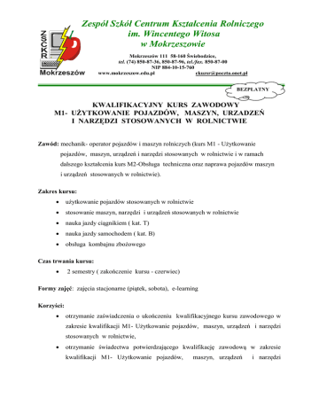 Zespół Szkół Centrum Kształcenia Rolniczego im. Wincentego Witosa w Mokrzeszowie Mokrzeszów 111 58-160 Świebodzice, tel. (74) 850-87-36, 850-87-96, tel./fax. 850-87-00 NIP 884-10-15-760 www.mokrzeszow.edu.pl [email protected] BEZPŁATNY KWALIFIKACYJNY KURS ZAWODOWY M1- UŻYTKOWANIE POJAZDÓW, MASZYN, URZADZEŃ I NARZĘDZI STOSOWANYCH W ROLNICTWIE Zawód: mechanik- operator pojazdów i maszyn rolniczych (kurs M1 - Użytkowanie pojazdów, maszyn, urządzeń i narzędzi stosowanych w rolnictwie i w ramach dalszego kształcenia kurs M2-Obsługa techniczna oraz naprawa pojazdów maszyn i urządzeń stosowanych w rolnictwie). Zakres kursu: użytkowanie pojazdów stosowanych w rolnictwie stosowanie maszyn, narzędzi i urządzeń stosowanych w rolnictwie nauka jazdy ciągnikiem ( kat. T) nauka jazdy samochodem ( kat. B) obsługa kombajnu zbożowego Czas trwania kursu: 2 semestry ( zakończenie kursu - czerwiec) Formy zajęć: zajęcia stacjonarne (piątek, sobota), e-learning Korzyści: otrzymanie zaświadczenia o ukończeniu kwalifikacyjnego kursu zawodowego w zakresie kwalifikacji M1- Użytkowanie pojazdów, maszyn, urządzeń i narzędzi stosowanych w rolnictwie, otrzymanie świadectwa potwierdzającego kwalifikację zawodową w zakresie kwalifikacji M1- Użytkowanie pojazdów, maszyn, urządzeń i narzędzi stosowanych w rolnictwie po zdaniu egzaminu potwierdzającego kwalifikację zawodową. Uczestnicy kursu: Uczestnikiem kursu może być osoba dorosła będąca absolwentem Szkoły Podstawowej, Gimnazjum, Liceum Ogólnokształcącego, Technikum, Wyższej Uczelni. Uwaga: Aby uzyskać dyplom potwierdzający kwalifikacje zawodowe w zawodzie: mechanik – operator pojazdów i maszyn rolniczych należy dodatkowo ukończyć kwalifikacyjny kurs zawodowy w zakresie kwalifikacji M2 - Obsługa techniczna oraz naprawa pojazdów maszyn i urządzeń stosowanych w rolnictwie (czas trwania - jeden semestr). Kształcenie w zawodzie: technik agrobiznesu uznane jest za wykształcenie średnie rolnicze zgodne z Rozporządzeniem Ministra Rolnictwa i Rozwoju Wsi z dnia 17 stycznia 2012r. w sprawie kwalifikacji rolniczych posiadanych przez osoby wykonujące działalność rolniczą (Dz.U. z 2012r., poz. 109).