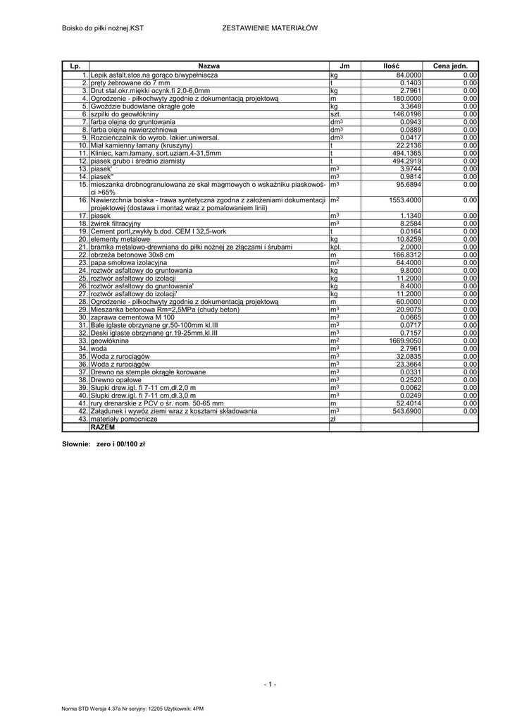 Boisko do piłki nożnej.KST Lp. 1. 2. 3. 4. 5. 6. 7. 8. 9. 10. 11. 12. 13. 14. 15. 16. 17. 18. 19. 20. 21. 22. 23. 24. 25. 26. 27. 28. 29. 30. 31. 32. 33. 34. 35. 36. 37. 38. 39. 40. 41. 42. 43. ZESTAWIENIE MATERIAŁÓW Nazwa Lepik asfalt.stos.na gorąco b/wypełniacza pręty żebrowane do 7 mm Drut stal.okr.miękki ocynk.fi 2,0-6,0mm Ogrodzenie - piłkochwyty zgodnie z dokumentacją projektową Gwoździe budowlane okrągłe gołe szpilki do geowłókniny farba olejna do gruntowania farba olejna nawierzchniowa Rozcieńczalnik do wyrob. lakier.uniwersal. Miał kamienny łamany (kruszyny) Kliniec, kam.łamany, sort.uziarn.4-31,5mm piasek grubo i średnio ziarnisty piasek' piasek'' mieszanka drobnogranulowana ze skał magmowych o wskaźniku piaskowości >65% Nawierzchnia boiska - trawa syntetyczna zgodna z założeniami dokumentacji projektowej (dostawa i montaż wraz z pomalowaniem linii) piasek żwirek filtracyjny Cement portl,zwykły b.dod. CEM I 32,5-work elementy metalowe bramka metalowo-drewniana do piłki nożnej ze złączami i śrubami obrzeża betonowe 30x8 cm papa smołowa izolacyjna roztwór asfaltowy do gruntowania roztwór asfaltowy do izolacji roztwór asfaltowy do gruntowania' roztwór asfaltowy do izolacji' Ogrodzenie - piłkochwyty zgodnie z dokumentacją projektową Mieszanka betonowa Rm=2,5MPa (chudy beton) zaprawa cementowa M 100 Bale iglaste obrzynane gr.50-100mm kl.III Deski iglaste obrzynane gr.19-25mm,kl.III geowłóknina woda Woda z rurociągów Woda z rurociągów Drewno na stemple okrągłe korowane Drewno opałowe Słupki drew.igl. fi 7-11 cm,dł.2,0 m Słupki drew.igl. fi 7-11 cm,dł.3,0 m rury drenarskie z PCV o śr. nom. 50-65 mm Załądunek i wywóz ziemi wraz z kosztami składowania materiały pomocnicze RAZEM Słownie: zero i 00/100 zł -1- Norma STD Wersja 4.37a Nr seryjny: 12205 Użytkownik: 4PM Jm kg t kg m kg szt. dm3 dm3 dm3 t t t m3 m3 m3 Ilość 84.0000 0.1403 2.7961 180.0000 3.3648 146.0196 0.0943 0.0889 0.0417 22.2136 494.1365 494.2919 3.9744 0.9814 95.6894 Cena jedn. 0.00 0.00 0.00 0.00 0.00 0.00 0.00 0.00 0.00 0.00 0.00 0.00 0.00 0.00 0.00 m2 1553.4000 0.00 m3 m3 t kg kpl. m m2 kg kg kg kg m m3 m3 m3 m3 m2 m3 m3 m3 m3 m3 m3 m3 m m3 zł 1.1340 8.2584 0.0164 10.8259 2.0000 166.8312 64.4000 9.8000 11.2000 8.4000 11.2000 60.0000 20.9075 0.0665 0.0717 0.7157 1669.9050 2.7961 32.0835 23.3664 0.0331 0.2520 0.0062 0.0249 52.4014 543.6900 0.00 0.00 0.00 0.00 0.00 0.00 0.00 0.00 0.00 0.00 0.00 0.00 0.00 0.00 0.00 0.00 0.00 0.00 0.00 0.00 0.00 0.00 0.00 0.00 0.00 0.00 Boisko do piłki nożnej.KST Lp. 1. 2. 3. 4. 5. 6. 7. 8. 9. 10. 11. 12. 13. 14. 15. ZESTAWIENIE SPRZĘTU Nazwa Spych.gąsienicowa 74kW Równiarka samojezdna 74kW Walec statycz.samoj.4-6t Walec statycz.samoj.10t Walec wibrac.samojezd.7,5t Piła motor.łańcuch.3,1KW/4,2KM wyciąg aplikator geowłókniny przyczepny Ciągnik kołowy 37kW Samochód dostaw.do 0.9t środek transportowy Przyczepa skrzyniowa 3.5t giętarka do prętów nożyce do prętów prościarka do prętów Jm m-g m-g m-g m-g m-g m-g m-g m-g m-g m-g m-g m-g m-g m-g m-g Słownie: zero i 00/100 zł -2- Norma STD Wersja 4.37a Nr seryjny: 12205 Użytkownik: 4PM Ilość Cena jedn. 25.9418 0.00 10.2524 0.00 3.7282 0.00 114.0196 0.00 13.3592 0.00 32.6214 0.00 0.1120 0.00 10.7185 0.00 10.7340 0.00 0.3573 0.00 0.6524 0.00 0.0155 0.00 0.6720 0.00 0.8120 0.00 0.6020 0.00 RAZEM Wartość 0.00 0.00 0.00 0.00 0.00 0.00 0.00 0.00 0.00 0.00 0.00 0.00 0.00 0.00 0.00