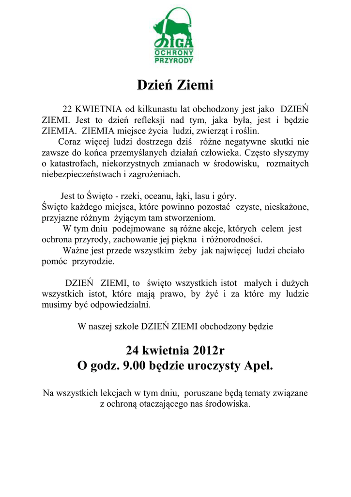 Dzień Ziemi 22 KWIETNIA od kilkunastu lat obchodzony jest jako DZIEŃ ZIEMI. Jest to dzień refleksji nad tym, jaka była, jest i będzie ZIEMIA. ZIEMIA miejsce życia ludzi, zwierząt i roślin. Coraz więcej ludzi dostrzega dziś różne negatywne skutki nie zawsze do końca przemyślanych działań człowieka. Często słyszymy o katastrofach, niekorzystnych zmianach w środowisku, rozmaitych niebezpieczeństwach i zagrożeniach. Jest to Święto - rzeki, oceanu, łąki, lasu i góry. Święto każdego miejsca, które powinno pozostać czyste, nieskażone, przyjazne różnym żyjącym tam stworzeniom. W tym dniu podejmowane są różne akcje, których celem jest ochrona przyrody, zachowanie jej piękna i różnorodności. Ważne jest przede wszystkim żeby jak najwięcej ludzi chciało pomóc przyrodzie. DZIEŃ ZIEMI, to święto wszystkich istot małych i dużych wszystkich istot, które mają prawo, by żyć i za które my ludzie musimy być odpowiedzialni. W naszej szkole DZIEŃ ZIEMI obchodzony będzie 24 kwietnia 2012r O godz. 9.00 będzie uroczysty Apel. Na wszystkich lekcjach w tym dniu, poruszane będą tematy związane z ochroną otaczającego nas środowiska. PROGRAM DNIA ZIEMI 24.IV.2012r ROZPOCZĘCIE GODZ. 9.00 1. WIERSZE I PIOSENKI 2. SCENKA TEATRALNA W WYKONANIU KLASY VI pt. „Pieśń o wszystkich istotach” 3. PODSUMOWANIE AKCJI I KONKURSÓW PRZYRODNICZYCH