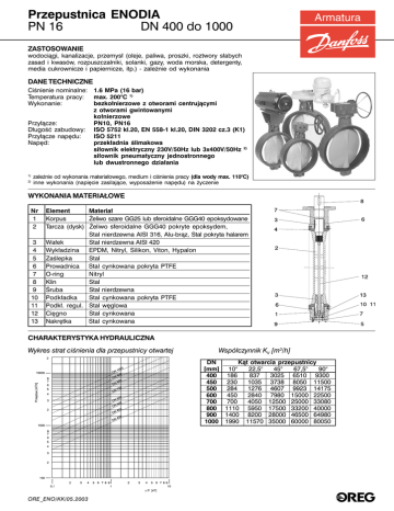 Przepustnica ENODIA PN 16 DN 400 do 1000 Armatura ZASTOSOWANIE wodociągi, kanalizacje, przemysł (oleje, paliwa, proszki, roztwory słabych zasad i kwasów, rozpuszczalniki, solanki, gazy, woda morska, detergenty, media cukrownicze i papiernicze, itp.) - zależnie od wykonania DANE TECHNICZNE Ciśnienie nominalne: Temperatura pracy: Wykonanie: Przyłącze: Długość zabudowy: Przyłącze napędu: Napęd: 1) 2) 1.6 MPa (16 bar) max. 200°C 1) bezkołnierzowe z otworami centrującymi z otworami gwintowanymi kołnierzowe PN10, PN16 ISO 5752 kl.20, EN 558-1 kl.20, DIN 3202 cz.3 (K1) ISO 5211 przekładnia ślimakowa siłownik elektryczny 230V/50Hz lub 3x400V/50Hz 2) siłownik pneumatyczny jednostronnego lub dwustronnego działania zależnie od wykonania materiałowego, medium i ciśnienia pracy (dla wody max. 110°C) inne wykonania (napięcie zasilające, wyposażenie napędu) na życzenie WYKONANIA MATERIAŁOWE Nr 1 2 3 4 5 6 7 8 9 10 11 12 13 Element Materiał Korpus Żeliwo szare GG25 lub sferoidalne GGG40 epoksydowane Tarcza (dysk) Żeliwo sferoidalne GGG40 pokryte epoksydem, Stal nierdzewna AISI 316, Alu-brąz, Stal pokryta halarem Wałek Stal nierdzewna AISI 420 Wykładzina EPDM, Nitryl, Silikon, Viton, Hypalon Zaślepka Stal Prowadnica Stal cynkowana pokryta PTFE O-ring Nitryl Klin Stal Śruba Stal nierdzewna Podkładka Stal cynkowana pokryta PTFE Podkł. regul. Stal węglowa Cięgno Stal cynkowana Nakrętka Stal cynkowana CHARAKTERYSTYKA HYDRAULICZNA Wykres strat ciśnienia dla przepustnicy otwartej Współczynnik KV [m3/h] DN Kąt otwarcia przepustnicy [mm] 10° 22,5° 45° 67,5° 90° 400 186 837 3025 6510 9300 450 230 1035 3738 8050 11500 500 284 1276 4607 9923 14175 600 450 2840 7980 15000 22500 700 700 4050 12500 25000 33080 800 1110 5950 17500 33200 40000 900 1400 8200 28000 46500 64980 1000 1990 11570 35000 60000 80050 ORE_ENO/KK/05.2003 Przepustnica ENODIA PN 16 DN 400 do 1000 WYMIARY otwory centrujące DN mm 400 450 500 600 700 800 900 1000 1) 2) A mm 338 368 403 495 570 630 700 750 B mm 315 350 375 438 503 568 655 702 otwory gwintowane C mm 102 114 127 154 165 190 203 216 ØD mm 476 526 570 679 793 889 995 1100 E mm 582 645 716 – – – – – M mm 148 166 181 214 255 292 331 375 N mm 385 432 472 562 655 751 841 941 ISO TOP F12 F14 F14 F16 F25 F25 F30 F30 dwa kołnierze ØG mm 38 48 48 58 89 89 104 104 H mm 63 80 80 91 110 110 130 130 Masa [kg] 1) (2) (3) (4) 61 85 80 81 88 106 101 165 132 190 – 247 260 – 338 335 – 435 597 – 776 710 – 923 Przepustnica bez napędu, korpus: GGG40/epoksyd, wykładzina: EPDM, tarcza: GGG40/epoksyd Korpus z otworami centrującymi, 3) Korpus z otworami gwintowanymi, 4) Korpus z dwoma kołnierzami WYMIARY PRZEPUSTNIC Z NAPĘDAMI DN mm 400 450 500 600 700 800 900 1000 A mm 315 350 375 438 503 568 655 702 B mm 580 716 751 900 879 939 1109 1159 C mm 291 416 416 487 500 500 500 500 D mm 102 114 127 154 166 190 203 216 E Masa mm kg 400 84 600 138 600 150 700 275 500 363 500 443 700 392 700 439 DN mm 400 450 500 600 700 800 900 1000 A mm 315 350 375 438 503 568 655 702 B mm 598 649 684 776 851 958 1208 1078 C mm 497 566 566 566 497 666 666 791 D mm 102 114 127 154 165 190 203 216 E mm 236 333 333 333 288 265 315 315 Masa kg 122 184 196 290 374 454 655 753 Napęd AS100 AS200 AS200 AS200 AS400 ASM2 RS1825 ASM3 RS1830 ASM1 RS1830G UWAGA! Dobór napędów uzależniony jest nie tylko od typu i rozmiaru przepustnicy, ale i od ciśnienia roboczego oraz rodzaju przepływającego medium (gęstość, lepkość, etc.) W tabelach obok przedstawiono dobór siłowników elektrycznych i pneumatycznych dla ciśnienia roboczego 16 bar i medium ciekłego (woda). W sprawie doboru napędów dla innych warunków pracy prosimy o kontakt z przedstawicielem Danfoss Sp. z o.o. ORE_ENO/KK/05.2003 Przepustnica ENODIA PN 16 DN 400 do 1000 WSPÓŁPRACA PRZEPUSTNIC Z NAPĘDAMI DN mm 400 450 500 600 700 800 900 1000 1) A mm 315 350 375 438 503 568 655 702 B mm 718 563 598 702 797 908 978 1170 C mm 342 1210 1210 1210 1320 1425 1425 1500 D mm 102 114 127 154 165 190 203 216 E mm 342 630 630 630 730 935 935 1125 Masa kg 187 348 360 462 649 1080 1227 1640 Napęd SA1) AT700S12 ACT400-V250-0-15 ACT400-V250-0-15 ACT400-V300-0-15 ACT800-V350-0-15 ACT1600-V400-0-15 ACT1600-V450-0-15 ACT3200-V450-0-15 DN mm 400 450 500 600 700 800 900 1000 A mm 315 350 375 438 503 568 655 702 B mm 633 717 752 875 822 882 982 1057 C mm 272 311 311 342 730 730 730 730 D mm 102 114 127 154 165 190 203 216 E mm 272 311 311 342 290 290 209 290 Masa kg 108 175 187 320 454 563 783 1053 Napęd DA2) AT600DA AT650DA AT650DA AT700DA ACT800-V250-0 ACT800-V250-15 ACT800-V300-15 ACT800-V300-15 SA - napęd jednostronnego działania, 2) DA - napęd dwustronnego działania WSPÓŁPRACA PRZEPUSTNIC Z NAPĘDAMI Przekładnia ślimakowa Nie wymagająca smarowania skrzynka przekładniowa (z żeliwa szarego epoksydowanego) z układem ślimakowym i kółkiem ręcznym, wyposażona w miejscowy wskaźnik położenia zaworu. Na życzenie przepustnice mogą być wyposażone w: przekładnię ślimakową (ze stali nierdzewnej) IP65 z kółkiem ręcznym, przekładnię ślimakową (z żeliwa szarego epoksydowanego) z wyjściem pod klucz, przekładnię ślimakową (z żeliwa szarego epoksydowanego) z łańcuchem, inne wykonania na życzenie. Opcjonalnie przekładnia ślimakowa może być wyposażona w mikrowyłączniki krańcowe do zdalnej sygnalizacji położenia przepustnicy: pojedyncze IP66, podwójne IP66 i w puszce IP67; mechaniczne lub indukcyjne. Siłownik elektryczny Standardowo stosowane są siłowniki elektryczne prod. BERNARD typu on/off, 230V/50Hz lub 3x400V/50Hz, pracujące w trybie S4-30%, stopień ochrony obudowy IP67. Podstawowe wyposażenie siłowników stanowią: 4 wyłączniki krańcowe (dwa zasadnicze i dwa dodatkowe), wyłączniki momentowe (z wyjątkiem siłowników typu OA), grzałka antykondensacyjna, awaryjne kółko ręczne (ze sprzęgłem), miejscowy mechaniczny wskaźnik położenia. Na życzenie prze