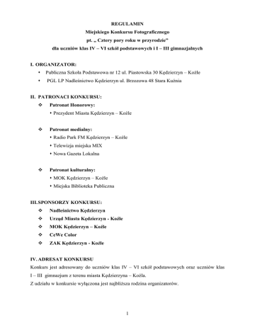 REGULAMIN Miejskiego Konkursu Fotograficznego pt. „ Cztery pory roku w przyrodzie” dla uczniów klas IV – VI szkół podstawowych i I – III gimnazjalnych I. ORGANIZATOR: Publiczna Szkoła Podstawowa nr 12 ul. Piastowska 30 Kędzierzyn – Koźle PGL LP Nadleśnictwo Kędzierzyn ul. Brzozowa 48 Stara Kuźnia II. PATRONACI KONKURSU: Patronat Honorowy: Prezydent Miasta Kędzierzyn – Koźle Patronat medialny: Radio Park FM Kędzierzyn – Koźle Telewizja miejska MIX Nowa Gazeta Lokalna Patronat kulturalny: MOK Kędzierzyn – Koźle Miejska Biblioteka Publiczna III. SPONSORZY KONKURSU: Nadleśnictwo Kędzierzyn Urząd Miasta Kędzierzyn - Koźle MOK Kędzierzyn – Koźle CeWe Color ZAK Kędzierzyn - Koźle IV. ADRESAT KONKURSU Konkurs jest adresowany do uczniów klas IV – VI szkół podstawowych oraz uczniów klas I – III gimnazjum z terenu miasta Kędzierzyna – Koźla. Z udziału w konkursie wyłączona jest najbliższa rodzina organizatorów. 1 V. CELE KONKURSU ukazanie piękna i uroków pór roku w przyrodzie, rozbudzanie zainteresowań dziedziną fotografii, rozwijanie osobistych zainteresowań, wrażliwości estetycznej oraz indywidualnych zdolności twórczych. VI. OCENA PRAC KONKURSOWYCH 1. Ocenę prac konkursowych dokonuje Jury w składzie powołanym przez Organizatorów konkursu. 2. Z przebiegu prac Jury będą sporządzone protokoły. 3. Komisja oceniać będzie: poprawność merytoryczną (zgodność z tematem) estetykę (kompozycja, ostrość) wrażliwość (każde zdjęcie należy opatrzyć tytułem) ujęcie tematu (ciekawe, nietypowe spojrzenie na obiekt fotografowany) 4. Ocena prac będzie polegała na przydzieleniu każdej pracy od 1 do 10 punktów. Punkty z kolejnych etapów będą sumowane, a utworzona w ten sposób punktacja wyłoni zwycięzcę nagrody Grand Prix. Prace konkursowe mają ukazywać: rośliny, zwierzęta (nie domowe) oraz zjawiska przyrodnicze podczas czterech pór roku na terenach kędzierzyńsko – kozielskich. VII. STRUKTURA I PRZEBIEG KONKURSU 1. Konkurs jest imprezą amatorską, odbywającą się na terenie Kędzierzyna – Koźla. Składa się z 4 etapów związanych z 4 porami roku: 1 etap - wiosna 2 etap - lato 3 etap - jesień 4 etap - zima 2. Prace należy wykonać indywidualnie. W konkursie mogą wziąć udział wyłącznie prace autorskie, nigdzie nie publikowane. 3. Każdy uczestnik może zgłosić 1 - 3 zdjęcia realizujące temat konkursu. 4. Rodzaje nadsyłanych zdjęć w formacie, 20x30 cm na papierze błyszczącym. Należy dołączyć płytę CD z cyfrową wersją nadesłanych prac w dowolnym formacie graficznym o minimalnej długości dłuższego boku zdjęcia 1600 pikseli. 2 5. Każde zdjęcie oraz płytę CD należy czytelnie podpisać na odwrocie (najlepiej drukowanymi literami): imię i nazwisko, klasa, nazwa i adres szkoły, opiekun oraz tel. kontaktowy, tytuł zdjęcia. wraz Prace z oświadczeniem należy przesłać w usztywnionej kopercie (ale nie w bąbelkowej) lub dostarczyć osobiście pod adres: PSP nr 12 ul. Piastowska 30 47 – 200 Kędzierzyn - Koźle z dopiskiem: Konkurs fotograficzny „Cztery pory roku w przyrodzie” + realizowany etap 6. Fotografie nie mogą być modyfikowane elektronicznie , z wyjątkiem kadrowania i podstawowej korekty globalnej, tj. zmiana kontrastu, jasności, nasycenia i ostrości. Niedopuszczalna jest modyfikacja prowadząca do zmiany kompozycji (usuwanie/dodawanie elementów). 7. Uczestników konkursu obowiązuje zasada etycznego podejścia do środowiska przyrodniczego – zdjęcia, które w ocenie Jury wykonano, narażając na szkodę fotografowany obiekt, również będą dyskwalifikowane. 8. Osoby niepełnoletnie mogą brać udział w konkursie wyłącznie za zgodą swoich rodziców lub opiekunów prawnych. Dane osób niepełnoletnich, bez uprzedniej zgody rodziców lub opiekunów, nie będą przetwarzane w celach innych niż służących umożliwieniu takim osobom uczestnictwa w konkursie i ewentualnemu powiadomieniu o wygranej. 9. W przypadku osób niepełnoletnich, których prace zakwalifikowano i wyróżniono w konkursie zgoda rodziców lub opiekunów , w tym zgoda na zbieranie i przetwarzanie podanych przez nich danych osobowych w celach promocyjno – marketingowych związanych z prowadzoną przez organizatorów działalnością, zgodnie z ustawą z dnia 29 sierpnia 1997r. o ochronie danych osobowych (Dz. U. z 2002 r. Nr 101 poz.926 j.t. ze zmianami) oraz zgoda na przetwarzanie autorskich praw majątkowych do prac nagrodzonych i wyróżnionych, musi być wyrażona na piśmie w formie oświadczenia w odpowiedniej treści – wzór oświadczenia stanowi załącznik nr 1 do regulaminu. Oświadczenie należy nadesłać wraz z pracą konkursową. Prace nadesłane bez oświadczeń nie będą brały udział w konkursie. 10. Niniejszy konkurs, którego warunki zostały określone przez organizatora nie jest „grą losową”, „loterią fantową”, „zakładem wzajemnym” ani „loterią promocyjną”, których wynik zależy od przypadku w rozumieniu art.2 ustawy z dnia 29 lipca 1992 o grach i zakładach wzajemnych (Dz. U. z 2004 r. Nr 4, poz.27 j.t. ze zmianami). 3 VI. TERMINARZ KONKURSU 1 ETAP: „Wiosna” data zakończenia: 29.04.2011 ogłoszenie wyników: 16.05.2011 wystawa: 16.05. – 27.05.2011 2 ETAP: „Lato” data zakończenia: 23.09.2011 ogłoszenie wyników: 04.10.2011 wystawa: 04.10 – 18.10.2011 3 ETAP: „Jesień” data zakończenia: 10.11.2011 ogłoszenie wyników: 15.11.2011 wystawa: 15.11 - 29.11.2011 4 ETAP: „Zima” data zakończenia: 03.02.2012 ogłoszenie wyników: 07.02.2012 wystawa: 07.02 - 21.02.2012 W przypadku przesyłania prac pocztą, o zakwalifikowaniu jej do konkursu decyduje data stempla pocztowego. VII. SPOSÓB I TERMIN OGŁOSZENIA WYNIKÓW Ogłoszenie wyników i uroczyste wręczenie nagród po zakończeniu każdego etapu odbędzie się w MBP ul. Damrota 5 47 – 220 Kędzierzyn – Koźle i jest połączone z jednoczesnym otwarciem w