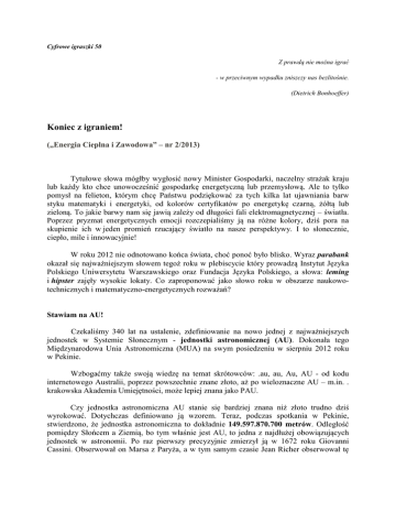 Cyfrowe igraszki 50 Z prawdą nie można igrać - w przeciwnym wypadku zniszczy nas bezlitośnie. (Dietrich Bonhoeffer) Koniec z igraniem! („Energia Cieplna i Zawodowa” – nr 2/2013) Tytułowe słowa mógłby wygłosić nowy Minister Gospodarki, naczelny strażak kraju lub każdy kto chce unowocześnić gospodarkę energetyczną lub przemysłową. Ale to tylko pomysł na felieton, którym chcę Państwu podziękować za tych kilka lat ujawniania barw styku matematyki i energetyki, od kolorów certyfikatów po energetykę czarną, żółtą lub zieloną. To jakie barwy nam się jawią zależy od długości fali elektromagnetycznej – światła. Poprzez pryzmat energetycznych emocji rozczepialiśmy ją na różne kolory, dziś pora na skupienie ich w jeden promień rzucający światło na nasze perspektywy. I to słonecznie, ciepło, mile i innowacyjnie! W roku 2012 nie odnotowano końca świata, choć ponoć było blisko. Wyraz parabank okazał się najważniejszym słowem tegoż roku w plebiscycie który prowadzą Instytut Języka Polskiego Uniwersytetu Warszawskiego oraz Fundacja Języka Polskiego, a słowa: leming i hipster zajęły wysokie lokaty. Co zaproponować jako słowo roku w obszarze naukowotechnicznych i matematyczno-energetycznych rozważań? Stawiam na AU! Czekaliśmy 340 lat na ustalenie, zdefiniowanie na nowo jednej z najważniejszych jednostek w Systemie Słonecznym - jednostki astronomicznej (AU). Dokonała tego Międzynarodowa Unia Astronomiczna (MUA) na swym posiedzeniu w sierpniu 2012 roku w Pekinie. Wzbogaćmy także swoją wiedzę na temat skrótowców: .au, au, Au, AU - od kodu internetowego Australii, poprzez powszechnie znane złoto, aż po wieloznaczne AU – m.in. . krakowska Akademia Umiejętności, może lepiej znana jako PAU. Czy jednostka astronomiczna AU stanie się bardziej znana niż złoto trudno dziś wyrokować. Dotychczas definiowano ją wzorem. Teraz, podczas spotkania w Pekinie, stwierdzono, że jednostka astronomiczna to dokładnie 149.597.870.700 metrów. Odległość pomiędzy Słońcem a Ziemią, bo tym właśnie jest AU, to jedna z najdłużej obowiązujących jednostek w astronomii. Po raz pierwszy precyzyjnie zmierzył ją w 1672 roku Giovanni Cassini. Obserwował on Marsa z Paryża, a w tym samym czasie Jean Richer obserwował tę samą planetę z Gujany Francuskiej. Po uwzględnieniu paralaksy obaj astronomowie obliczyli, że odległość pomiędzy Ziemią a Słońcem wynosi 140 milionów kilometrów. Aż do końca dwudziestego wieku podobne pomiary były jedynym wiarygodnym sposobem na określenie tej odległości, dlatego AU była wyrażana w dość nieprecyzyjny i skomplikowany sposób. W definicji używano m.in. stałej Gaussa, która opiera się na masie Słońca. Tymczasem Słońce bez przerwy traci masę. Kolejny problem stwarzała ogólna teoria względności. Zgodnie z nią AU obserwowana z Ziemi i np. z Jowisza była różna. Nowa definicja likwiduje wszystkie problemy związane z AU. Jednostka przestała być zależna od masy Słońca, określa się ją w metrach, a z kolei definicja metra związana jest z prędkością światła w próżni, która jest stała we wszystkich punktach odniesienia, zatem jest niezależna od pozycji obserwatora. Starania o zmianę definicji AU trwały od lat. Pojazdy kosmiczne, radary czy lasery wykorzystują bezpośredni pomiar odległości, możliwe więc było ustalenie AU w metrach. Opór środowiska naukowego był jednak silny. Jak mówi Nicole Capitaine z Obserwatorium Paryskiego, który był jedną z osób lobbujących za zmianami, niektórzy naukowcy bali się, że nowa definicja zakłóci pracę ich programów komputerowych, inni z powodów sentymentalnych woleli używać starej definicji. Polska przystąpiła do MUA w 1922 roku, czyli już 81 lat temu, obecnie do organizacji należy około stu polskich astronomów. Do decyzji MUA należy m.in. nadawanie nazw nowo odkrytym ciałom niebieskim oraz nazywania tworów powierzchniowych na nich występujących. Zajmuje się tym Grupa Robocza ds. Nomenklatury Systemu Planetarnego (ang. Working Group for Planetary System Nomenclature). Brałem przed 45 laty udział w finale Olimpiady Astronomicznej, stąd pozostał szacunek dla wielkich odległości i marzenie aby nazwano jakąś szczelinę na Marsie cyfrową igraszką (na Księżycu jest krater Theophilus). Dnia 19 lutego minie 540 lat od urodzenia Mikołaja Kopernika, który dał nazwy na niebie kraterowi księżycowemu (widocznemu przez lornetkę), kraterowi marsjańskiemu (nazwanemu 40 lat temu) i planetoidzie 1322 oddalonej 2,42 AU. Tegoż dnia 3 lata temu w kolejną rocznicę narodzin astronoma nazwano pierwiastek 112 copernicium. Mają też swoje kratery na Księżycu i Skłodowska, i Sternfeld. Nawet większe od Kopernika, choć krater Sternfelda z drugiej, niewidocznej strony. Inne polskie nazwy warto samodzielnie poszukać – nie jest ich zbyt wiele;(. Czego życzyć energetyce? Aby nie zatrudniała hipsterów, nie inwestowała w para bankach, ale odważnie patrzyła w kierunku Słońca, a w jego cieple ogrzewali się zarówno konsumenci jak i prosumenci, a rządcy podejmowali jedynie słuszne decyzje. Ponadto liczmy!!! gdy porywać się będziemy z motyką na Słońce. Częściowych zaćmień Słońca w Polsce się nie boimy, choć najbliższe przewiduje się już w 2015 roku, ale całkowite czeka nas już w 2135 i w 2142 roku. Zatem do czasu całkowitego zaćmienia zbudujmy polską samowystarczalną gospodarkę energetyczną. Teofil