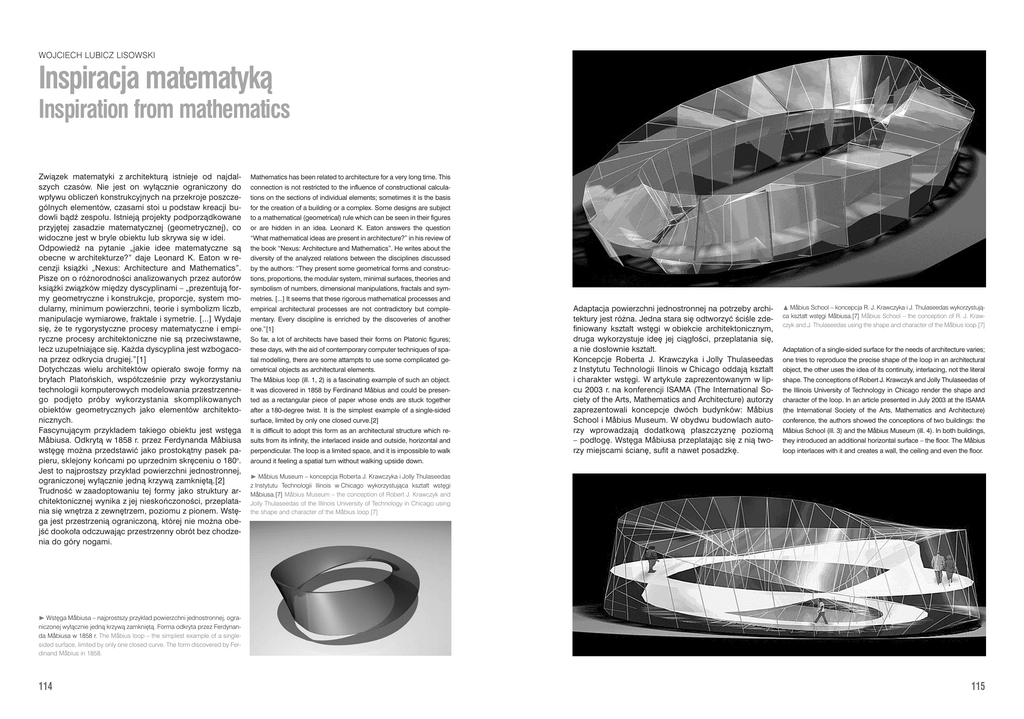 WOJCIECH LUBICZ LISOWSKI Inspiracja matematykà Inspiration from mathematics Zwiàzek matematyki z architekturà istnieje od najdalszych czasów. Nie jest on wy∏àcznie ograniczony do wp∏ywu obliczeƒ konstrukcyjnych na przekroje poszczególnych elementów, czasami stoi u podstaw kreacji budowli bàdê zespo∏u. Istniejà projekty podporzàdkowane przyj´tej zasadzie matematycznej (geometrycznej), co widoczne jest w bryle obiektu lub skrywa si´ w idei. Odpowiedê na pytanie „jakie idee matematyczne sà obecne w architekturze?” daje Leonard K. Eaton w recenzji ksià˝ki „Nexus: Architecture and Mathematics”. Pisze on o ró˝norodnoÊci analizowanych przez autorów ksià˝ki zwiàzków mi´dzy dyscyplinami – „prezentujà formy geometryczne i konstrukcje, proporcje, system modularny, minimum powierzchni, teorie i symbolizm liczb, manipulacje wymiarowe, fraktale i symetrie. [...] Wydaje si´, ˝e te rygorystyczne procesy matematyczne i empiryczne procesy architektoniczne nie sà przeciwstawne, lecz uzupe∏niajàce si´. Ka˝da dyscyplina jest wzbogacona przez odkrycia drugiej.”[1] Dotychczas wielu architektów opiera∏o swoje formy na bry∏ach Platoƒskich, wspó∏czeÊnie przy wykorzystaniu technologii komputerowych modelowania przestrzennego podj´to próby wykorzystania skomplikowanych obiektów geometrycznych jako elementów architektonicznych. Fascynujàcym przyk∏adem takiego obiektu jest wst´ga Mˆbiusa. Odkrytà w 1858 r. przez Ferdynanda Mˆbiusa wst´g´ mo˝na przedstawiç jako prostokàtny pasek papieru, sklejony koƒcami po uprzednim skr´ceniu o 180o. Jest to najprostszy przyk∏ad powierzchni jednostronnej, ograniczonej wy∏àcznie jednà krzywà zamkni´tà.[2] TrudnoÊç w zaadoptowaniu tej formy jako struktury architektonicznej wynika z jej nieskoƒczonoÊci, przeplatania si´ wn´trza z zewn´trzem, poziomu z pionem. Wst´ga jest przestrzenià ograniczonà, której nie mo˝na obejÊç dooko∏a odczuwajàc przestrzenny obrót bez chodzenia do góry nogami. Mathematics has been related to architecture for a very long time. This connection is not restricted to the influence of constructional calculations on the sections of individual elements; sometimes it is the basis for the creation of a building or a complex. Some designs are subject to a mathematical (geometrical) rule which can be seen in their figures or are hidden in an idea. Leonard K. Eaton answers the question “What mathematical ideas are present in architecture?” in his review of the book “Nexus: Architecture and Mathematics”. He writes about the diversity of the analyzed relations between the disciplines discussed by the authors: “They present some geometrical forms and constructions, proportions, the modular system, minimal surfaces, theories and symbolism of numbers, dimensional manipulations, fractals and symmetries. [...] It seems that these rigorous mathematical processes and empirical architectural processes are not contradictory but complementary. Every discipline is enriched by the discoveries of another one.”[1] So far, a lot of architects have based their forms on Platonic figures; these days, with the aid of contemporary computer techniques of spatial modelling, there are some attampts to use some complicated geometrical objects as architectural elements. The Mˆbius loop (ill. 1, 2) is a fascinating example of such an object. It was dicovered in 1858 by Ferdinand Mˆbius and could be presented as a rectangular piece of paper whose ends are stuck together after a 180-degree twist. It is the simplest example of a single-sided surface, limited by only one closed curve.[2] It is difficult to adopt this form as an architectural structure which results from its infinity, the interlaced inside and outside, horizontal and perpendicular. The loop is a limited space, and it is impossible to walk Adaptacja powierzchni jednostronnej na potrzeby architektury jest ró˝na. Jedna stara si´ odtworzyç ÊciÊle zdefiniowany kszta∏t wst´gi w obiekcie architektonicznym, druga wykorzystuje ide´ jej ciàg∏oÊci, przeplatania si´, a nie dos∏ownie kszta∏t. Koncepcje Roberta J. Krawczyka i Jolly Thulaseedas z Instytutu Technologii Ilinois w Chicago oddajà kszta∏t i charakter wst´gi. W artykule zaprezentowanym w lipcu 2003 r. na konferencji ISAMA (The International Society of the Arts, Mathematics and Architecture) autorzy zaprezentowali koncepcje dwóch budynków: Mˆbius School i Mˆbius Museum. W obydwu budowlach autorzy wprowadzajà dodatkowà p∏aszczyzn´ poziomà – pod∏og´. Wst´ga Mˆbiusa przeplatajàc si´ z nià tworzy miejscami Êcian´, sufit a nawet posadzk´. π Mˆbius School – koncepcja R. J. Krawczyka i J. Thulaseedas wykorzystujàca kszta∏t wst´gi Mˆbiusa.[7] Mˆbius School – the conception of R. J. Krawczyk and J. Thulaseedas using the shape and character of the Mˆbius loop.[7] Adaptation of a single-sided surface for the needs of architecture varies; one tries to reproduce the precise shape of the loop in an architectural object, the other uses the idea of its continuity, interlacing, not the literal shape. The conceptions of Robert J. Krawczyk and Jolly Thulaseedas of the Illinois University of Technology in Chicago render the shape and character of the loop. In an article presented in July 2003 at the ISAMA (the International Society of the Arts, Mathematics and Architecture) conference, the authors showed the conceptions of two buildings: the Mˆbius School (ill. 3) and the Mˆbius Museum (ill. 4). In both buildings, they introduced an additional horizontal surface – the floor. The Mˆbius loop interlaces with it and creates a wall, the ceiling and even the floor. around it feeling a spatial turn without walking upside down. ® Mˆbius Museum – koncepcja Roberta J. Krawczyka i Jolly Thulaseedas z Instytutu Technologii Ilinois w Chicago wykorzystujàca kszta∏t wst´gi Mˆbiusa.[7] Mˆbius Museum – the conception of Robert J. 