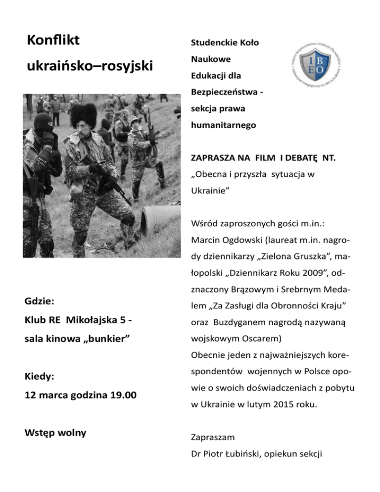 Konflikt ukraińsko–rosyjski Studenckie Koło Naukowe Edukacji dla Bezpieczeństwa sekcja prawa humanitarnego ZAPRASZA NA FILM I DEBATĘ NT. „Obecna i przyszła sytuacja w Ukrainie” Wśród zaproszonych gości m.in.: Marcin Ogdowski (laureat m.in. nagrody dziennikarzy „Zielona Gruszka”, małopolski „Dziennikarz Roku 2009”, odznaczony Brązowym i Srebrnym Meda- Gdzie: lem „Za Zasługi dla Obronności Kraju” Klub RE Mikołajska 5 - oraz Buzdyganem nagrodą nazywaną sala kinowa „bunkier” wojskowym Oscarem) Obecnie jeden z najważniejszych kore- Kiedy: 12 marca godzina 19.00 Wstęp wolny spondentów wojennych w Polsce opowie o swoich doświadczeniach z pobytu w Ukrainie w lutym 2015 roku. Zapraszam Dr Piotr Łubiński, opiekun sekcji