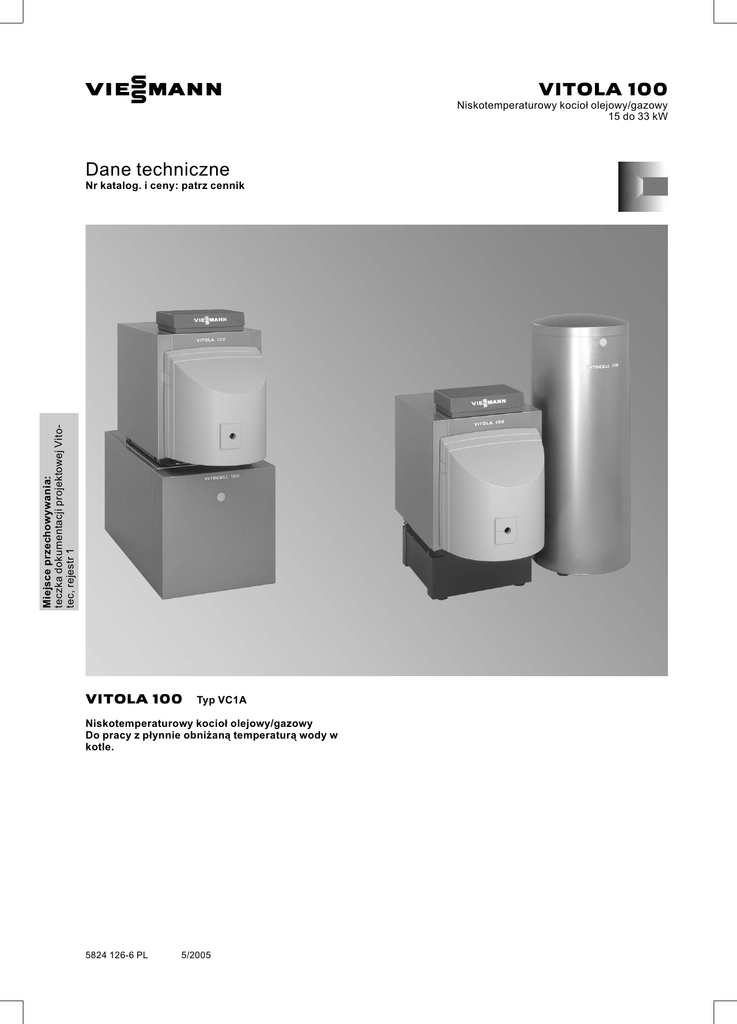 VIESMANN Dane techniczne Miejsce przechowywania: teczka dokumentacji projektowej Vitotec, rejestr 1 Nr katalog. i ceny: patrz cennik VITOLA 100 Typ VC1A Niskotemperaturowy kocioł olejowy/gazowy Do pracy z płynnie obniżaną temperaturą wody w kotle. 5824 126-6 PL 5/2005 VITOLA 100 Niskotemperaturowy kocioł olejowy/gazowy 15 do 33 kW Zalety w skrócie & & & Sprawność znormalizowana: 94 %. Powierzchnia grzewcza z żeliwa i stali zapewnia wysokie bezpieczeństwo eksploatacji i dużą trwałość. Spalanie z niską emisją zanieczyszczeń: wysokość emisji znacznie poniżej dolnej wartości granicznej wymaganej dla symbolu ochrony środowiska „Błękitny Anioł”. & & & Łatwe czyszczenie powierzchni grzewczej. Niewielkie straty ciepła dzięki wysokowydajnej izolacji cieplnej. Możliwa eksploatacja z zasysaniem powietrza do spalania z zewnątrz. A Wysoce skuteczna izolacja cieplna B Powierzchnia grzewcza z żeliwa i stali zapewniająca wysokie bezpieczeństwo eksploatacji i dużą trwałość C Vitotronic – inteligentny, prosty w montażu, obsłudze i konserwacji 5824 126-6 PL D Palnik olejowy Vitoflame 200 – sprawdzony w stanie rozgrzanym przy użyciu programu komputerowego oraz dopasowany do mocy kotła 2 VIESMANN VITOLA 100 Dane techniczne Dane techniczne Znamionowa moc cieplna Nr ident. produktu Wymiary korpusu kotła Długość Szerokość Wysokość Wymiary całkowite Długość całkowita Szerokość całkowita Wysokość całkowita (eksploatacja) – Wysokość 1 (regulator w poz. obsługowej) Wysokość podstawy Wysokość ustawionego pod kotłem pojemnościowego podgrzewacza wody – pojemność 130 do 200 litrów – pojemność 350 litrów Ciężar korpusu kotła Ciężar całkowity Kocioł grzewczy z izolacją cieplną, palnikiem i regulatorem obiegu kotła Pojemność wodna kotła Maks. ciśnienie robocze Przyłącza kotła grzewczego Zasilanie i powrót kotła Przyłącze zabezpieczające (zawór bezpieczeństwa) Spust Parametry spalin* 1 Temperatura – przy temperaturze wody w kotle 40°C – przy temperaturze wody w kotle 75°C Masowe natężenie przepływu przy oleju opałowym lekkim i gazie ziemnym Sprawność znormalizowana przy temp. systemu grzewczego 75/60°C Przyłącze spalin Pojemność gazowa kotła Opory przepływu spalin* 2 Wymagane ciśnienie tłoczenia * 3 kW 15 27 33 mm mm mm 520 492 669 520 492 669 577 537 691 656 565 708 768 565 708 mm mm mm mm mm 1052 554 776 876 250 1052 554 776 876 250 1109 599 798 898 250 1188 627 815 915 250 1300 627 815 915 250 mm mm kg kg 654 – 100 134 654 – 101 135 654 – 120 155 654 786 142 178 654 786 164 201 litry bar 49 3 49 3 61 3 76 3 89 3 G G 1½ 1½ 1½ 1½ 1½ 1½ 1½ 1½ 1½ 1½ R ¾ ¾ ¾ ¾ ¾ 160 180 26 160 180 31 160 180 38 160 180 46 160 180 56 94 94 94 94 94 130 35 6 0,06 5 0,05 130 40 7 0,07 5 0,05 130 53 8 0,08 5 0,05 130 74 8 0,08 5 0,05 130 78 10 0,10 5 0,05 °C °C kg/h % 7 mm litry Pa mbar Pa mbar 18 22 CE‐0085 AQ 0698 5824 126-6 PL *1 Wartości obliczeniowe do projektowania instalacji spalinowej wg normy EN 13384 w odniesieniu do 13% CO2 w przypadku oleju opałowego lekkiego i 10% CO2 w przypadku gazu ziemnego. Temperatury spalin jako średnie wartości brutto wg normy EN 304 przy temperaturze powietrza do spalania wynoszącej 20°C. Temperatura spalin przy temperaturze wody w kotle wynoszącej 40°C jest miarodajna dla projektowania instalacji spalinowej. Temperatura spalin przy temperaturze wody w kotle wynoszącej 75°C służy do określenia zakresu stosowania przewodów spalin przy maksymalnie dopuszczalnych temperaturach roboczych. *2 Uwzględnić przy wyborze palnika. *3 Uwzględnić przy wymiarowaniu komina. VITOLA 100 VIESMANN 3 Dane techniczne (ciąg dalszy) A AGA E KR Podstawa Wyciąg spalin Spust i przeponowe naczynie wzbiorcze Powrót do kotła B Czujnik temperatury wody w kotle Zasilanie kotła Przyłącze powietrza do spalania przy zasysaniu z zewnątrz Przyłącze zabezpieczające (zawór bezpieczeństwa) KR KTS KV RLU SA Powrót do kotła Czujnik temperatury wody w kotle Zasilanie kotła Przyłącze powietrza do spalania przy zasysaniu z zewnątrz Przyłącze zabezpieczające (zawór bezpieczeństwa) 5824 126-6 PL Vitocell‐H 100 lub 300 (dane techniczne, patrz oddzielny arkusz danych w rejestrze 17) AGA Wyciąg spalin E Spust i przeponowe naczynie wzbiorcze KTS KV RLU SA 4 VIESMANN VITOLA 100 Dane techniczne (ciąg dalszy) Tabela wymiarów Znamionowa moc cieplna a b c d e f Z podstawionym pojemnościowym podgrzewaczem wody g h k l m n kW mm mm mm mm mm mm litry 15 674 338 73 195 144 439 130 do 200 18 674 338 73 195 144 439 130 do 200 22 696 338 73 210 126 428 130 do 200 mm mm mm mm mm mm 1430 1328 654 798 992 1093 1430 1328 654 798 992 1093 1452 1350 654 780 992 1082 27 713 338 73 225 110 443 130 do 200 1469 1367 654 764 992 1097 350 33 713 338 73 225 110 443 130 i 200 350 1601 1499 786 896 1124 1229 1469 1367 654 764 992 1097 1601 1499 786 896 1124 1229 Ustawienie C Pojemnościowy podgrzewacz c.w.u. D Tuleja zanurzeniowa podgrzewacza pojemnościowego (tylko przy pojemności 350 litrów) Minimalne odległości A Komora spalania B Kocioł grzewczy Znamionowa moc cieplna a b c d Wymiar a: Wymiar b: kW 15 18 22 27 33 mm 500 500 550 630 740 mm 100 100 100 100 100 mm – – – 450 450 Uwzględnić długość montażową urządzenia dopływu dodatkowego powietrza Vitoair Długość ta powinna być zachowana przed kotłem grzewczym w celu umożliwienia demontażu komory spalania. Jeżeli kocioł grzewczy ma zostać wyposażony w palnik gazowy Vitoflame 200, wówczas obok kotła grzewczego po stronie, na której ma być zamontowana armatura uniwersalna, należy zachować minimalną odległość od ściany 500 mm w celu umożliwienia przeprowadzenia prac nastawczych i konserwacyjnych. W przeciwnym razie możliwe jest wystąpienie usterek i uszkodzeń instalacji. W pomieszczeniach, w których możliwe jest zanieczyszczenie powietrza przez chlorowco‐alkany, kocioł grzewczy mo
