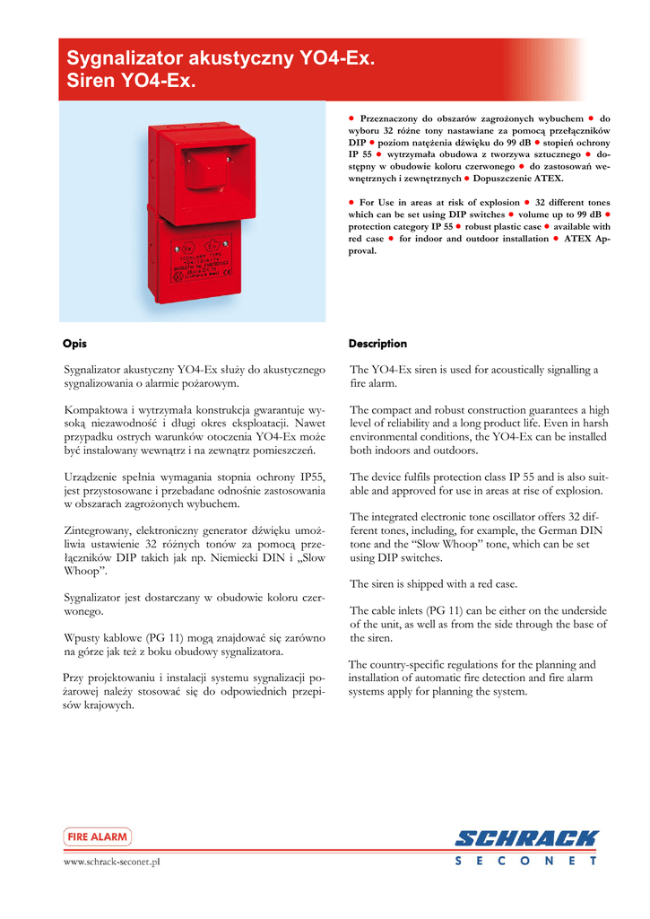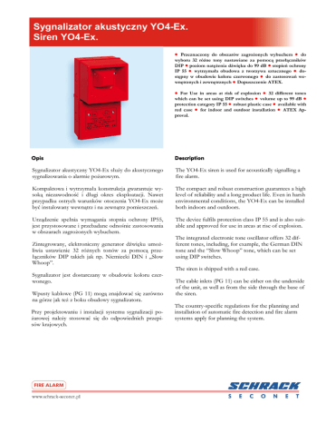 Sygnalizator akustyczny YO4-Ex. Siren YO4-Ex. Przeznaczony do obszarów zagrożonych wybuchem do wyboru 32 różne tony nastawiane za pomocą przełączników DIP poziom natężenia dźwięku do 99 dB stopień ochrony IP 55 wytrzymała obudowa z tworzywa sztucznego dostępny w obudowie koloru czerwonego do zastosowań wewnętrznych i zewnętrznych Dopuszczenie ATEX. For Use in areas at risk of explosion 32 different tones which can be set using DIP switches volume up to 99 dB protection category IP 55 robust plastic case available with red case for indoor and outdoor installation ATEX Approval. Opis Description Sygnalizator akustyczny YO4-Ex służy do akustycznego sygnalizowania o alarmie pożarowym. The YO4-Ex siren is used for acoustically signalling a fire alarm. Kompaktowa i wytrzymała konstrukcja gwarantuje wysoką niezawodność i długi okres eksploatacji. Nawet przypadku ostrych warunków otoczenia YO4-Ex może być instalowany wewnątrz i na zewnątrz pomieszczeń. The compact and robust construction guarantees a high level of reliability and a long product life. Even in harsh environmental conditions, the YO4-Ex can be installed both indoors and outdoors. Urządzenie spełnia wymagania stopnia ochrony IP55, jest przystosowane i przebadane odnośnie zastosowania w obszarach zagrożonych wybuchem. The device fulfils protection class IP 55 and is also suitable and approved for use in areas at rise of explosion. Zintegrowany, elektroniczny generator dźwięku umożliwia ustawienie 32 różnych tonów za pomocą przełączników DIP takich jak np. Niemiecki DIN i „Slow Whoop”. Sygnalizator jest dostarczany w obudowie koloru czerwonego. Wpusty kablowe (PG 11) mogą znajdować się zarówno na górze jak też z boku obudowy sygnalizatora. Przy projektowaniu i instalacji systemu sygnalizacji pożarowej należy stosować się do odpowiednich przepisów krajowych. The integrated electronic tone oscillator offers 32 different tones, including, for example, the German DIN tone and the “Slow Whoop” tone, which can be set using DIP switches. The siren is shipped with a red case. The cable inlets (PG 11) can be either on the underside of the unit, as well as from the side through the base of the siren. The country-specific regulations for the planning and installation of automatic fire detection and fire alarm systems apply for planning the system. Technical data Napięcie robocze: 24 VDC (przez barierę Zenera) Prąd alarmowy: 23 mA Poziom natężenia dźwięku: 99 dB dla 1 m Częstotliwość sygnału: 800 do 1000 Hz Podłączenie: zaciski śrubowe, maks. 1,5 mm² Stopień ochrony: IP 55 Temperatura otoczenia: -25° do +40°C Obudowa: czerwona Wymiary: 180 x 90 x 81 mm Waga: 430 g Ochrona przeciwwybuchowa: EEx ia IIC T4 Dopuszczenie: BAS 02 ATEX 1190 X Operating voltage: Alarm current: Volume: Signal frequency: Connection: Protection class: Ambient temperature: Case: Dimensions: Weight: Ignition protection class: Approval: 24 VDC (via Zener barrier) 23mA 99 dB @ 1 m 800 to 1000 Hz screw terminals, max. 1.5 mm² IP 55 -25° to +40°C red 180 x 90 x 81 mm 430 g EEx ia IIC T4 BAS 02 ATEX 1190 X © Schrack Productions – B-DB0074DE-EN - YO4-Ex - V1.0 - 02.2009 Zmiany techniczne zastrzeżone - subject to technical modifications Dane techniczne Szczegółowe informacje są dostępne w dokumentacji technicznej. Further informations can be obtained from the technical documentation. Sygnalizator akustyczny YO4-Ex. Siren YO4-Ex.