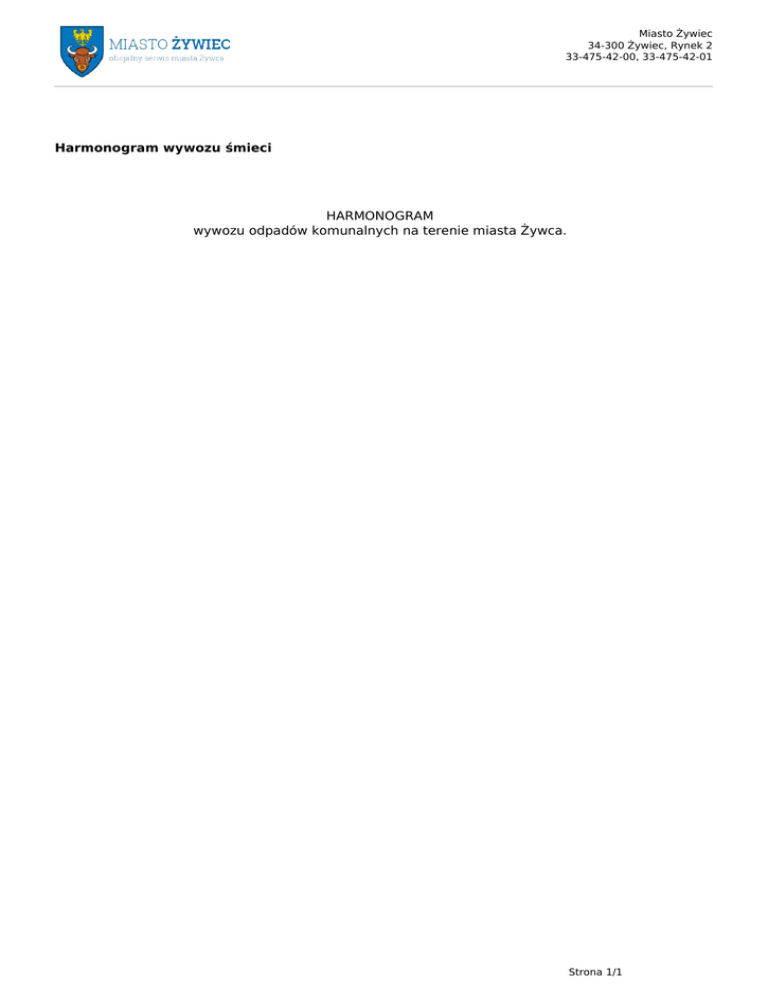 Miasto Żywiec 34-300 Żywiec, Rynek 2 33-475-42-00, 33-475-42-01 Harmonogram wywozu śmieci HARMONOGRAM wywozu odpadów komunalnych na terenie miasta Żywca. Strona 1/1 Powered by TCPDF (www.tcpdf.org)