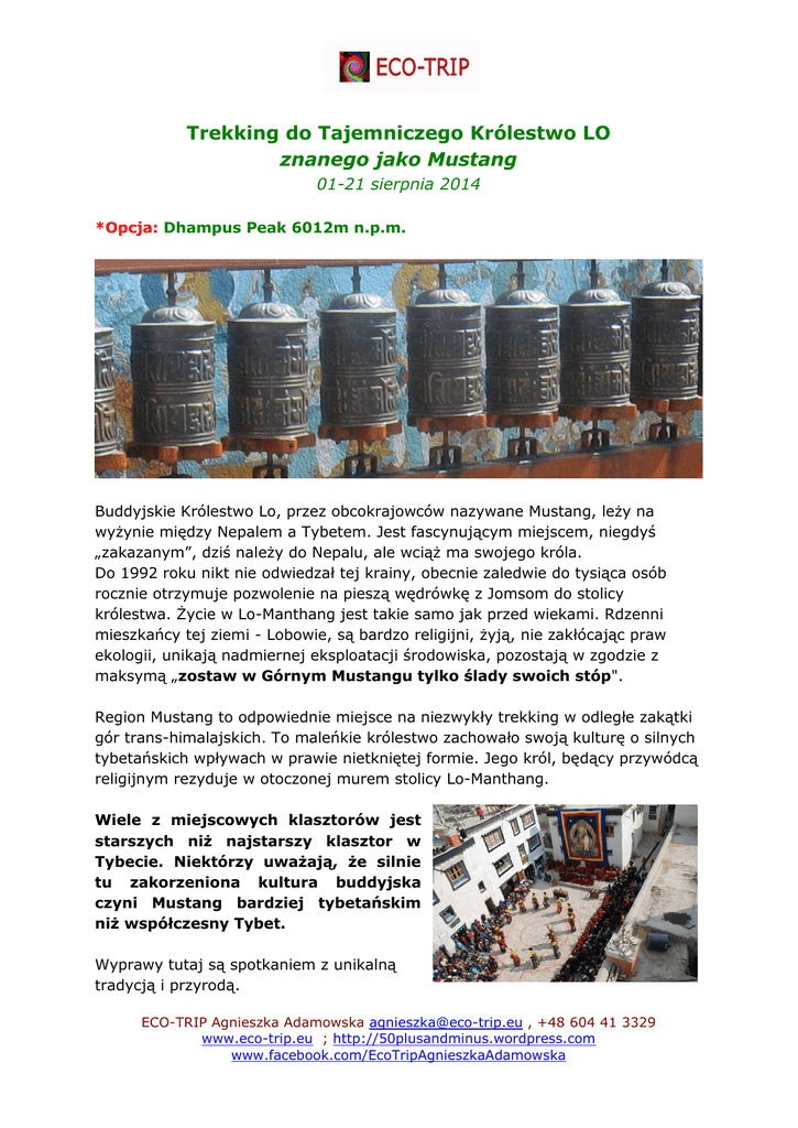 Trekking do Tajemniczego Królestwo LO znanego jako Mustang 01-21 sierpnia 2014 *Opcja: Dhampus Peak 6012m n.p.m. Buddyjskie Królestwo Lo, przez obcokrajowców nazywane Mustang, leży na wyżynie między Nepalem a Tybetem. Jest fascynującym miejscem, niegdyś „zakazanym”, dziś należy do Nepalu, ale wciąż ma swojego króla. Do 1992 roku nikt nie odwiedzał tej krainy, obecnie zaledwie do tysiąca osób rocznie otrzymuje pozwolenie na pieszą wędrówkę z Jomsom do stolicy królestwa. Życie w Lo-Manthang jest takie samo jak przed wiekami. Rdzenni mieszkańcy tej ziemi - Lobowie, są bardzo religijni, żyją, nie zakłócając praw ekologii, unikają nadmiernej eksploatacji środowiska, pozostają w zgodzie z maksymą „zostaw w Górnym Mustangu tylko ślady swoich stóp". Region Mustang to odpowiednie miejsce na niezwykły trekking w odległe zakątki gór trans-himalajskich. To maleńkie królestwo zachowało swoją kulturę o silnych tybetańskich wpływach w prawie nietkniętej formie. Jego król, będący przywódcą religijnym rezyduje w otoczonej murem stolicy Lo-Manthang. Wiele z miejscowych klasztorów jest starszych niż najstarszy klasztor w Tybecie. Niektórzy uważają, że silnie tu zakorzeniona kultura buddyjska czyni Mustang bardziej tybetańskim niż współczesny Tybet. Wyprawy tutaj są spotkaniem z unikalną tradycją i przyrodą. ECO-TRIP Agnieszka Adamowska [email protected] , +48 604 41 3329 www.eco-trip.eu ; http://50plusandminus.wordpress.com www.facebook.com/EcoTripAgnieszkaAdamowska Jest to prawdopodobnie ostatnia enklawa nieskażonego tybetańskiego świata. Będący w izolacji od reszty kraju, zamknięty długo dla turystów Mustang miał bowiem okazję wytworzyć własną niepowtarzalną i bogatą kulturę pozostając nadal „tajemniczym Królestwem LO”. Przelot liniami QATAR - przykład QR 260S WAW-DOH SS2 17:50 QR 648S DOH-KTM SS2 01:10 QR 647S KTM-DOH SS2 21:00 QR 261S DOH-WAW SS2 02:05 23:00 08:35 23:25 07:35 Ramowy program wyprawy: D 01: Przelot z Polski D 02: Przylot do Katmandu, zwiedzanie miasta (dla chętnych) D 03: Przelot do Pokhary, nocleg w hotelu D 04: Przelot do Jomsom, przejście do Kagbeni D 05: Trek do Chele , D 06: Trek to Syangmochen D 07: Trek do Dakmar D 08: Trek do Ghar Gompa D 09: Trek do tajemniczej stolicy królestwa Lo Manthang (3 810m n.p.m.) D 10: Lo Manthang Chokser, Chonup, Namgyal D 11: Pałac Królewski D 12: Trek do Yara D 13: Yara trek do Luri Gompa (4200m n.p.m.) i powrót Yara D 14: Trek do Tangye D 15: Trek do Tetang D 16: Trek do Muktinath* D 17: Trek do Jomsom D 18: Przelot do Pokhary i Katmandu D 19: Zakupy w Katmandu. D 20: Wieczorny lot do Polski D 21: Przylot do Polski ECO-TRIP Agnieszka Adamowska [email protected] , +48 604 41 3329 www.eco-trip.eu ; http://50plusandminus.wordpress.com www.facebook.com/EcoTripAgnieszkaAdamowska Opcja: Dhampus Peak 6 012m n.p.m. (dodatkowo płatne) D 16 Z Mukinath trek przez Kagbeni do Tukuche D 17 Treck do C1 4000m D 18 Trek do C2 4 900m D 19 Trek do C3 5 200m D 20 Dhampus Peak 6 012m n.p.m. i zejście do C2 D 21 C2 – Jomsom D 22 Jomsom – KTM D 23 Wieczorny lot do Polski D 24 Przylot do Polski Cena: Podana w USD (uzależniona jest od liczby osób) + koszt biletu (od 3000 do 4500PLN) 2 3 4 5 6 7 8 os. os. os. os. os. os. os. 3880USD 3300USD 3010USD 2830USD 2730USD 2640USD 2580USD Cena obejmuje: 3 noclegi w KTM, hotel B&B, 3*, na Thamelu w pok. 2 os. 2 noclegi w Pokharze w pok. 2 os. z łazienkami Wszystkie noclegi podczas trekkingu Pełne wyżywienie podczas trekkingu Pożegnalną kolację w KTM Lot KTM – Pokhara – Jomsom/Jomsom – Pokhara - KTM Tragarzy (po 15 kg na uczestnika) Przewodnika lokalnego Permit na trekking 500USD za pierwsze 10 dni i po 50USD za każdy następny dzień * Opłata za wejście do Parku Transport lotnisko-hotel-lotnisko Obowiązkowe ubezpieczenie obsługi nepalskiej Apteczka Telefon satelitarny GPS Polski pilot/organizator Wiza Nepalska 40USD Opłata lotniskowa ok. 15USD ECO-TRIP Agnieszka Adamowska [email protected] , +48 604 41 3329 www.eco-trip.eu ; http://50plusandminus.wordpress.com www.facebook.com/EcoTripAgnieszkaAdamowska *permity na wejście do Mustangu jest przyznawane 3000 os. rocznie – Agencja gwarantuje permit w terminie 01-21.08.2014 ECO-TRIP Agnieszka Adamowska [email protected] , +48 604 41 3329 www.eco-trip.eu ; http://50plusandminus.wordpress.com www.facebook.com/EcoTripAgnieszkaAdamowska