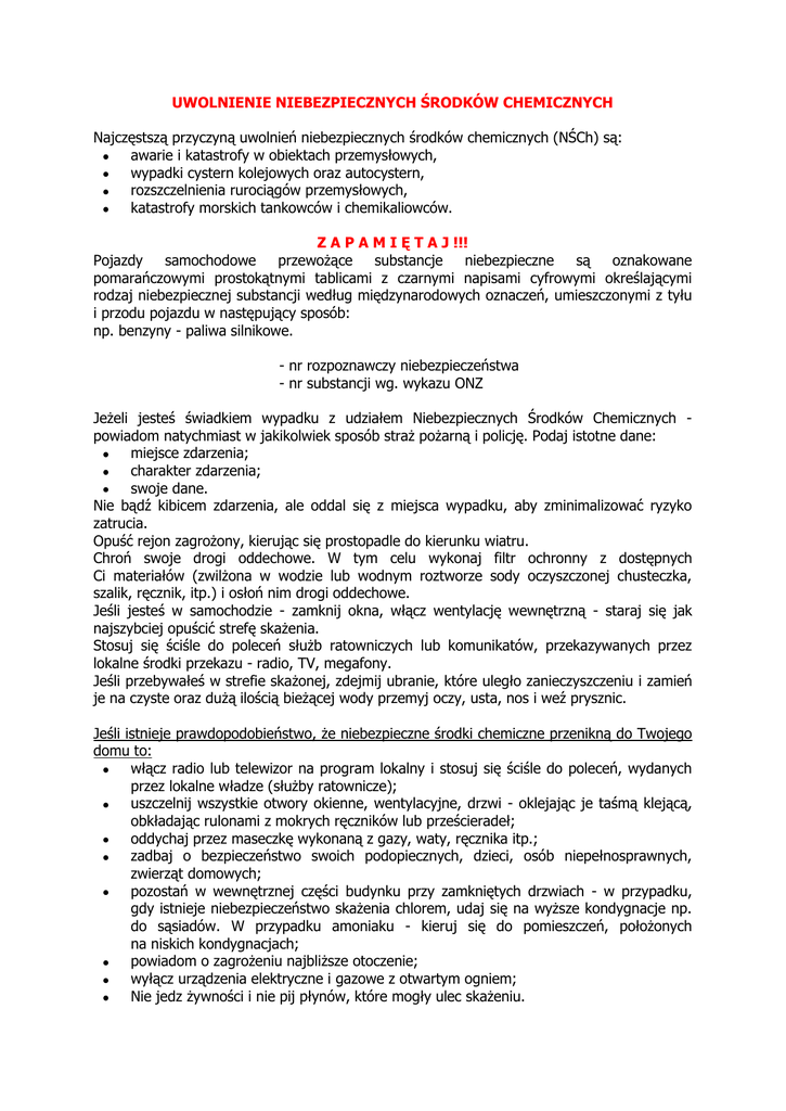 UWOLNIENIE NIEBEZPIECZNYCH ŚRODKÓW CHEMICZNYCH Najczęstszą przyczyną uwolnień niebezpiecznych środków chemicznych (NŚCh) są: awarie i katastrofy w obiektach przemysłowych, wypadki cystern kolejowych oraz autocystern, rozszczelnienia rurociągów przemysłowych, katastrofy morskich tankowców i chemikaliowców. Z A P A M I Ę T A J !!! Pojazdy samochodowe przewożące substancje niebezpieczne są oznakowane pomarańczowymi prostokątnymi tablicami z czarnymi napisami cyfrowymi określającymi rodzaj niebezpiecznej substancji według międzynarodowych oznaczeń, umieszczonymi z tyłu i przodu pojazdu w następujący sposób: np. benzyny - paliwa silnikowe. - nr rozpoznawczy niebezpieczeństwa - nr substancji wg. wykazu ONZ Jeżeli jesteś świadkiem wypadku z udziałem Niebezpiecznych Środków Chemicznych powiadom natychmiast w jakikolwiek sposób straż pożarną i policję. Podaj istotne dane: miejsce zdarzenia; charakter zdarzenia; swoje dane. Nie bądź kibicem zdarzenia, ale oddal się z miejsca wypadku, aby zminimalizować ryzyko zatrucia. Opuść rejon zagrożony, kierując się prostopadle do kierunku wiatru. Chroń swoje drogi oddechowe. W tym celu wykonaj filtr ochronny z dostępnych Ci materiałów (zwilżona w wodzie lub wodnym roztworze sody oczyszczonej chusteczka, szalik, ręcznik, itp.) i osłoń nim drogi oddechowe. Jeśli jesteś w samochodzie - zamknij okna, włącz wentylację wewnętrzną - staraj się jak najszybciej opuścić strefę skażenia. Stosuj się ściśle do poleceń służb ratowniczych lub komunikatów, przekazywanych przez lokalne środki przekazu - radio, TV, megafony. Jeśli przebywałeś w strefie skażonej, zdejmij ubranie, które uległo zanieczyszczeniu i zamień je na czyste oraz dużą ilością bieżącej wody przemyj oczy, usta, nos i weź prysznic. Jeśli istnieje prawdopodobieństwo, że niebezpieczne środki chemiczne przenikną do Twojego domu to: włącz radio lub telewizor na program lokalny i stosuj się ściśle do poleceń, wydanych przez lokalne władze (służby ratownicze); uszczelnij wszystkie otwory okienne, wentylacyjne, drzwi - oklejając je taśmą klejącą, obkładając rulonami z mokrych ręczników lub prześcieradeł; oddychaj przez maseczkę wykonaną z gazy, waty, ręcznika itp.; zadbaj o bezpieczeństwo swoich podopiecznych, dzieci, osób niepełnosprawnych, zwierząt domowych; pozostań w wewnętrznej części budynku przy zamkniętych drzwiach - w przypadku, gdy istnieje niebezpieczeństwo skażenia chlorem, udaj się na wyższe kondygnacje np. do sąsiadów. W przypadku amoniaku - kieruj się do pomieszczeń, położonych na niskich kondygnacjach; powiadom o zagrożeniu najbliższe otoczenie; wyłącz urządzenia elektryczne i gazowe z otwartym ogniem; Nie jedz żywności i nie pij płynów, które mogły ulec skażeniu.