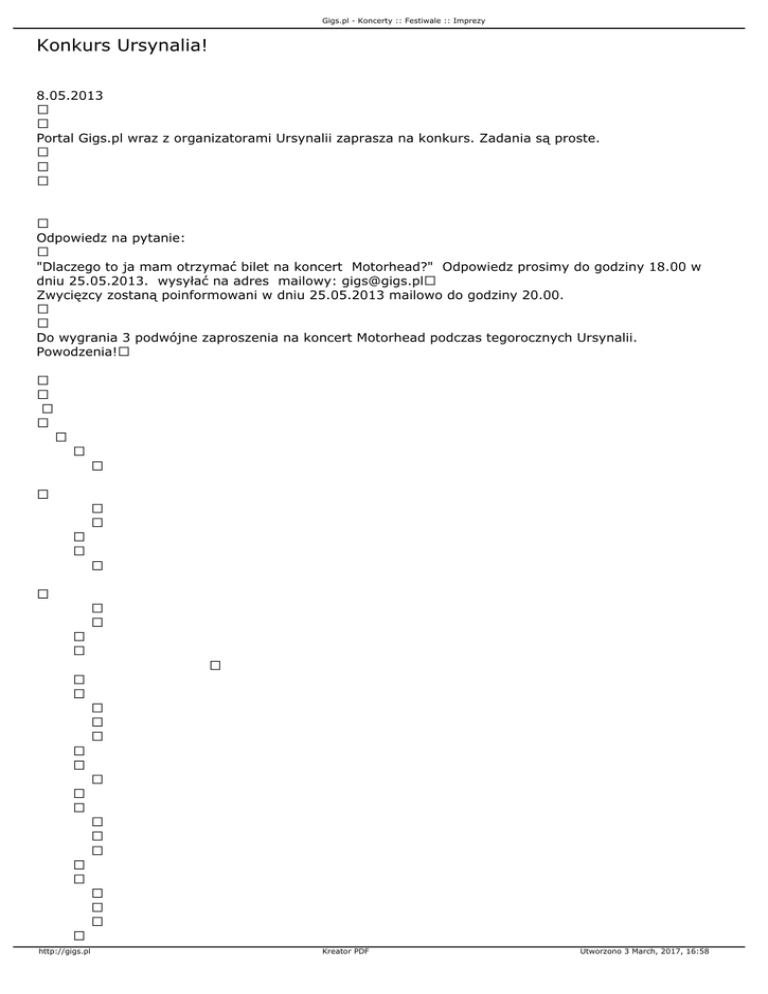 Gigs.pl - Koncerty :: Festiwale :: Imprezy Konkurs Ursynalia! 8.05.2013 Portal Gigs.pl wraz z organizatorami Ursynalii zaprasza na konkurs. Zadania są proste. Odpowiedz na pytanie: "Dlaczego to ja mam otrzymać bilet na koncert Motorhead?" Odpowiedz prosimy do godziny 18.00 w dniu 25.05.2013. wysyłać na adres mailowy: [email protected] Zwycięzcy zostaną poinformowani w dniu 25.05.2013 mailowo do godziny 20.00. Do wygrania 3 podwójne zaproszenia na koncert Motorhead podczas tegorocznych Ursynalii. Powodzenia! http://gigs.pl Kreator PDF Utworzono 3 March, 2017, 16:58 Gigs.pl - Koncerty :: Festiwale :: Imprezy http://gigs.pl Kreator PDF Utworzono 3 March, 2017, 16:58