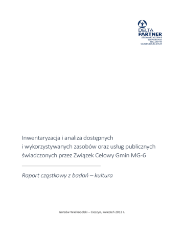 Inwentaryzacja i analiza dostępnych i wykorzystywanych zasobów oraz usług publicznych świadczonych przez Związek Celowy Gmin MG-6 Raport cząstkowy z badań – kultura Gorzów Wielkopolski – Cieszyn, kwiecień 2013 r. Projekt realizowany przez Związek Celowy Gmin MG-6 z siedzibą w Gorzowie Wlkp. ul. Sikorskiego 3-4 66-400 Gorzów Wlkp. Biuro Związku Celowego Gmin MG-6 Gorzów Wlkp., ul. Warszawska 6 tel.: 95 733 04 93/94, fax: 95 733 04 95 e-mail: [email protected], [email protected] http://www.zcg.net.pl Opracowanie merytoryczne Stowarzyszenie Wspierania Inicjatyw Gospodarczych DELTA PARTNER 43-400 Cieszyn, ul. Zamkowa 3a/1 tel./fax: +48 33 851 44 81 www.deltapartner.org.pl Gorzów Wielkopolski – Cieszyn – 2013 Projekt „Profesjonalizacja usług publicznych na terenie Związku Celowego Gmin MG-6 – poprzez diagnozę potrzeb społecznych i doskonalenie kompetencji kadr” jest współfinansowany ze środków Unii Europejskiej w ramach Programu Operacyjnego Pomoc Techniczna. Inwentaryzacja i analiza dostępnych i wykorzystywanych zasobów oraz usług publicznych świadczonych przez Związek Celowy Gmin MG-6 Spis treści 1. Wprowadzenie............................................................................................................................. 5 2. Sektor kultury .............................................................................................................................. 7 2.1. Zasoby i odbiorcy ............................................................................................................... 10 2.1.1. Analiza struktury instytucjonalnej usług publicznych w sektorze kultury................ 12 2.1.2. Zasoby materialne, infrastruktura i finanse............................................................... 23 2.1.3. Analiza zasobów ludzkich ........................................................................................... 26 2.2. Struktura zależności funkcjonalnych w obrębie MG-6 ..................................................... 28 2.3. Analiza efektywności systemu świadczenia usług publicznych w sektorze kultury ........ 29 2.4. Aktywność organizacji pozarządowych w sektorze kultury ............................................. 36 2.5. Dostępność informacji o kulturze...................................................................................... 37 Spis tabel ........................................................................................................................................ 40 Spis rysunków ................................................................................................................................ 41 Strona 3 Inwentaryzacja i analiza dostępnych i wykorzystywanych zasobów oraz usług publicznych świadczonych przez Związek Celowy Gmin MG-6 Strona 4 Inwentaryzacja i analiza dostępnych i wykorzystywanych zasobów oraz usług publicznych świadczonych przez Związek Celowy Gmin MG-6 1. Wprowadzenie Niniejsze opracowanie jest raportem cząstkowym w dziedzinie kultury, opracowanym w ramach projektu, pt. Profesjonalizacja usług publicznych na terenie Związku Celowego Gmin MG–6 – poprzez diagnozę potrzeb społecznych i doskonalenie kompetencji kadr. Podstawą opracowania były przeprowadzone w dniach 22-26 kwietnia 2013 r. wywiady pogłębione z ekspertami w dziedzinie kultury, wyznaczonymi przez samorządy Gorzowa Wielkopolskiego, Santoka, Lubiszyna, Bogdańca, Kłodawy i Deszczna. Strona 5 Inwentaryzacja i analiza dostępnych i wykorzystywanych zasobów oraz usług publicznych świadczonych przez Związek Celowy Gmin MG-6 Strona 6 Inwentaryzacja i analiza dostępnych i wykorzystywanych zasobów oraz usług publicznych świadczonych przez Związek Celowy Gmin MG-6 2. Sektor kultury Kultura należy do tego obszaru zadań samorządu, który wyraźnie pokazuje powiązania między miastem Gorzów Wielkopolski, a gminami sąsiednimi w ramach Związku Gmin MG-6. Miasto dysponuje dobrze rozwiniętą bazą kulturalną, z której chętnie korzystają mieszkańcy gmin tzw. pierścienia Gorzowa. Elementem sprzyjającym poprawie jakości i dostępności usług publicznych w dziedzinie kultury jest to, że każda z instytucji kultury chce przyciągnąć jak najwięcej uczestników podejmowanych przedsięwzięć lub imprez. Kamieniem milowym w rozwoju kultury w Gorzowie Wielkopolskim i MG-6 było utworzenie przy wsparciu Unii Europejskiej Centrum Edukacji Artystycznej - Filharmonia Gorzowska. Jest to nowoczesny bardzo funkcjonalny obiekt, który w sposób znaczący rozszerzył ofertę kulturalną zarówno miasta, jak i gmin należących do jego pierścienia. Można przyjąć, że usługi publiczne z dziedziny kultury na obszarze Związku Gmin MG-6 trafiają do licznego grona odbiorców (uczestników imprez, kół zainteresowań oraz czytelników w bibliotekach). Ich szacunkową łączną liczbę można określić na 157,1 tys. Do tej liczby należałoby dołożyć uczestników przedsięwzięć kulturalnych organizowanych przez urzędy gminy w Deszcznie, Bogdańcu (których nie ujmuje statystyka GUS). Biorąc pod uwagę fakt, że liczba mieszkańców obszaru MG-6 w 2011 roku wyniosła 162,7 tys. to udział mieszkańców w kulturze należy uznać za znaczny i wymagający stałego podnoszenia oferty i jakości. Miasto Gorzów Wielkopolski posiada jasną wizję rozwoju kultury wyrażonej w Strategii Rozwoju Kultury do 2020 roku. Jednocześnie boryka się z problemem zbyt dużej liczby instytucji kultury. Stan techniczny wielu obiektów kulturalnych jest bardzo zły, co stanowi przeszkodę w świadczeniu profesjonalnych usług publicznych w dziedzinie kultury. Prognozowany przez demografów systematyczny spadek liczby mieszkańców miasta samoistnie spowoduje konieczność większego otwarcia instytucji kultury na mieszkańców sąsiednich gmin. Przyczyni się to do wzmocnienie powiązań funkcjonalnych miasta z sąsiadującymi gminami wiejskimi. Jako, że głównymi bar