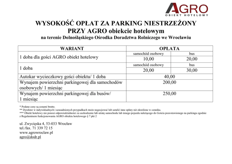 WYSOKOŚĆ OPŁAT ZA PARKING NIESTRZEŻONY PRZY AGRO obiekcie hotelowym na terenie Dolnośląskiego Ośrodka Doradztwa Rolniczego we Wrocławiu OPŁATA WARIANT 1 doba dla gości AGRO obiekt hotelowy 1 doba Autokar wycieczkowy gości obiektu/ 1 doba Wynajem powierzchni parkingowej dla samochodów osobowych/ 1 miesiąc Wynajem powierzchni parkingowej dla busów/ 1 miesiąc samochód osobowy bus 10,00 20,00 samochód osobowy bus 20,00 30,00 40,00 200,00 250,00 * Podane ceny są cenami brutto. ** Dyrektor w indywidualnych i uzasadnionych przypadkach może negocjować lub ustalić inne opłaty niż określone w cenniku. *** Obiekt hotelowy nie ponosi odpowiedzialności za uszkodzenie lub utratę samochodu lub innego pojazdu należącego do Gościa pozostawionego na parkingu zgodnie z Regulaminem funkcjonowania AGRO obiektu hotelowego § 7 pkt 2 ul. Zwycięska 4, 53-033 Wrocław tel./fax. 71 339 72 15 www.agrowroclaw.pl [email protected]