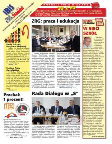 20 17 „S OL ID AR NO ŚC I” GO BI NS UL ZZ ET YN RE GI INF ON O R GD MA A C UT ŃSK YJN E I Y iB iS 20 z 24 dzienników wydawanych w miastach wojewódzkich (ponad 83 proc.) znajduje się w rękach Passauer Neue Presse (Verlagsgruppe Passau), do której należy „Dziennik Bałtycki” oraz 150 tygodników lokalnych. ZRG: praca i edukacja Naszym ZDANIEM IN TE RN ET OW Y sk. skr. skrót. NR 6 skróte. (309 skrótem ) 8 L WYDRUKUJ I WYWIEŚ W GABLOTCE! FOT. OLGA ZIELIŃSKA W SIECI SZKÓŁ Kupią Stocznię Marynarki Wojennej Fundusz Pracy do związków W Radzie Dialogu Społecznego powstał podzespół ds. reformy rynku pracy, by dokonać analizy polityki w zakresie rynku pracy już na wstępnym etapie, a nie gdy przepisy są praktycznie gotowe. Pojawiła się kwestia Funduszu Pracy. Związki zawodowe i pracodawcy chcieliby mieć wpływ na zarządzanie jego środkami. Więcej…>> Przekaż 1 procent! Serdecznie Państwa prosimy o przekazanie 1 procenta podatku dochodowego na rzecz Pomorskiej Fundacji Edukacji i Pracy, organizacji założonej przez Region Gdański NSZZ „Solidarność” i Związek Pracodawców Forum Okrętowe. Więcej na temat Fundacji można się dowiedzieć na: www.pomorskafundacja.org.pl KRS: 0000337122 Lutowe posiedzenie Zarządu Regionu Gdańskiego naszego Związku zdominowała sytuacja w poszczególnych zakładach pracy, m.in. w spółce Port Gdański Eksploatacja i w Operze Bałtyckiej. Informację dotyczącą tworzenia nowej sieci szkół przedstawił Wojciech Książek, przewodniczący gdańskiej oświatowej „S”. Zwrócił uwagę, że organy samorządu terytorialnego przekazują projekty uchwał do 17 lutego br. kuratorowi oświaty, a ten je opiniuje w ciągu 21 dni, nie później niż do 11 marca 2017 r. Podobnie związki zawodowe. Dr Waldemar Uziak przedstawił zmiany w prawie pracy. Członkowie Zarządu Regionu Gdańskiego NSZZ „S” 6 lutego br. przyjęli stanowisko w sprawie potwierdzenia przez krakowski instytut im. prof. Jana Sehna autentyczności podpisu pod zobowiązaniem do współpracy i rękopiśmiennych kart, sygnowanych przez TW „Bolek”, jako nakreślonych ręką Lecha Wałęsy. – Zarząd Regionu Gdańskiego NSZZ „Solidarność” z przykrością przyjmuje do wiadomości potwierdzenie przez ekspertów z Instytutu Ekspertyz Sądowych faktu współpracy Lecha Wałęsy z peerelowską „bezpieką” w latach siedemdziesiątych XX w. Szkoda, że w ciągu kilkudziesięciu lat pierwszy przewodniczący Zarządu Regionu Gdańskiego i Komisji Krajowej NSZZ „Solidarność” nie potrafił zmierzyć się ze swoją przeszłością – czytamy w przyjętym stanowisku. Stanowisko tutaj…>> Rada Dialogu w „S” FOT. ARTUR GÓRSKI Spółka PGZ Stocznia Wojenna z siedzibą w Radomiu powołana przez Polską Grupę Zbrojeniową złożyła ofertę zakupu Stoczni Marynarki Wojennej, będącej w upadłości likwidacyjnej od 2011 r. Propozycja opiewa na kwotę ceny wywoławczej 224 mln 909 tys. zł. Teraz czas na negocjacje umowy przedwstępnej. Więcej…>> Po raz pierwszy w gdańskiej siedzibie NSZZ „S” odbyło się zebranie prezydium Wojewódzkiej Rady Dialogu Społecznego, której pracom przewodzi w tym roku Krzysztof Dośla, przewodniczący ZRG z udziałem m.in. wojewody pomorskiego Dariusza Drelicha. Tematami była komunikacja publiczna, ze szczególnym uwzględnieniem połączeń SKM i będącej w gestii marszałka woj. pomorskiego infrastruktury PKM oraz stan bezpieczeństwa. Te tematy będą omawiane na lutowym posiedzeniu WRDS. Pojawiają się pytania, jak „Solidarność” ocenia sytuację w oświacie. Przypominamy, że sekcja gdańska w listopadzie 2016 r. przeprowadziła ankietę, z której wynikało, że nie było oczekiwania czynnych działań protestacyjnych. Stąd też rozpoczęliśmy proces spotkań, szkoleń, przygotowań do zmian, ale też przekazujemy na bieżąco opinie i uwagi zespołom pracującym nad projektami decyzji m. in. dotyczących podwyżek, statusu zawodowego, czasu pracy nauczycieli. Podczas najbliższej oświatowej rady sekcji gdańskiej 14 lutego br. będziemy szkolić się, z udziałem zaproszonych gości, z zasad, ale i z problemów, pojawiających się przy tworzeniu sieci szkolnej oraz zasad tworzenia arkuszy organizacji pracy szkoły na rok szkolny 2017/2018. To ważne, gdyż w obu tych sprawach struktury NSZZ „S” mają prawo do wyrażenia swej opinii. Kto podpisuje opinie związkowe w imieniu i które ze struktur NSZZ „S” są upoważnione prawnie do podpisywania opinii np. dotyczących projektów sieci szkół czy organizacji pracy szkoły? Mówiąc najkrócej, osobowość prawną mają komisje zakładowe i międzyzakładowe. Mają one stałą delegację na swoim terenie działania do podejmowania negocjacji, opiniowania, udziału w komisjach konkursowych wyłaniających dyrektorów. Mogą też przekazać te uprawnienia komisjom kół działających w szkołach i placówkach oświatowych „Solidarność” działa od prawie trzydziestu siedmiu lat. Staramy się, zgodnie z zaleceniem św. Augustyna, szanować sprawdzone w praktyce rozwiązania, nie tworzyć bytów, decyzji ponad niezbędne prawnie potrzeby. Wojciech Książek CYTAT tygodnia Dlaczego należę do „SOLIDARNOŚCI”? ZAPYTAJ prawnika KATARZYNA WALUSZKO, Wojewódzka Stacja Sanitarno-Epidemiologiczna w Gdańsku PLAN URLOPÓW HISTORIA tak było Gen. Józef Haller Helską liczył 140 kilometrów. Także 10 lutego, ale w 1926 r., Gdynia otrzymała prawa miejskie. Impulsem do rozwoju miasta była budowa portu, który powstał w celu zapewnienia Polsce dostępu do morskich szlaków i bazy Marynarki Wojennej RP wobec niepewnej sytuacji w Wolnym Mieście Gdańsku. Przeczytaj też o majorze „Łupaszce”...>> Ratujcie serce portu Związkowcy z Portu Gdańskiego Eksploatacji SA alarmują o dramatycznej sytuacji jednej ze strategicznych firm portowych. – My pracownicy Portu Gdańskiego Eksploatacji, głęboko zaniepokojeni sytuacją ekono