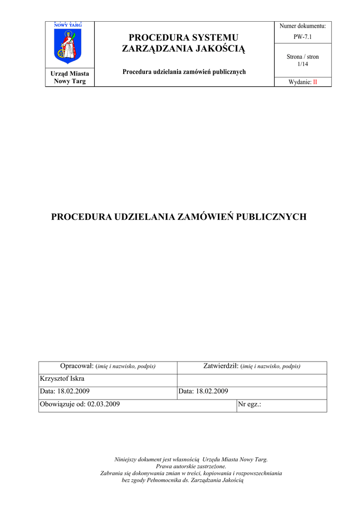 Numer dokumentu: PROCEDURA SYSTEMU ZARZĄDZANIA JAKOŚCIĄ PW-7.1 Strona / stron 1/14 Procedura udzielania zamówień publicznych Urząd Miasta Nowy Targ Wydanie: II PROCEDURA UDZIELANIA ZAMÓWIEŃ PUBLICZNYCH Opracował: (imię i nazwisko, podpis) Zatwierdził: (imię i nazwisko, podpis) Krzysztof Iskra Data: 18.02.2009 Data: 18.02.2009 Obowiązuje od: 02.03.2009 Nr egz.: Niniejszy dokument jest własnością Urzędu Miasta Nowy Targ. Prawa autorskie zastrzeŜone. Zabrania się dokonywania zmian w treści, kopiowania i rozpowszechniania bez zgody Pełnomocnika ds. Zarządzania Jakością Numer dokumentu: PROCEDURA SYSTEMU ZARZĄDZANIA JAKOŚCIĄ PW-7.1 Strona / stron 2/14 Procedura udzielania zamówień publicznych Urząd Miasta Nowy Targ Wydanie: II KARTA ZMIAN Lp. Wprowadzono Anulowano Data zmiany Wprowadzający zmianę ROZDZIELNIK Lp. Otrzymujący procedurę Nr egz. 1 2 3 4 5 Pełnomocnik ds. Zarządzania Jakością Burmistrz Miasta Audytor Wewnętrzny Radca Prawny Naczelnik Wydziału Organizacyjnego Naczelnik Wydziału Gospodarki Nieruchomościami i Planowania Przestrzennego Skarbnik Miasta Naczelnik Wydziału Rozwoju i Inwestycji Naczelnik Wydziału Gospodarki Komunalnej i Drogownictwa Naczelnik Wydziału Infrastruktury Społecznej i Promocji Naczelnik Wydziału Spraw Obywatelskich Naczelnik Wydziału Oświaty Kierownik Referatu ds. Ochrony Środowiska Kierownik Referatu Zamówień Publicznych Komendant StraŜy Miejskiej 1 2 3 4 5 6 7 8 9 10 11 12 13 14 15 Data otrzymania 6 7 8 9 10 11 12 13 14 15 Niniejszy dokument jest własnością Urzędu Miasta Nowy Targ. Prawa autorskie zastrzeŜone. Zabrania się dokonywania zmian w treści, kopiowania i rozpowszechniania bez zgody Pełnomocnika ds. Zarządzania Jakością Podpis Numer dokumentu: PROCEDURA SYSTEMU ZARZĄDZANIA JAKOŚCIĄ PW-7.1 Strona / stron 3/14 Urząd Miasta Nowy Targ 16 17 18 19 20 21 22 23 24 25 26 27 28 29 30 31 32 33 34 35 Procedura udzielania zamówień publicznych Kierownik Urzędu Stanu Cywilnego Dyrektor Miejskiego Ośrodka Kultury Dyrektor Miejskiej Biblioteki Publicznej Kierownik Ośrodka Pomocy Społecznej Dyrektor Zakładu Gospodarczego Zieleni i Rekreacji Kierownik Zakładu Gospodarki Mieszkaniowej Kierownik Miejskiego Zakładu Komunikacji Dyrektor Miejskiego Zakładu Wodociągów i Kanalizacji Dyrektor Zespołu Obsługi Ekonomicznej Szkół i Przedszkoli Dyrektor Przedszkola Nr 2 Dyrektor Przedszkola Nr 4 Dyrektor Szkoły Podstawowej Nr 2 im. Mikołaja Kopernika Dyrektor Szkoły Podstawowej Nr 3 im. Jana Pawła II Dyrektor Szkoły Podstawowej Nr 4 Dyrektor Szkoły Podstawowej Nr 5 im. Konfederacji Tatrzańskiej Dyrektor Szkoły Podstawowej Nr 6 im. Burmistrza Nowego Targu Józefa Rajskiego Dyrektor Szkoły Podstawowej Nr 10 Dyrektor Szkoły Podstawowej Nr 11 im. śołnierzy Armii Krajowej Dyrektor Gimnazjum Nr 1 im. Tadeusza Kościuszki Dyrektor Gimnazjum Nr 2 im. Kardynała Stefana Wyszyńskiego Wydanie: II 16 17 18 19 20 21 22 23 24 25 26 27 28 29 30 31 32 33 34 35 Niniejszy dokument jest własnością Urzędu Miasta Nowy Targ. Prawa autorskie zastrzeŜone. Zabrania się dokonywania zmian w treści, kopiowania i rozpowszechniania bez zgody Pełnomocnika ds. Zarządzania Jakością Numer dokumentu: PROCEDURA SYSTEMU ZARZĄDZANIA JAKOŚCIĄ PW-7.1 Strona / stron 4/14 Urząd Miasta Nowy Targ Procedura udzielania zamówień publicznych Wydanie: II SPIS TREŚCI 1. 2. 3. 4. 5. CEL I PRZEDMIOT PROCEDURY ..................................................................... 5 ZAKRES OBOWIĄZYWANIA ............................................................................ 5 TERMINOLOGIA I SKRÓTY ............................................................................... 5 WŁAŚCICIEL PROCEDURY................................................................................ 6 ODPOWIEDZIALNOŚĆ I KOMPETENCJE ...................................................... 6 5.1 5.2 5.3 5.4 5.5 5.6 6. 7. 8. 9. Burmistrz Miasta Nowy Targ jest odpowiedzialny za: ............................................... 6 Naczelnicy Wydziałów, Kierownicy Referatów są odpowiedzialni za: ..................... 7 Skarbnik miasta lub upowaŜniona osoba jest odpowiedzialny za:.............................. 7 Pracownicy merytoryczni są odpowiedzialni za: ........................................................ 7 Komisja Przetargowa jest odpowiedzialna za:............................................................ 7 Dyrektorzy i Kierownicy jednostek organizacyjnych są odpowiedzialni za: ............. 7 SZCZEGÓŁOWE ZASADY POSTĘPOWANIA. .............................................. 8 6.1 Ogólne zasady realizacji zamówień publicznych........................................................ 8 6.2 Zamówienia do 14 000 euro........................................................................................ 9 6.3 Sposób postępowania przy udzieleniu zamówień, których wartość nie przekracza 2 000 zł:....................................................................................................................... 9 6.4 Sposób postępowania przy udzieleniu zamówień, o wartości od 2000 zł do 14 000 euro: ..................................................................................................................................... 9 6.5 Obieg dokumentów związanych z postępowaniami o zamówienia publiczne których wartość szacunkowa przekracza wyraŜoną w złotych równowartość 14 000 euro... 10 6.6 Planowanie zamówień oraz sprawozdawczość ......................................................... 11 6.7 Umowy w sprawach zamówień publicznych ............................................................ 12 6.8 Nadzór i kontrola....................................................................................................... 13 6.9 Postanowienia końcowe ............................................................................................ 13 ZAPISY ...........................................