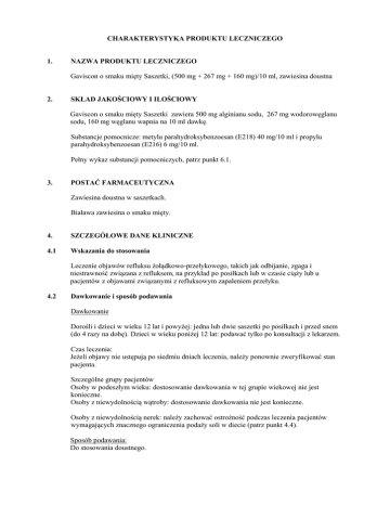 CHARAKTERYSTYKA PRODUKTU LECZNICZEGO 1. NAZWA PRODUKTU LECZNICZEGO Gaviscon o smaku mięty Saszetki, (500 mg + 267 mg + 160 mg)/10 ml, zawiesina doustna 2. SKŁAD JAKOŚCIOWY I ILOŚCIOWY Gaviscon o smaku mięty Saszetki zawiera 500 mg alginianu sodu, 267 mg wodorowęglanu sodu, 160 mg węglanu wapnia na 10 ml dawkę. Substancje pomocnicze: metylu parahydroksybenzoesan (E218) 40 mg/10 ml i propylu parahydroksybenzoesan (E216) 6 mg/10 ml. Pełny wykaz substancji pomocniczych, patrz punkt 6.1. 3. POSTAĆ FARMACEUTYCZNA Zawiesina doustna w saszetkach. Biaława zawiesina o smaku mięty. 4. SZCZEGÓŁOWE DANE KLINICZNE 4.1 Wskazania do stosowania Leczenie objawów refluksu żołądkowo-przełykowego, takich jak odbijanie, zgaga i niestrawność związana z refluksem, na przykład po posiłkach lub w czasie ciąży lub u pacjentów z objawami związanymi z refluksowym zapaleniem przełyku. 4.2 Dawkowanie i sposób podawania Dawkowanie Dorośli i dzieci w wieku 12 lat i powyżej: jedna lub dwie saszetki po posiłkach i przed snem (do 4 razy na dobę). Dzieci w wieku poniżej 12 lat: podawać tylko po konsultacji z lekarzem. Czas leczenia: Jeżeli objawy nie ustępują po siedmiu dniach leczenia, należy ponownie zweryfikować stan pacjenta. Szczególne grupy pacjentów Osoby w podeszłym wieku: dostosowanie dawkowania w tej grupie wiekowej nie jest konieczne. Osoby z niewydolnością wątroby: dostosowanie dawkowania nie jest konieczne. Osoby z niewydolnością nerek: należy zachować ostrożność podczas leczenia pacjentów wymagających znacznego ograniczenia podaży soli w diecie (patrz punkt 4.4). Sposób podawania: Do stosowania doustnego. 4.3 Przeciwwskazania Nadwrażliwość na alginian sodu, wodorowęglan sodu , węglan wapnia lub na którąkolwiek substancję pomocniczą wymienioną w punkcie 6.1., w tym metylu parahydroksybenzoesan (E218) i propylu parahydroksybenzoesan (E216) (patrz punkt 4.4). 4.4 Specjalne ostrzeżenia i środki ostrożności dotyczące stosowania Jeżeli objawy nie ustępują po siedmiu dniach leczenia, należy ponownie zweryfikować stan pacjenta. Zawartość sodu w jednej dawce 10 ml, w jednej saszetce wynosi 141 mg (6,2 mmol) sodu. Należy wziąć to pod uwagę przy stosowaniu u pacjentów wymagających znacznego ograniczenia podaży soli w diecie, np. w niektórych przypadkach zastoinowej niewydolności serca i niewydolności nerek. Każda dawka o objętości 10 ml zawiera 160 mg (1,6 mmol) węglanu wapnia. Należy zachować ostrożność podczas leczenia pacjentów z hiperkalcemią, wapnicą nerek i nawracającą kamicą nerkową z kamieniami zawierającymi wapń. Produkt leczniczy zawiera metylu parahydroksybenzoesan (E218) i propylu parahydroksybenzoesan (E216), które mogą powodować reakcje alergiczne (możliwe opóźnione). Stosowanie produktu leczniczego u dzieci w wieku poniżej 12 lat, patrz punkt 4.2. 4.5 Interakcje z innymi lekami i inne rodzaje interakcji Należy rozważyć zachowanie dwugodzinnego odstępu pomiędzy przyjęciem produktu leczniczego Gaviscon o smaku mięty Saszetki a podaniem innych produktów leczniczych, zwłaszcza tetracyklin, digoksyny, fluorochinolonów, soli żelaza, ketokonazolu, neuroleptyków, hormonów tarczycy, penicylaminy, beta- adrenolityków (atenololu, metoprololu, propranololu), glikokortykosteroidów, chlorochiny, estramustyny i bisfosfonianów (difosfonianów). Patrz też punkt 4.4. 4.6 Wpływ na płodność, ciążę i laktację Ciąża Dane otrzymane z badań klinicznych w udziałem ponad 500 kobiet w ciąży, a także z dużej ilości danych postmarketingowych nie wskazują, że substancje czynne wywołują wady rozwojowe lub działają szkodliwie na płód/noworodka. Gaviscon o smaku mięty może być stosowany podczas ciąży, jeśli wymaga tego stan kliniczny. Karmienie piersią Nie wykazano wpływu substancji czynnych na noworodki/dzieci karmione piersią przez matki, które przyjmowały lek. Produkt Gaviscon o smaku mięty może być stosowany podczas karmienia piersią. Płodność Badania niekliniczne wykazały, że alginian nie wykazuje toksycznego wpływu na rozród i rozwój potomstwa. Badania kliniczne nie wskazują, aby produkt Gaviscon o smaku mięty wpływał negatywnie na płodność. 4.7 Wpływ na zdolność prowadzenia pojazdów i obsługiwania maszyn Gaviscon o smaku mięty nie ma wpływu lub wywiera nieistotny wpływ na zdolność prowadzenia pojazdów i obsługiwania maszyn. 4.8 Działania niepożądane Działania niepożądane uszeregowano zgodnie z nastepujacą częstością: Bardzo rzadko (≤1/10 000) Zaburzenia układu oddechowego, klatki piersiowej i śródpiersia Zaburzenia układu immunologicznego Bardzo rzadko Zaburzenia oddechowe, takie jak skurcz oskrzeli Reakcje anafilaktyczne i anafilaktoidalne Bardzo rzadko Reakcje nadwrażliwości, takie jak pokrzywka Zgłaszanie podejrzewanych działań niepożądanych Po dopuszczeniu produktu leczniczego do obrotu istotne jest zgłaszanie podejrzewanych działań niepożądanych. Umożliwia to nieprzerwane monitorowanie stosunku korzyści do ryzyka stosowania produktu leczniczego. Osoby należące do fachowego personelu medycznego powinny zgłaszać wszelkie podejrzewane działania niepożądane za pośrednictwem Departamentu Monitorowania Niepożądanych Działań Produktów Leczniczych Urzędu Rejestracji Produktów Leczniczych, Wyrobów Medycznych i Produktów Biobójczych Al. Jerozolimskie 181C PL-02 222 Warszawa Tel.: + 48 22 49 21 301 Faks: + 48 22 49 21 309 e-mail: [email protected] 4.9 Przedawkowanie W wypadku przedawkowania, należy zastosować leczenie objawowe. Pacjent może odczuwać wzdęcie brzucha. 5. WŁAŚCIWOŚCI FARMAKOLOGICZNE Grupa farmakoterapeutyczna: Kod ATC: A02BX13. Inne leki stosowane w chorobie wrzodowej i chorobie refluksowej przełyku. 5.1 Właściwości farmakodynamiczne Po zażyciu produkt leczniczy reaguje natychmiast z kwasem solnym w żołądku tworząc warstwę alginianowego żelu o prawie obojętnym p