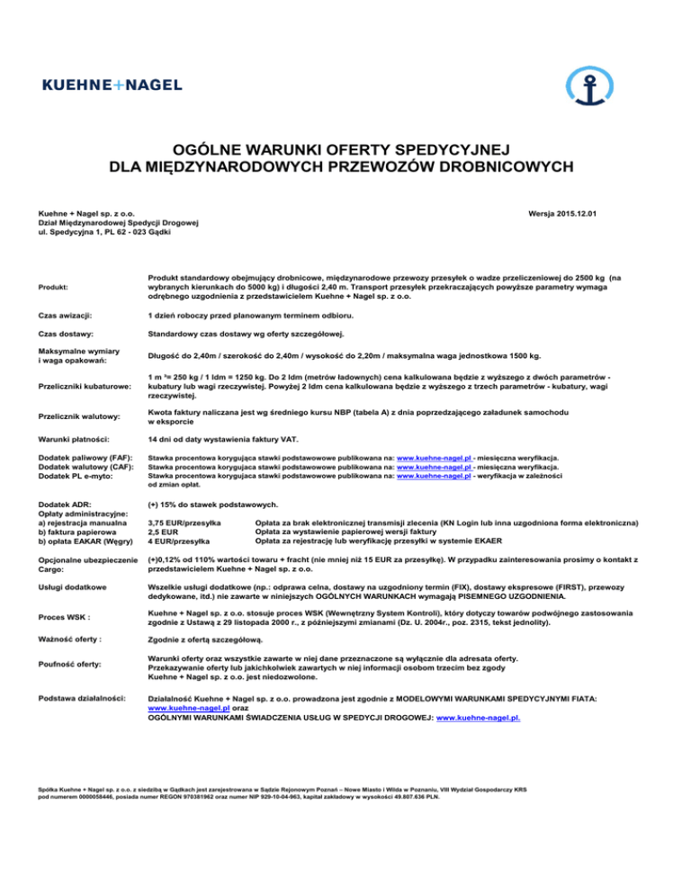 OGÓLNE WARUNKI OFERTY SPEDYCYJNEJ DLA MIĘDZYNARODOWYCH PRZEWOZÓW DROBNICOWYCH Kuehne + Nagel sp. z o.o. Dział Międzynarodowej Spedycji Drogowej ul. Spedycyjna 1, PL 62 - 023 Gądki Wersja 2015.12.01 Produkt: Produkt standardowy obejmujący drobnicowe, międzynarodowe przewozy przesyłek o wadze przeliczeniowej do 2500 kg (na wybranych kierunkach do 5000 kg) i długości 2,40 m. Transport przesyłek przekraczających powyższe parametry wymaga odrębnego uzgodnienia z przedstawicielem Kuehne + Nagel sp. z o.o. Czas awizacji: 1 dzień roboczy przed planowanym terminem odbioru. Czas dostawy: Standardowy czas dostawy wg oferty szczegółowej. Maksymalne wymiary i waga opakowań: Długość do 2,40m / szerokość do 2,40m / wysokość do 2,20m / maksymalna waga jednostkowa 1500 kg. Przeliczniki kubaturowe: 1 m ³= 250 kg / 1 ldm = 1250 kg. Do 2 ldm (metrów ładownych) cena kalkulowana będzie z wyższego z dwóch parametrów kubatury lub wagi rzeczywistej. Powyżej 2 ldm cena kalkulowana będzie z wyższego z trzech parametrów - kubatury, wagi rzeczywistej. Przelicznik walutowy: Kwota faktury naliczana jest wg średniego kursu NBP (tabela A) z dnia poprzedzającego załadunek samochodu w eksporcie Warunki płatności: 14 dni od daty wystawienia faktury VAT. Dodatek paliwowy (FAF): Dodatek walutowy (CAF): Dodatek PL e-myto: Stawka procentowa korygująca stawki podstawowowe publikowana na: www.kuehne-nagel.pl - miesięczna weryfikacja. Stawka procentowa korygujaca stawki podstawowowe publikowana na: www.kuehne-nagel.pl - miesięczna weryfikacja. Stawka procentowa korygujaca stawki podstawowowe publikowana na: www.kuehne-nagel.pl - weryfikacja w zależności od zmian opłat. Dodatek ADR: Opłaty administracyjne: a) rejestracja manualna b) faktura papierowa b) opłata EAKAR (Węgry) (+) 15% do stawek podstawowych. Opcjonalne ubezpieczenie Cargo: (+)0,12% od 110% wartości towaru + fracht (nie mniej niż 15 EUR za przesyłkę). W przypadku zainteresowania prosimy o kontakt z przedstawicielem Kuehne + Nagel sp. z o.o. Usługi dodatkowe Wszelkie usługi dodatkowe (np.: odprawa celna, dostawy na uzgodniony termin (FIX), dostawy ekspresowe (FIRST), przewozy dedykowane, itd.) nie zawarte w niniejszych OGÓLNYCH WARUNKACH wymagają PISEMNEGO UZGODNIENIA. 3,75 EUR/przesyłka 2,5 EUR 4 EUR/przesyłka Opłata za brak elektronicznej transmisji zlecenia (KN Login lub inna uzgodniona forma elektroniczna) Opłata za wystawienie papierowej wersji faktury Opłata za rejestrację lub weryfikację przesyłki w systemie EKAER Proces WSK : Kuehne + Nagel sp. z o.o. stosuje proces WSK (Wewnętrzny System Kontroli), który dotyczy towarów podwójnego zastosowania zgodnie z Ustawą z 29 listopada 2000 r., z późniejszymi zmianami (Dz. U. 2004r., poz. 2315, tekst jednolity). Ważność oferty : Zgodnie z ofertą szczegółową. Poufność oferty: Warunki oferty oraz wszystkie zawarte w niej dane przeznaczone są wyłącznie dla adresata oferty. Przekazywanie oferty lub jakichkolwiek zawartych w niej informacji osobom trzecim bez zgody Kuehne + Nagel sp. z o.o. jest niedozwolone. Podstawa działalności: Działalność Kuehne + Nagel sp. z o.o. prowadzona jest zgodnie z MODELOWYMI WARUNKAMI SPEDYCYJNYMI FIATA: www.kuehne-nagel.pl oraz OGÓLNYMI WARUNKAMI ŚWIADCZENIA USŁUG W SPEDYCJI DROGOWEJ: www.kuehne-nagel.pl. Spółka Kuehne + Nagel sp. z o.o. z siedzibą w Gądkach jest zarejestrowana w Sądzie Rejonowym Poznań – Nowe Miasto i Wilda w Poznaniu, VIII Wydział Gospodarczy KRS pod numerem 0000058446, posiada numer REGON 970381962 oraz numer NIP 929-10-04-963, kapitał zakładowy w wysokości 49.807.636 PLN.