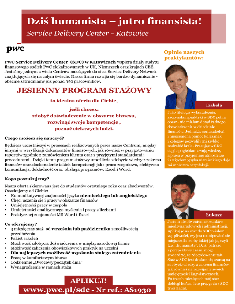 Dziś humanista – jutro finansista! Service Delivery Center - Katowice PwC Service Delivery Center (SDC) w Katowicach wspiera działy audytu finansowego spółek PwC zlokalizowanych w UK, Niemczech oraz krajach CEE. Jesteśmy jednym z wielu Centrów należących do sieci Service Delivery Network znajdujących się na całym świecie. Nasza firma rozwija się bardzo dynamicznie obecnie zatrudniamy już ponad 350 pracowników. Opinie naszych praktykantów: JESIENNY PROGRAM STAŻOWY to idealna oferta dla Ciebie, jeśli chcesz: zdobyć doświadczenie w obszarze biznesu, rozwinąć swoje kompetencje , poznać ciekawych ludzi. Czego możesz się nauczyć? Będziesz uczestniczyć w procesach realizowanych przez nasze Centrum, między innymi w weryfikacji dokumentów finansowych, jak również w przygotowaniu raportów zgodnie z zamówieniem klienta oraz z przyjętymi standardami i procedurami. Dzięki temu program stażowy umożliwia zdobycie wiedzy z zakresu finansów oraz doskonalenie takich kompetencji jak : praca zespołowa, efektywna komunikacja, dokładność oraz obsługa programów: Excel i Word. Izabela Jako filolog z wykształcenia, zaczynałam praktyki w SDC pełna obaw - nie miałam dotąd żadnego doświadczenia w dziedzinie finansów. Jednakże seria szkoleń i nieoceniona pomoc koleżanek i kolegów pozwoliły mi szybko nadrobić braki. Pracując w SDC ciągle pogłębiam swoją wiedzę, a praca w przyjemnej atmosferze i z użyciem języka niemieckiego daje mi mnóstwo satysfakcji. Kogo poszukujemy? Nasza oferta skierowana jest do studentów ostatniego roku oraz absolwentów. Oczekujemy od Ciebie: • Komunikatywnej znajomości języka niemieckiego lub angielskiego • Chęci uczenia się i pracy w obszarze finansów • Umiejętności pracy w zespole • Umiejętności analitycznego myślenia i pracy z liczbami • Praktycznej znajomości MS Word i Excel Co oferujemy? • 3 miesięczny staż od września lub października z możliwością przedłużenia • Pakiet szkoleń • Możliwość zdobycia doświadczenia w międzynarodowej firmie • Możliwość zaliczenia obowiązkowych praktyk na uczelni • Dla najlepszych możliwość uzyskania stałego zatrudnienia • Pracę w komfortowym biurze • Codziennie „Owocowy początek dnia” • Wynagrodzenie w ramach stażu APLIKUJ! www.pwc.pl/sdc - Nr ref.: AS1930 Łukasz Jestem absolwentem stosunków międzynarodowych i administracji. Aplikując na staż do SDC miałem wątpliwości, czy jest to odpowiednie miejsce dla osoby takiej jak ja, czyli tzw. „humanisty”. Dziś, patrząc z perspektywy czasu, mogę stwierdzić, że zdecydowanie tak. Staż w SDC jest doskonałą szansą na zdobycie wiedzy z zakresu finansów, jak również na rozwijanie swoich umiejętności lingwistycznych. Po trzech miesiącach mój staż dobiegł końca, lecz przygoda z SDC trwa nadal.