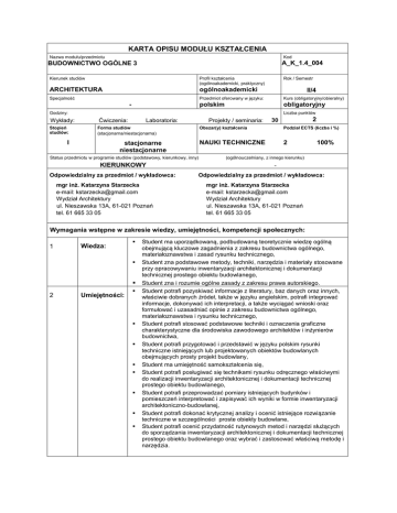 KARTA OPISU MODUŁU KSZTAŁCENIA Nazwa modułu/przedmiotu Kod BUDOWNICTWO OGÓLNE 3 A_K_1.4_004 Kierunek studiów Profil kształcenia (ogólnoakademicki, praktyczny) ARCHITEKTURA ogólnoakademicki Specjalność - Rok / Semestr II/4 Przedmiot oferowany w języku: Kurs (obligatoryjny/obieralny) polskim obligatoryjny Liczba punktów Godziny: Wykłady: Ćwiczenia: Stopień studiów: Forma studiów (stacjonarna/niestacjonarna) I Laboratoria: Projekty / seminaria: stacjonarne niestacjonarne Status przedmiotu w programie studiów (podstawowy, kierunkowy, inny) KIERUNKOWY Odpowiedzialny za przedmiot / wykładowca: mgr inż. Katarzyna Starzecka e-mail: [email protected] Wydział Architektury ul. Nieszawska 13A, 61-021 Poznań tel. 61 665 33 05 2 30 Obszar(y) kształcenia Podział ECTS (liczba i %) NAUKI TECHNICZNE 2 100% (ogólnouczelniany, z innego kierunku) Odpowiedzialny za przedmiot / wykładowca: mgr inż. Katarzyna Starzecka e-mail: [email protected] Wydział Architektury ul. Nieszawska 13A, 61-021 Poznań tel. 61 665 33 05 Wymagania wstępne w zakresie wiedzy, umiejętności, kompetencji społecznych: 1 Wiedza: 2 Umiejętności: Student ma uporządkowaną, podbudowaną teoretycznie wiedzę ogólną obejmującą kluczowe zagadnienia z zakresu budownictwa ogólnego, materiałoznawstwa i zasad rysunku technicznego, Student zna podstawowe metody, techniki, narzędzia i materiały stosowane przy opracowywaniu inwentaryzacji architektonicznej i dokumentacji technicznej prostego obiektu budowlanego, Student zna i rozumie ogólne zasady z zakresu prawa autorskiego. Student potrafi pozyskiwać informacje z literatury, baz danych oraz innych, właściwie dobranych źródeł, także w języku angielskim, potrafi integrować informacje, dokonywać ich interpretacji, a także wyciągać wnioski oraz formułować i uzasadniać opinie z zakresu budownictwa ogólnego, materiałoznawstwa i rysunku technicznego, Student potrafi stosować podstawowe techniki i oznaczenia graficzne charakterystyczne dla środowiska zawodowego architektów i inżynierów budownictwa, Student potrafi przygotować i przedstawić w języku polskim rysunki techniczne istniejących lub projektowanych obiektów budowlanych obejmujących prosty projekt budowlany, Student ma umiejętność samokształcenia się, Student potrafi posługiwać się technikami rysunku odręcznego właściwymi do realizacji inwentaryzacji architektonicznej i dokumentacji technicznej prostego obiektu budowlanego, Student potrafi przeprowadzać pomiary istniejących budynków i pomieszczeń interpretować i zapisywać ich wyniki w formie inwentaryzacji architektoniczno-budowlanej, Student potrafi dokonać krytycznej analizy i ocenić istniejące rozwiązanie techniczne w szczególności proste obiekty budowlane, Student potrafi ocenić przydatność rutynowych metod i narzędzi służących do sporządzania inwentaryzacji architektonicznej i dokumentacji technicznej prostego obiektu budowlanego oraz wybrać i zastosować właściwą metodę i narzędzia. Kompetencje społeczne 3 Student rozumie potrzebę uczenia się przez całe życie, potrafi inspirować i organizować proces uczenia się innych osób, Student potrafi odpowiednio określić priorytety służące realizacji inwentaryzacji architektonicznej i dokumentacji technicznej prostego obiektu budowlanego, Student potrafi identyfikować i rozstrzygać dylematy z zakresu tworzenia inwentaryzacji architektonicznej i dokumentacji technicznej prostego obiektu budowlanego. Cel przedmiotu: poznanie form i zakresów poszczególnych faz procesu projektowego w kontekście ustawy Prawo budowlane, poznanie zasad opracowywania projektu budowlanego budynku jednorodzinnego, zastosowanie poznanych zasad dotyczących projektu budowlanego budynku jednorodzinnego w wykonywanej pracy, doskonalenie umiejętności sporządzania zestawień poszczególnych elementów budynku jednorodzinnego ze szczególnym uwzględnieniem tych, które wykonuje Architekt, poznanie tradycyjnych technologii budowlanych w praktyce projektowej, rozwinięcie posiadanej wiedzy na temat materiałów budowlanych. Efekty kształcenia Wiedza: W01 ma wiedzę w zakresie budownictwa ogólnego. AU1_W10 W02 ma wiedzę w zakresie podstaw ergonomii, prawa budowlanego, organizacji i ekonomiki procesu inwestycyjnego AU1_W11 Umiejętności: U01 U02 potrafi pozyskiwać informacje z literatury, baz danych oraz innych źródeł, polskoi anglojęzycznych, dokonywać ich interpretacji oraz wyciągać wnioski, formułować i uzasadniać opinie potrafi narysować i zwymiarować podstawowe elementy konstrukcyjne i budowlane w koncepcji architektonicznej i w projekcie techniczno-budowlanym AU1_U01 AU1_U10 Kompetencje społeczne: K01 K02 potrafi odpowiednio określić priorytety służące realizacji określonego przez siebie lub innych zadania; ma świadomość ważności zachowania w sposób profesjonalny; ma świadomość odpowiedzialności za wspólnie realizowane zadania, związaną z pracą zespołową ma świadomość wagi zagadnień podejmowanych przez architekta i związanej z nimi odpowiedzialności za podejmowane działania AU1_K06 AU1_K08 Sposoby sprawdzenia efektów kształcenia Warunki zaliczenia i sposób oceny projektów: Istotnym kryterium oceny projektów jest: znajomość zasad rysunku technicznego niezbędnych do opracowania dokumentacji budowlanej budynku jednorodzinnego, w tym zasad odwzorowania formy architektonicznej, opisywania i wymiarowania elementów dokumentacji, stosowania oznaczeń graficznych, zasad pisma technicznego znajomość elementów budynku jednorodzinnego ich nazewnictwa, zasad kształtowania i projektowania znajomość tradycyjnych technologii i materiałów budowlanych ich właściwości i zakresu stosowania w budownictwie jednorodzinnym, znajomość formy i zakresu projektu budowlanego. umiejętność odwzorowania formy przestrzennej budynku jednorodzinnego w formie płaskich rysunków (rzuty, przekroje, elewacje, itd.), aksono