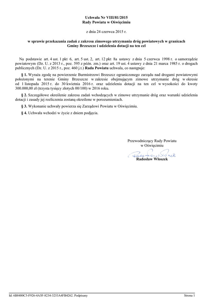 Uchwała Nr VIII/81/2015 Rady Powiatu w Oświęcimiu z dnia 24 czerwca 2015 r. w sprawie przekazania zadań z zakresu zimowego utrzymania dróg powiatowych w granicach Gminy Brzeszcze i udzielenia dotacji na ten cel Na podstawie art. 4 ust. 1 pkt 6, art. 5 ust. 2, art. 12 pkt 8a ustawy z dnia 5 czerwca 1998 r. o samorządzie powiatowym (Dz. U. z 2013 r., poz. 595 z późn. zm.) oraz art. 19 ust. 4 ustawy z dnia 21 marca 1985 r. o drogach publicznych (Dz. U. z 2015 r., poz. 460 j.t.) Rada Powiatu uchwala, co następuje: § 1. Wyraża zgodę na powierzenie Burmistrzowi Brzeszcz ograniczonego zarządu nad drogami powiatowymi położonymi na terenie Gminy Brzeszcze w zakresie obejmującym zimowe utrzymanie dróg w okresie od 1 listopada 2015 r. do 30 kwietnia 2016 r. oraz udzielenia dotacji na ten cel w wysokości do kwoty 300.000,00 zł (trzysta tysięcy złotych 00/100) w 2016 roku. § 2. Szczegółowe określenie zakresu zadań wchodzących w zimowe utrzymanie dróg oraz warunki udzielenia dotacji i zasady jej rozliczenia zostaną określone w porozumieniach. § 3. Wykonanie uchwały powierza się Zarządowi Powiatu w Oświęcimiu. § 4. Uchwała wchodzi w życie z dniem podjęcia. Przewodniczący Rady Powiatu w Oświęcimiu Radosław Włoszek Id: 6B8480C5-F926-4A5F-8234-3253A4FB4262. Podpisany Strona 1 Uzasadnienie Gmina Brzeszcze wyraziła wolę przejęcia wykonania zadania własnego powiatu w zakresie zimowego utrzymania dróg powiatowych położnych na terenie Gminy Brzeszcze w sezonie zimowym 2015/2016. Na podstawie art. 19 ust. 4 ustawy z dnia 21 marca 1985 r. o drogach publicznych (Dz. U. z 2015 r., poz. 460 j.t.) istnieje możliwość przekazania zarządzania drogami publicznymi między zarządcami w trybie porozumienia. W związku z powyższym podjęcie uchwały jest zasadne. Id: 6B8480C5-F926-4A5F-8234-3253A4FB4262. Podpisany Strona 1