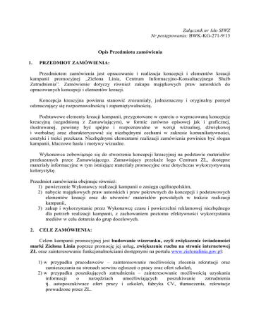 Załącznik nr 1do SIWZ Nr postępowania: BWK-KG-271-9/13 Opis Przedmiotu zamówienia 1. PRZEDMIOT ZAMÓWIENIA: Przedmiotem zamówienia jest opracowanie i realizacja koncepcji i elementów kreacji kampanii promocyjnej „Zielona Linia, Centrum Informacyjno-Konsultacyjnego Służb Zatrudnienia”. Zamówienie dotyczy również zakupu majątkowych praw autorskich do opracowanych koncepcji i elementów kreacji. Koncepcja kreacyjna powinna stanowić zrozumiały, jednoznaczny i oryginalny pomysł odznaczający się rozpoznawalnością i zapamiętywalnością. Podstawowe elementy kreacji kampanii, przygotowane w oparciu o wypracowaną koncepcję kreacyjną (uzgodnioną z Zamawiającym), w formie zarówno opisowej jak i graficznej, ilustrowanej, powinny być spójne i rozpoznawalne w wersji wizualnej, dźwiękowej i werbalnej oraz charakteryzować się niezbędnymi cechami w zakresie komunikatywności, estetyki i treści przekazu. Niezbędnymi elementami realizacji zamówienia powinien być slogan kampanii, kluczowe hasła i motywy wizualne. Wykonawca zobowiązuje się do stworzenia koncepcji kreacyjnej na podstawie materiałów przekazanych przez Zamawiającego. Zamawiający przekaże logo Centrum ZL, dostępne materiały informacyjne w tym istniejące materiały promocyjne oraz dotychczas wykorzystywaną kolorystykę. Przedmiot zamówienia obejmuje również: 1) powierzenie Wykonawcy realizacji kampanii o zasięgu ogólnopolskim, 2) nabycie majątkowych praw autorskich i praw pokrewnych do koncepcji i podstawowych elementów kreacji oraz do utworów/ materiałów powstałych w trakcie realizacji kampanii, 3) zakup i wykorzystanie przez Wykonawcę czasu i powierzchni reklamowej niezbędnego dla potrzeb realizacji kampanii, z zachowaniem poziomu efektywności wykorzystania mediów w celu dotarcia do grup docelowych. 2. CELE ZAMÓWIENIA: Celem kampanii promocyjnej jest budowanie wizerunku, czyli zwiększenie świadomości marki Zielona Linia poprzez promocję jej usług, zwiększenie ruchu na stronie internetowej ZL oraz zainteresowanie funkcjonalnościami dostępnymi na portalu www.zielonalinia.gov.pl: 1) w przypadku pracodawców – zainteresowanie możliwością zlecenia rekrutacji oraz zamieszczania na stronach serwisu ogłoszeń o pracy oraz ofert szkoleń, 2) w przypadku poszukujących zatrudnienia – zainteresowanie możliwością uzyskania informacji o narzędziach umożliwiających poszukiwanie zatrudnienia tj. autoposzukiwacz ofert pracy i szkoleń, fabryka CV, tłumaczenia, rekrutacje prowadzone przez ZL. Ponadto celem jest zwiększenie liczby kont i zamieszczanych informacji poprzez strefę dostępną dla zarejestrowanych użytkowników. Centrum Zielona Linia zakłada również osiągnięcie celu edukacyjnego i informacyjnego poprzez reklamę strony internetowej, która zawiera treści przydatne grupom odbiorców usług Zielonej Linii. 3. GRUPY DOCELOWE: W celu skutecznej i efektywnej promocji Zielonej Linii została przeprowadzona identyfikacja rynku docelowego. Na jej podstawie wyodrębniono trzy grupy docelowe, które mogłyby wykazywać zainteresowanie ofertą usług świadczonych przez Centrum. Kampania promocyjna, aby być bardziej efektywna, powinna zakładać promocję nie tyle samej marki „Zielona Linia”, ale usług świadczonych różnym grupom odbiorców. 1) Osoby bezrobotne, poszukujące pracy, a także osoby poszukujące informacji o usługach urzędu pracy i informacji nt. rynku pracy. Osobom bezrobotnym, Zielona Linia może zaoferować: a. oferty pracy, b. informacje o usługach oferowanych przez urzędy pracy (staże, prace subsydiowane oraz dofinansowania), c. informacje o świadczeniach przysługujących z urzędu pracy, d. informacje o szkoleniach finansowanych przez Unię Europejską, e. informacje o projektach unijnych, dotyczących wsparcia dla otwierających własną działalność gospodarczą, f. dostęp do funkcjonalności dostępnych z poziomu portalu www.zielonalinia.gov.pl dedykowanych osobom bezrobotnym oraz poszukującym pracy, tj. autoposzukiwacz ogłoszeń o pracy, ofert szkoleń, wiadomości regionów, czat, g. usługi realizowane przez Centrum, tj. pomoc w napisaniu CV, tłumaczenia CV na język angielski. 2) Pracodawcy szukający pracowników oraz informacji dotyczącej usług urzędów pracy i informacji o rynku pracy. Pracodawcom Zielona Linia może zaoferować: a. informacje nt. form wsparcia oferowanego przez urząd pracy (wyposażenia/doposażenia stanowiska, prac subsydiowanych, form wsparcia w przypadku zatrudniania osób niepełnosprawnych), b. wstępną rekrutację kandydatów do pracy, c. informacje o szkoleniach dofinansowanych przez Unię Europejską, d. dostęp do funkcjonalności dostępnych z poziomu portalu www.zielonalinia.gov.pl dedykowanych pracodawcom, tj. autoposzukiwacz pracowników, wiadomości regionów, czat, bezpłatne dodawanie ogłoszeń o pracy oraz ofert szkoleń. 3) Polacy planujący powrót do kraju Osobom powracającym do Polski, Zielona Linia może zaoferować: a. oferty pracy, b. oferty szkoleń, c. informacje o usługach i świadczeniach oferowanych przez urzędy pracy, d. informacje związane z procedurą powrotu do kraju e. dostęp do funkcjonalności dostępnych z poziomu portalu www.zielonalinia.gov.pl, tj. autoposzukiwacz ogłoszeń o pracy, ofert szkoleń, wiadomości regionów, czat, f. usługi realizowane przez Centrum, tj. pomoc w napisaniu CV, tłumaczenia CV na język angielski. 4. OPIS ZIELONEJ LINII: Centrum Informacyjno-Konsultacyjne Służb Zatrudnienia Komendy Głównej Ochotniczych Hufców Pracy „Zielona Linia” to pierwsza ogólnopolska infolinia publicznych służb zatrudnienia działająca pod numerem 19524 nastawiona na udzielanie pomocy osobom bezrobotnym, poszukującym pracy oraz pracodawcom. Jest to innowacyjne przedsięwzięcie, które powstało z myślą o ułatwieniu klientom kontaktów z powiatowymi urzędami pracy. ZL oferuje informacje na temat szkoleń, usług i instrumentó