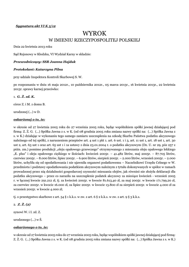 Sygnatura akt VI K 5/12 WYROK W IMIENIU RZECZYPOSPOLITEJ POLSKIEJ Dnia 22 kwietnia 2013 roku Sąd Rejonowy w Kłodzku, VI Wydział Karny w składzie: Przewodniczący: SSR Joanna Hajduk Protokolant: Katarzyna Pilna przy udziale Inspektora Kontroli Skarbowej S. W. po rozpoznaniu w dniu 16 maja 2012r., 10 października 2012r., 05 marca 2013r., 16 kwietnia 2013r., 22 kwietnia 2013r. sprawy karnej przeciwko: 1. G. Ż. zd. K. córce Z. i M. z domu B. urodzonej (...) w D. oskarżonej o to, że: w okresie od 27 kwietnia 2005 roku do 27 września 2005 roku, będąc wspólnikiem spółki jawnej działającej pod firmą: Z. Ż. G. (...) Spółka Jawna z s. w K. (od 08 grudnia 2005 roku zmiana nazwy spółki na: (...) Spółka Jawna z s. w K.) działając w wykonaniu tego samego zamiaru uszczuplenia na szkodę Skarbu Państwa podatku akcyzowego należnego od tej spółki, z naruszeniem przepisów art. 4 ust 1 pkt 1. art. 6 ust. 1 i 3, art. 11 ust 1, art. 18 ust 1, art. 30 ust 2, art. 63 ust 1 oraz art. 65 ust 1 i 1a ustawy z dnia 23.01.2004 r. o podatku akcyzowym (Dz. U. nr 29, póz 257 z późn. zm.) pomimo produkcji „oleju opałowego grzewczego" otrzymywanego z mieszania oleju opałowego lekkiego „E. plus" i oleju opałowego ciężkiego w ilościach: kwiecień 2005r. – 41.482 litrów, maj 2005r. – 87.705 litrów, czerwiec 2005r. – 8.000 litrów, lipiec 2005r. – 6.900 litrów, sierpień 2005r. – 2.000 litrów, wrzesień 2005r. – 2.000 litrów, uchyliła się od opodatkowania i nie ujawniła organowi podatkowemu – Naczelnikowi Urzędu Celnego w W. przedmiotu i podstawy opodatkowania podatkiem akcyzowym należnym z tytułu dokonywanych w spółce w ramach prowadzonej przez nią działalności gospodarczej czynności mieszania olejów, jak również nie złożyła deklaracji dla podatku akcyzowego – przez co naraziła na uszczuplenie podatek akcyzowy za miesiące kwiecień - wrzesień 2005 r. w łącznej kwocie 291.212 zł, tj. za kwiecień 2005r. w kwocie 81.613,40 zł, za maj 2005r. w kwocie 171.799,20 zł, za czerwiec 2005r. w kwocie 16.000 zł, za lipiec 2005r. w kwocie 13.800 zł za sierpień 2005r. w kwocie 4.000 zł za wrzesień 2005r. w kwocie 4.000 zł; tj. o przestępstwo skarbowe z art. 54 § 1 k.k.s. w zw. z art. 6 § 2 k.k.s. w zw. z art. 9 § 3 k.k.s. 2. Z. Ż. (2) synowi W. i I. zd. Z. urodzonego (...) w Ś. oskarżonego o to, że: w okresie od 27 kwietnia 2005 roku do 27 września 2005 roku, będąc wspólnikiem spółki jawnej działającej pod firmą: Z. Ż. G. (...) Spółka Jawna z s. w K. (od 08 grudnia 2005 roku zmiana nazwy spółki na: (...) Spółka Jawna z s. w K.) działając w wykonaniu tego samego zamiaru uszczuplenia na szkodę Skarbu Państwa podatku akcyzowego należnego od tej spółki, z naruszeniem przepisów art. 4 ust 1 pkt 1, art. 6 ust 1 i 3, art. 11 ust. 1, art. 18 ust 1., art. 30 ust 2, art. 63 ust 1 oraz art. 65 ust 1 i 1a ustawy z dnia 23.01.2004 r. o podatku akcyzowym (Dz.U.nr29 , póz 257 z późn. zm.) pomimo produkcji „oleju opałowego grzewczego" otrzymywanego z mieszania oleju opałowego lekkiego „E. plus" i oleju opałowego ciężkiego w ilościach: kwiecień 2005r. – 41.482 litrów, maj 2005r. – 87.705 litrów, czerwiec 2005r. – 8.000 litrów, lipiec 2005r. – 6.900 litrów, sierpień 2005r. – 2.000 litrów, wrzesień 2005r. – 2.000 litrów, uchyli się od opodatkowania i nie ujawnił organowi podatkowemu - Naczelnikowi Urzędu Celnego w W. przedmiotu i podstawy opodatkowania podatkiem akcyzowym należnym z tytułu dokonywanych w spółce w ramach prowadzonej przez niego działalności gospodarczej czynności mieszania olejów, jak również nie złożył deklaracji dla podatku akcyzowego – przez co naraził na uszczuplenie podatek akcyzowy za miesiące kwiecień - wrzesień 2005r. w łącznej kwocie 291.212 zł, tj. za kwiecień 2005r. w kwocie 81.613,40 zł, za maj 2005r. w kwocie 171.799,20 zł, za czerwiec 2005r. w kwocie 16.000 zł, za lipiec 2005r. w kwocie 13.800 zł, za sierpień 2005r. w kwocie 4.000 zł za wrzesień 2005r. w kwocie 4.000 zł; tj. o przestępstwo skarbowe z art. 54 § 1 k.k.s. w zw. z art. 6 § 2 k.k.s. w zw. z art. 9 § 3 k.k.s. 3. L. S. (1) synowi T. i I. zd. D. urodzonego (...) w L. oskarżonego o to, że: w okresie od 7 grudnia 2005r. do 28 maja 2005r. w K., będąc wspólnikiem spółki jawnej p.n. (...) W. K. (1) z s. w K. ul. (...), z naruszeniem przepisów art. 86 ust 2 pkt 1 i 2 ustawy z dnia 11 marca 2004r. o podatku od towarów i usług ( Dz. U. nr 54, poz.535 z późn. zm.), § 25 Rozporządzenia Ministra Finansów z dnia 27 kwietnia 2004r. w sprawie zwrotu podatku niektórym podatnikom, zaliczkowego zwrotu podatku, wystawiania faktur, sposobu ich przechowywania oraz listy towarów i usług, do których nie mają zastosowania zwolnienia od podatku od towarów i usług ( Dz. U. nr 97 , póz. 971 z późn. zm.) nie przechowywał dokumentacji księgowej w/w. spółki , co polegało na utracie dokumentacji potwierdzającej prawo do rozliczania kwot podatku naliczonego VAT i nie podjęciu stosownych działań w celu odtworzenia tej dokumentacji, poprzez wystąpienie do kontrahentów o uzyskanie duplikatów utraconych dokumentów księgowych, jak również nie dokonał – wobec braku dokumentów księgowych uprawniających do odliczenia podatku VAT związanego z nabyciem towarów i usług - zmian w złożonych w Urzędzie Skarbowym w K. deklaracjach VAT-7 za miesiące styczeń -grudzień 2005 r. przez co naraził na uszczuplenie podatek od towarów i usług należny od tej spółki za miesiące styczeń – sierpień i październik 2005r. w łącznej kwocie 368.211 zł, tj. za styczeń 2005r. w kwocie 36.400 zł, za luty 2005r. w kwocie 39.933 zł, za marzec 2005r. kwocie 67.323 zł, za kwiecień 2005r. w kwocie 77.796 zł, za maj 2005r. w kwocie 38.407 zł, za czerwiec 2005r. w kwocie 61.349 zł, za lipiec 2005r. w kwocie 32.672 zł., za sierpień 2005r. w kwocie 12.666 zł, za pa