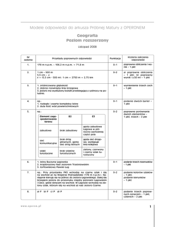 Modele odpowiedzi do arkusza Próbnej Matury z OPERONEM Geografia Poziom rozszerzony Listopad 2008 Nr zadania Przyk∏ady poprawnych odpowiedzi Punktacja Kryteria zaliczenia odpowiedzi 1. 178 m n.p.m. – 106,2 m n.p.m. = 71,8 m 0–1 poprawne obliczenia i wynik – 1 pkt 2. 1 cm – 500 m 5,5 cm – x x = (5,5 cm • 500 m): 1 cm = 2750 m = 2,75 km 0–2 a) poprawne obliczenia – 1 pkt; b) poprawny wynik (±50 m) – 1 pkt 3. 1. zró˝nicowana g∏´bokoÊç 2. dobrze rozwini´ta linia brzegowa 3. jezioro ma wyd∏u˝ony kszta∏t przebiegajàcy z pó∏nocy na po∏udnie. 0–1 wymienienie trzech cech – 1 pkt 4. np.: 1. rozleg∏e i zwarte kompleksy leÊne 2. du˝a iloÊç wód powierzchniowych 0–1 podanie dwóch barier – 1 pkt 5. np.: 0–2 poprawne porównanie dwóch elementów – 1 pkt, trzech – 2 pkt Element zagospodarowania terenu B2 E3 zabudowa brak zabudowy g´sta zabudowa ¸agowa w pó∏nocno-zachodniej cz´Êci pola sieç komunikacyjna brak dróg g∏ównych, g´sta sieç dróg leÊnych g´sta sieç drogowa, wyst´puje linia kolejowa szlaki turystyczne brak szlaków turystycznych zielony, czerwony i czarny szlak turystyczny 6. 1. leÊny Buczyna ¸agowska 2. krajobrazowy Nad Jeziorem TrzeÊniowskim 3. torfowiskowy Pawski ¸ug 0–1 podanie trzech rezerwatów – 1 pkt 7. np.: Przy przystanku PKS wchodz´ na czarny szlak i id´ na wschód a˝ na Wzgórze Poêrzadelskie (178 m n.p.m.). Nast´pnie kieruj´ si´ na pó∏noc do Jeziora ¸agowskiego. Dalej id´ brzegiem jeziora do przesmyku mi´dzy jeziorami ¸agowskim i Ciecz, gdzie skr´cam na wschód. W ¸agowie wchodz´ na zielony szlak, którym id´ na wschód a˝ nad Jezioro Czarne. 0–2 podanie kolorów szlaków – 1 pkt; podanie kierunków – 1 pkt 8. a) F b) F c) P d) P 0–2 podanie trzech poprawnych oznaczeƒ – 1 pkt; czterech – 2 pkt w w w. o p e r o n . p l 1 Geografia. Poziom rozszerzony Próbna Matura z OPERONEM i „Gazetà Wyborczà” Nr zadania 9. 10. Przyk∏ady poprawnych odpowiedzi Punktacja Kryteria zaliczenia odpowiedzi podkreÊlone: a 0–1 poprawne podkreÊlenie – 1 pkt np.: piaski, ˝wiry, gliny 0–1 podanie dwóch przyk∏adów ska∏ – 1 pkt 0–2 za trzy poprawne przyk∏ady – 1 pkt; wszystkie – 2 pkt 0–2 za ka˝dy rozpoznany wulkan – po 1 pkt 0–2 poprawne podkreÊlenie trzech elementów – 1 pkt, wszystkich – 2 pkt 0–2 poprawne wrysowanie strza∏ek – 1 pkt; poprawne wpisanie nazw wiatrów – 1 pkt 11. Sfera Ziemi Przyk∏ad wp∏ywu Litosfera wyst´powanie ska∏ i minera∏ów, z∏ó˝ mineralnych Atmosfera emisja du˝ej iloÊci py∏ów i gazów wulkanicznych Hydrosfera wyst´powanie goràcych êróde∏ i gejzerów Pedosfera gleby powsta∏e na wulkanicznym pod∏o˝u zapewniajà wysokie plony 12. a) Krakatau b) Wezuwiusz 13. podkreÊlone: a) rynna deflacyjna c) dolina U-kszta∏tna b) mogot d) pradolina 14. deszcze zenitalne pasaty pasaty 0° 23°27’S 23°27’N 15. 1. wys∏adzajàcy wp∏yw deszczów zenitalnych w okolicach równika 2. du˝e parowanie spowodowane suchoÊcià klimatu w okolicach zwrotników 0–1 podanie dwóch przyczyn – 1 pkt 16. po lewej stronie przekroju litera H, po prawej litera G 0–1 poprawne wpisanie liter – 1 pkt 17. a-B 0–2 poprawne przyporzàdkowanie trzech lub czterech typów – 1 pkt; wszystkich – 2 pkt 18. np.: korzyÊç: jest êród∏em po˝ywienia (ryby), stanowi element systemu komunikacyjnego, jest odnawialnym êród∏em energii ˝ywio∏: jest przyczynà niszczàcych kataklizmów (powodzie, tsunami itp.), przyczynia si´ do wyp∏ukiwania cennych elementów z gleby, falowanie powoduje proces abrazji (niszczenia brzegu morskiego) 0–2 za poprawne wype∏nienie kolumny – po 1 pkt w w w. o p e r o n . p l b-D c-E d-A e-F 2 Geografia. Poziom rozszerzony Próbna Matura z OPERONEM i „Gazetà Wyborczà” Nr zadania Kryteria zaliczenia odpowiedzi Przyk∏ady poprawnych odpowiedzi Punktacja 19. a) np.: paƒstwa wysoko rozwini´te gospodarczo majà dodatnie saldo migracji, s∏abo rozwini´te gospodarczo – ujemne b) np.: wartoÊç przyrostu rzeczywistego jest dodatnia i taka sama w obu krajach. W Iranie wynika to z wysokiej wartoÊci przyrostu naturalnego, który jest pomniejszony o ujemnà wartoÊç salda migracji. W Australii niska wartoÊç przyrostu naturalnego jest powi´kszona o dodatnià wartoÊç salda migracji. 0–2 a) poprawne sformu∏owanie wniosku – 1 pkt; b) wskazanie na taki sam przyrost rzeczywisty oraz podanie ró˝nic w przyroÊcie naturalnym i salda migracji – 1 pkt 20. a-C 0–1 poprawne przyporzàdkowanie wszystkich – 1 pkt 21. Bu∏garia i Rumunia, Turcja 0–1 podanie wszystkich – 1 pkt 22. skreÊlone kolejno: 0–10; liczba rozwodów na 100 osób; wskaênik urbanizacji; majàtek narodowy w USD; 8,1–10 0–2 poprawne skreÊlenie trzech – 1 pkt; czterech lub pi´ciu – 2 pkt 23. strony konfliktu: Rosja – Czeczenia przyczyny: np. ró˝nice religijne, kulturowe, dà˝enia niepodleg∏oÊciowe narodu czeczeƒskiego, nieuznanie przez Rosj´ niepodleg∏oÊci Czeczenii w 1991 r. oraz kontrola nad wydobyciem ropy naftowej i gazu to g∏ówne przyczyny wybuchu tego konfliktu. strony konfliktu: Afganistan – USA i koalicja paƒstw przyczyny: np. narastajàcy fundamentalizm islam- ski i utworzenie paƒstwa wyznaniowego, tworzenie baz terrorystycznych a w konsekwencji ataki terrorystyczne na Êwiecie (np.: w 2001 r. USA) doprowadzi∏y do inter- wencji USA i paƒstw koalicji. 0–2 poprawne wpisanie stron konfliktów – 1 pkt; podanie poprawnych przyczyn – 1 pkt b-A c-B d-E 0 1000 km 24. a) najwi´kszy: ¸otwa, najmniejszy: Armenia b) nadba∏tyckie 0–2 poprawne wpisanie dwóch krajów – 1 pkt; wskazanie krajów nadba∏tyckich – 1 pkt 25. podkreÊlone: Liczba ludnoÊci Rosji si´ zmniejsza. uzasadnienie: Rosja ma ujemny przyrost naturalny (od 1992 r.), który wynika z g∏´bokich przemian spo∏eczno-gospodarczych. 0–2 podkreÊlenie poprawnego zdania – 1 pkt; w uz