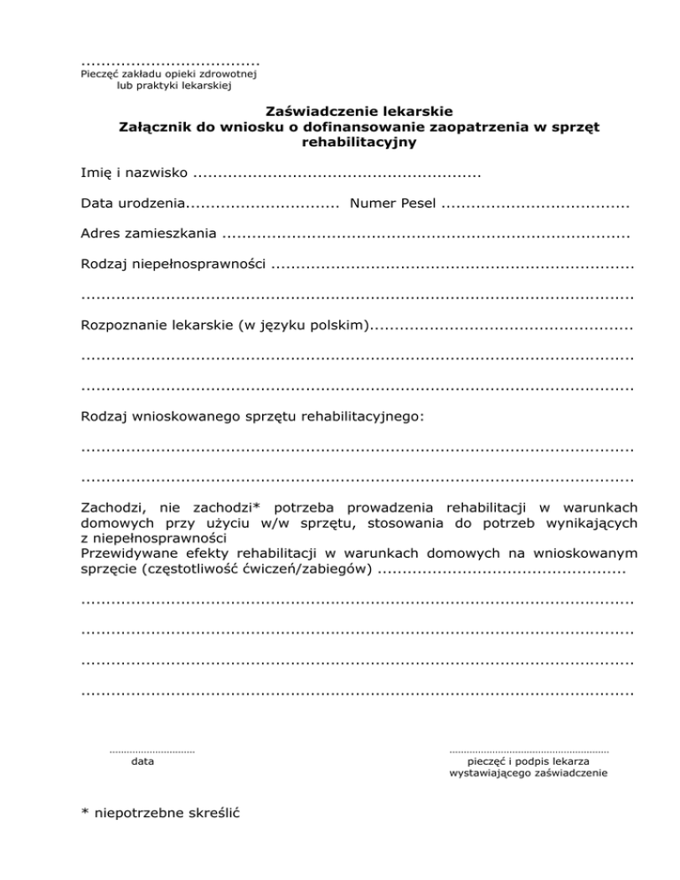 .................................... Pieczęć zakładu opieki zdrowotnej lub praktyki lekarskiej Zaświadczenie lekarskie Załącznik do wniosku o dofinansowanie zaopatrzenia w sprzęt rehabilitacyjny Imię i nazwisko .......................................................... Data urodzenia............................... Numer Pesel ...................................... Adres zamieszkania .................................................................................. Rodzaj niepełnosprawności ......................................................................... ............................................................................................................... Rozpoznanie lekarskie (w języku polskim)..................................................... ............................................................................................................... ............................................................................................................... Rodzaj wnioskowanego sprzętu rehabilitacyjnego: ............................................................................................................... ............................................................................................................... Zachodzi, nie zachodzi* potrzeba prowadzenia rehabilitacji w warunkach domowych przy użyciu w/w sprzętu, stosowania do potrzeb wynikających z niepełnosprawności Przewidywane efekty rehabilitacji w warunkach domowych na wnioskowanym sprzęcie (częstotliwość ćwiczeń/zabiegów) .................................................. ............................................................................................................... ............................................................................................................... ............................................................................................................... ............................................................................................................... .............................. data * niepotrzebne skreślić ........................................................ pieczęć i podpis lekarza wystawiającego zaświadczenie
