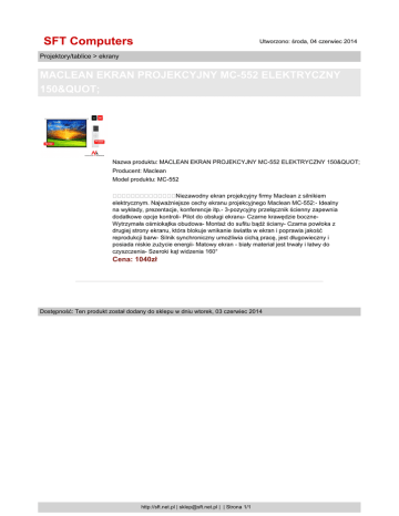 SFT Computers Utworzono: środa, 04 czerwiec 2014 Projektory/tablice > ekrany MACLEAN EKRAN PROJEKCYJNY MC-552 ELEKTRYCZNY 150" Nazwa produktu: MACLEAN EKRAN PROJEKCYJNY MC-552 ELEKTRYCZNY 150" Producent: Maclean Model produktu: MC-552 Niezawodny ekran projekcyjny firmy Maclean z silnikiem elektrycznym. Najważniejsze cechy ekranu projekcyjnego Maclean MC-552:- Idealny na wykłady, prezentacje, konferencje itp.- 3-pozycyjny przełącznik ścienny zapewnia dodatkowe opcje kontroli- Pilot do obsługi ekranu- Czarne krawędzie boczneWytrzymała ośmiokątka obudowa- Montaż do sufitu bądź ściany- Czarna powłoka z drugiej strony ekranu, która blokuje wnikanie światła w ekran i poprawia jakość reprodukcji barw- Silnik synchroniczny umożliwia cichą pracę, jest długowieczny i posiada niskie zużycie energii- Matowy ekran - biały materiał jest trwały i łatwy do czyszczenia- Szeroki kąt widzenia 160° Cena: 1040zł Dostępność: Ten produkt został dodany do sklepu w dniu wtorek, 03 czerwiec 2014 http://sft.net.pl | [email protected] | | Strona 1/1
