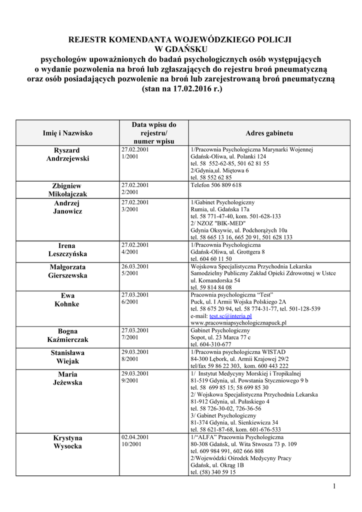 REJESTR KOMENDANTA WOJEWÓDZKIEGO POLICJI W GDAŃSKU psychologów upoważnionych do badań psychologicznych osób występujących o wydanie pozwolenia na broń lub zgłaszających do rejestru broń pneumatyczną oraz osób posiadających pozwolenie na broń lub zarejestrowaną broń pneumatyczną (stan na 17.02.2016 r.) Imię i Nazwisko Data wpisu do rejestru/ numer wpisu Ryszard Andrzejewski 27.02.2001 1/2001 Zbigniew Mikołajczak Andrzej Janowicz 27.02.2001 2/2001 Irena Leszczyńska 27.02.2001 4/2001 Małgorzata Gierszewska 26.03.2001 5/2001 Ewa Kohnke 27.03.2001 6/2001 Bogna Kaźmierczak 27.03.2001 7/2001 Stanisława Wiejak 29.03.2001 8/2001 Maria Jeżewska 29.03.2001 9/2001 Krystyna Wysocka 02.04.2001 10/2001 27.02.2001 3/2001 Adres gabinetu 1/Pracownia Psychologiczna Marynarki Wojennej Gdańsk-Oliwa, ul. Polanki 124 tel. 58 552-62-85, 501 62 81 55 2/Gdynia,ul. Miętowa 6 tel. 58 552 62 85 Telefon 506 809 618 1/Gabinet Psychologiczny Rumia, ul. Gdańska 17a tel. 58 771-47-40, kom. 501-628-133 2/ NZOZ "BIK-MED" Gdynia Oksywie, ul. Podchorążych 10a tel. 58 665 13 16, 665 20 91, 501 628 133 1/Pracownia Psychologiczna Gdańsk-Oliwa, ul. Grottgera 8 tel. 604 60 11 50 Wojskowa Specjalistyczna Przychodnia Lekarska Samodzielny Publiczny Zakład Opieki Zdrowotnej w Ustce ul. Komandorska 54 tel. 59 814 84 08 Pracownia psychologiczna “Test” Puck, ul. I Armii Wojska Polskiego 2A tel. 58 675 20 94, tel. 58 774-31-77, tel. 501-128-539 e-mail: [email protected] www.pracowniapsychologicznapuck.pl Gabinet Psychologiczny Sopot, ul. 23 Marca 77 c tel. 604-310-677 1/Pracownia psychologiczna WISTAD 84-300 Lębork, ul. Armii Krajowej 29/2 tel/fax 59 86 22 303, kom. 600 443 222 1/ Instytut Medycyny Morskiej i Tropikalnej 81-519 Gdynia, ul. Powstania Styczniowego 9 b tel. 58 699 85 15; 58 699 85 30 2/ Wojskowa Specjalistyczna Przychodnia Lekarska 81-912 Gdynia, ul. Pułaskiego 4 tel. 58 726-30-02, 726-36-56 3/ Gabinet Psychologiczny 81-374 Gdynia, ul. Sienkiewicza 34 tel. 58 621-87-68, kom. 601-676-533 1/“ALFA” Pracownia Psychologiczna 80-308 Gdańsk, ul. Wita Stwosza 73 p. 109 tel. 609 984 991, 602 666 808 2/Wojewódzki Ośrodek Medycyny Pracy Gdańsk, ul. Okrąg 1B tel. (58) 340 59 15 1 Łucja Hewelt-Wojewódzka 05.04.2001 12/2001 Barbara Świderska Tadeusz Zieliński Agnieszka Sirant 17.04.2001 13/2001 Anna Wielikdzień Karolina Brejt 26.04.2001 17/2001 Wiesława Macugowska Maria Witkiewicz-Jezierska 13.09.2001 19/2001 Beata Szpakowska 13.12.2001 21/2001 Katarzyna Filimoniuk Marek Gałązka 27.12.2001 22/2001 Irena Ostrowicka-Cegielska 08.05.2002 2/2002 Izabela Kondracka Agata Wiktorska 03.07.2002 3/2002 Ewa Warwas-Moroz 23.03.2004 1/2004 1/81-355 Gdynia, ul. Wójta Radtkego 49/3 tel. (58) 663 73 70, kom.501 305 415 2/81-213 Gdynia, ul. Opata Hackiego 10B tel. (58) 733 01 55, kom. 501 385 415 3/84-240 Reda, ul Obwodowa 105 tel. 501 385 415 4/83-400 Kościerzyna, ul. Partyzantów 1 tel. 501 385 415 www.psycholog-badania.info Gdynia, ul. Traugutta 9 tel. 606 648 042 26.04.2001 15/2001 - 17.04.2001 16/2001 Lekarska Spółdzielnia Pracy Słupsk, Pl. Dąbrowskiego 6 tel. 59-842-17-58, kom. 601-057-542 Słupsk tel. 608 626 155 21.05.2001 18/2001 14.08.2001 20/2001 04.04.2002 1/2002 23.01.2003 1/2003 1/Pomorski Ośrodek Ruchu Drogowego Pracownia Psychologiczna 80-067 Gdańsk, ul. Równa 19/21 tel. 58 763 00 40 w. 49, 058 763 08 94 w. 49 2/Bezpieczeństwo Kapitał Zdrowie mgr Barbara Kaletha – Zys Pracownia Psychologiczna 81-366 Gdynia, ul. 10 Lutego 11 tel. 601 644 175, tel/fax 58 775 11 99 3/Dodatkowy kontakt: Centrala Centrum Medycznego POLMED S.A. tel. 58 699 20 50 77-300 Człuchów, ul. Wojska Polskiego 10/4 tel. 59-83-43-564, kom. 505 223 655 Euromedicus Sp.z o.o. Gdynia, ul. Czechosłowacka 3 pok. 309 tel. 58 660-81-88 1/Gabinet Psychologiczny 83-000 Pruszcz Gdański, ul. Chopina 34, I piętro tel. 58 773 02 95, kom. 602-361-648 2/Gabinet Psychologiczny 80-244 Gdańsk-Wrzeszcz, Al. Grunwaldzka 83/1 A, I piętro, kom. 602-361-648 Gdynia, ul. Królewiecka 4/3 tel. 58 661 24 01, 58 626 32 98, 501 761 876 1/ NZOZ " Centrum Psychiatrii" Malbork ul. Nowowiejskiego 48 tel. 55 272 38 69 lub 600 98 59 62 2/ 110 Szpital Wojskowy Poradnia Zdrowia Psychicznego Elbląg ul. Komeńskiego 35 tel. 55 239 45 08, 55 239 44 78 Gabinet Psychologiczny Gdańsk, ul. Węglarska 1/4 m. 17 (II p.) tel. 601-303-656 76-200 Słupsk, ul. Arciszewskiego 24/1 tel. 500 109 605 Wojskowa Specjalistyczna Przychodnia Lekarska SPZOZ ul. Komandorska 54, 76-271 Ustka tel. 59 81 51 239, 692 312 012 1/ Gabinet Psychologiczny Słupsk ul. Nowowiejska 3/40 tel. 660-722-804 2 Dorota Nasiłowska-Karpińska Agnieszka Goliszek Katarzyna Jaroni Barbara Walczak 15.04.2004 2/2004 2/ Niepubliczny Zakład Opieki Zdrowotnej Słupsk ul. Paderewskiego 9 tel. 59 840 20 01 Gdynia, ul Abrahama 2/1 tel. 501-628-177 02.11.2004 3/2004 Gdynia, ul. Rozewska 25/29 tel. 503-094-369 02.11.2004 4/2004 Gdynia, ul. Rozewska 25/29 tel. 502-564-647 07.02.2005 1/2005 Elżbieta Zakrzewska 08.03.2005 2/2005 Joanna Szewczyk 18.07.2005 3/2005 Aleksandra Nowakowska 10.08.2005 4/2005 Edyta Pliszka- Kuraszewicz 08.01.2006 1/2006 Anna Mitura 20.02.2006 2/2006 Wojciech Chodorowicz 25.09.2006 3/2006 Jakimiak Marta 09.10.2006 4/2006 Andrzej Krzysztof Pawelec 17.10.2006 5/2006 Wioletta Głowacka Anna Tondytko 04.01.2007 1/2007 Poradnia Psychologiczna ul. Polanki 113, Gdańsk-Oliwa tel. 501 346 542 1/ Zakład Opieki Zdrowotnej MSWiA w Gdańsku Poradnia Psychologiczna ul. Kartuska 4/6, 80-104 Gdańsk, tel. 58 309-82-73 1/Kolejowy Ośrodek Medycyny Pracy w Gdańsku z siedzibą w Sopocie 81-704 Sopot ul. Dworcowa 3 tel. 58 721 30 41 2/Bałtycka Akademia Umiejętności Sc 80-557 Gdańsk, ul. Marynarki Polskiej 15 tel. 58 343 77 22, 58 737 79 25, 668 420 565 Poradnia Psychologiczna Pomorskiego Ośrodka Ruchu Drogowego w Gdańsku ul. Równa 19/21, Gdańsk tel. 58 763-08-94, 58 763-00-40 w. 49 Szpital Dla Nerwowo i Psychicznie Chorych w Starogardzie Gdańskim ul. Skarszewska 7 tel. 668 