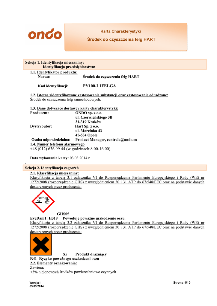 Karta Charakterystyki Środek do czyszczenia felg HART Sekcja 1. Identyfikacja mieszaniny: Identyfikacja przedsiębiorstwa: 1.1. Identyfikator produktu: Nazwa: Środek do czyszczenia felg HART Kod identyfikacji: PY100-L1FELGA 1.2. Istotne zidentyfikowane zastosowanie substancji oraz zastosowanie odradzane: Środek do czyszczenia felg samochodowych. 1.3. Dane dotyczące dostawcy karty charakterystyki: Producent: ONDO sp. z o.o. ul. Czerwieńskiego 3B 31-319 Kraków Dystrybutor: Hart Sp. z o.o. ul. Morcinka 43 45-534 Opole Osoba odpowiedzialna: Product Manager, [email protected] 1.4. Numer telefonu alarmowego +48 (012) 636 99 44 (w godzinach:8.00-16.00) Data wykonania karty: 03.03.2014 r. . Sekcja 2. Identyfikacja zagrożeń 2.1. Klasyfikacja mieszaniny: Klasyfikacja z tabelą 3.1 załącznika VI do Rozporządzenia Parlamentu Europejskiego i Rady (WE) nr 1272/2008 (rozporządzenie GHS) z uwzględnieniem 30 i 31 ATP do 67/548/EEC oraz na podstawie danych dostarczonych przez producenta: GHS05 EyeDam1: H318 Powoduje poważne uszkodzenie oczu. Klasyfikacja z tabelą 3.2 załącznika VI do Rozporządzenia Parlamentu Europejskiego i Rady (WE) nr 1272/2008 (rozporządzenie GHS) z uwzględnieniem 30 i 31 ATP do 67/548/EEC oraz na podstawie danych dostarczonych przez producenta: Xi Produkt drażniący R41 Ryzyko poważnego uszkodzeni oczu 2.2. Elementy oznakowania: Zawiera: <5% niejonowych środków powierzchniowo czynnych Wersja I 03.03.2014 Strona 1/10 Karta Charakterystyki Środek do czyszczenia felg HART <5% anionowych środków powierzchniowo czynnych Hasło ostrzegawcze: Niebezpieczeństwo Piktogramy GHS: GHS05 Zwroty wskazujące rodzaj zagrożenia: H318 Powoduje poważne uszkodzenie oczu. Zwroty wskazujące środki ostrożności: P101 W razie konieczności zasięgnięcia porady lekarza należy pokazać pojemnik lub etykietę. P102 Chronić przed dziećmi. P280 Stosować rękawiceochronę oczu/ochronę twarzy. P305 + P351 + P338 W PRZYPADKU DOSTANIA SIĘ DO OCZU: Ostrożnie płukać wodą przez kilka minut. Wyjąć soczewki kontaktowe, jeżeli są i można je łatwo usunąć. Nadal płukać. P310 Natychmiast skontaktować się z OŚRODKIEM ZATRUĆ lub lekarzem. 2.3. Inne zagrożenia: Brak informacji dot. spełniania kryteriów PBT lub vPvB zgodnie z zał. XIII rozporządzenia 1907/2006 (REACH).Badania nie zostały przeprowadzone. Sekcja 3. Skład/informacja o składnikach 3.1. Substancje: Nie dotyczy. 3.2. Mieszaniny: Klasyfikację substancji zawartych w produkcie podano zgodnie z tabelą 3.1 oraz 3.2 załącznika VI do Rozporządzenia Parlamentu Europejskiego i Rady (WE) nr 1272/2008 (rozporządzenie GHS) z uwzględnieniem 30 i 31 ATP do 67/548/EEC oraz na podstawie danych dostarczonych przez producenta. Nazwa niebezpiecznej substancji Zakres stężeń Numer CAS Numer indeksowy Numer WE Symbole niebezpieczeństwa Xi: R38; R41 olej kokosowy, produkt reakcji z dietanoloaminą <5% 8051-30-7 brak 232-483-0 Xn: R22: R48/22 Xi: R38; R41 Dietanoloamina <0,5% Wersja I 03.03.2014 GHS05; GHS07; Niebezpieczeństwo SkinIrrit2: H315 EyeDam1: H318 111-42-2 603-071-00-1 203-868-0 GHS05; GHS07; Niebezpieczeństwo AcuteTox4: H302 EyeDam1: H318 Strona 2/10 Karta Charakterystyki Środek do czyszczenia felg HART SkinIrrit2: H315 STOT RE2: H373 C: R35 Wodorotlenek sodu <1,5% 1310-73-2 011-002-00-6 215-185-5 GHS05 Niebezpieczeństwo SkinCorr1A: H314 Brzmienie użytych zwrotów – patrz p. 16. Sekcja 4. Środki pierwszej pomocy 4.1. Opis środków pierwszej pomocy: 4.1.1 Wytyczne dotyczące pierwszej pomocy wg istotnych dróg narażenia: Kartę Charakterystyki okazać lekarzowi udzielającemu pomocy. W przypadku narażenia na pary i aerozole zwrócić się o produktu osobę poszkodowaną przenieść do dobrze wentylowanego pomieszczenia pomoc lekarską a) drogi oddechowe: osobę poszkodowaną natychmiast przenieść do dobrze wentylowanego pomieszczenia; osobę poszkodowaną umieścić w pozycji półleżącej, rozluźnić ubranie, upewnić się czy w ustach osoby poszkodowanej nie zalegają przedmioty lub wydzielina utrudniające oddychanie; jęli poszkodowany nie oddycha – wykonać sztuczne oddychanie; niezwłocznie zwrócić się o pomoc lekarską w przypadku wystąpienia trudności z oddychaniem. b) skóra: zdjąć zanieczyszczone ubranie; zabrudzoną skórę przemyć dużą ilością wody z mydłem; do mycia skóry nie używać żadnych rozpuszczalników ani rozcieńczalników; jeżeli wystąpi podrażnienie skóry – skonsultować z lekarzem. c) oczy: zanieczyszczone oczy płukać, przy otwartych powiekach, ciągłym strumieniem bieżącej wody przez 10 ÷ 15 minut; unikać silnego strumienia wody, który może stworzyć ryzyko uszkodzenia rogówki; w przypadku utrzymującego się pieczenia lub podrażnienia skonsultować się z lekarzem; nie używać żadnych płynów do przemywania oczu ani żadnych maści przed konsultacją lekarską; w przypadku, gdy osoba poszkodowana nosi szkła kontaktowe zdjąć je, jeżeli to możliwe; niezłocznie zwrócić się o pomoc lekarską pokazać lekarzowi Kartę Charakterystyki lub etykietę d) przewód pokarmowy: wypłukać usta dużą ilością bieżącej wody; osobie nieprzytomnej nie podawać nic do ust ; nie wywoływać wymiotów; niezwłocznie skonsultować z lekarzem – pokazać lekarzowi Kartę Charakterystyki lub etykietę 4.1.2. Inne: Brak. 4.2. Najważniejsze ostre i opóźnione objawy oraz skutki narażenia: Ostre: Poważne uszkodzenie oczu Opóźnione: Brak 4.3. Wskazania dotyczące wszelkiej natychmiastowej pomocy lekarskiej i szczególnego postępowania z poszkodowanym: W przypadku spożycia należy niezwłocznie skonsultować się z lekarzem. Wersja I 03.03.2014 Strona 3/10 Karta Charakterystyki Środek do czyszczenia felg HART Sekcja 5. Postępowanie w przypadku pożaru 5.1. Środki gaśnicze: a) Zalecane środki gaśnicze: Rozproszone prądy wodne, gaśnice proszkowe. b) Niezalecane środki gaśnicze: Unikać silnych prądów wodnych, które mogą r