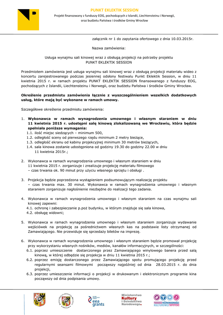 PUNKT EKLEKTIK SESSION Projekt finansowany z funduszy EOG, pochodzących z Islandii, Liechtensteinu i Norwegii, oraz budżetu Państwa i środków Gminy Wrocław załącznik nr 1 do zapytania ofertowego z dnia 10.03.2015r. Nazwa zamówienia: Usługa wynajmu sali kinowej wraz z obsługą projekcji na potrzeby projektu PUNKT EKLEKTIK SESSION Przedmiotem zamówienia jest usługa wynajmu sali kinowej wraz z obsługą projekcji materiału wideo z koncertu zarejestrowanego podczas jesiennej odsłony festiwalu Punkt Eklektik Session, w dniu 11 kwietnia 2015 r. w ramach projektu PUNKT EKLEKTIK SESSION finansowanego z funduszy EOG, pochodzących z Islandii, Liechtensteinu i Norwegii, oraz budżetu Państwa i środków Gminy Wrocław. Określenie przedmiotu zamówienia łącznie z wyszczególnieniem wszelkich dodatkowych usług, które mają być wykonane w ramach umowy. Szczegółowe określenie przedmiotu zamówienia: 1. Wykonawca w ramach wynagrodzenia umownego i własnym staraniem w dniu 11 kwietnia 2015 r. udostępni salę kinową zlokalizowaną we Wrocławiu, która będzie spełniała poniższe wymagania: 1.1. ilość miejsc siedzących – minimum 500, 1.2. odległość sceny od pierwszego rzędu minimum 2 metry bieżące, 1.3. odległość ekranu od kabiny projekcyjnej minimum 30 metrów bieżących, 1.4. sala kinowa zostanie udostępniona od godziny 19.30 do godziny 22.00 w dniu 11 kwietnia 2015r.; 2. Wykonawca w ramach wynagrodzenia umownego i własnym staraniem w dniu 11 kwietnia 2015 r. zorganizuje i zrealizuje projekcję materiału filmowego – czas trwania ok. 90 minut przy użyciu własnego sprzętu i obsługi . 3. Projekcja będzie poprzedzona wystąpieniem podsumowującym realizację projektu – czas trwania max. 30 minut. Wykonawca w ramach wynagrodzenia umownego i własnym staraniem zorganizuje nagłośnienie niezbędne do realizacji tego zadania. 4. Wykonawca w ramach wynagrodzenia umownego i własnym staraniem na czas wynajmu sali kinowej zapewni: 4.1. ochronę i zabezpieczanie p.poż budynku, w którym znajduje się sala kinowa, 4.2. obsługę widowni; 5. Wykonawca w ramach wynagrodzenia umownego i własnym staraniem zorganizuje wydawanie wejściówek na projekcję za pośrednictwem własnych kas na podstawie listy otrzymanej od Zamawiającego. Nie przewiduje się sprzedaży biletów na imprezę. 6. Wykonawca w ramach wynagrodzenia umownego i własnym staraniem będzie promował projekcję przy wykorzystaniu własnych nośników, mediów, kanałów informacyjnych, w szczególności: 6.1. poprzez umieszczenie dostarczonego przez Zamawiającego winylowego banera przed salą kinową, w której odbędzie się projekcja w dniu 11 kwietnia 2015 r.; 6.2. poprzez emisję dostarczonego przez Zamawiającego spotu promującego projekcję przed regularnymi seansami filmowymi począwszy najpóźniej od dnia 28.03.2015 r. do dnia projekcji, 6.3. poprzez umieszczenie informacji o projekcji w drukowanym i elektronicznym programie kina począwszy od dnia podpisania umowy.
