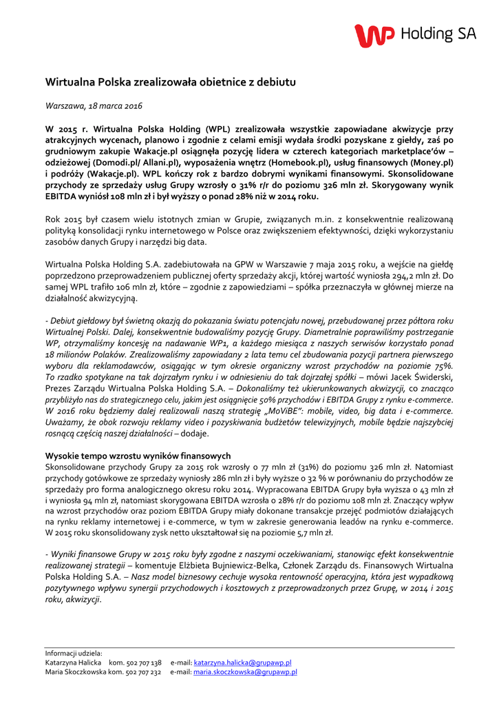 Wirtualna Polska zrealizowała obietnice z debiutu Warszawa, 18 marca 2016 W 2015 r. Wirtualna Polska Holding (WPL) zrealizowała wszystkie zapowiadane akwizycje przy atrakcyjnych wycenach, planowo i zgodnie z celami emisji wydała środki pozyskane z giełdy, zaś po grudniowym zakupie Wakacje.pl osiągnęła pozycję lidera w czterech kategoriach marketplace’ów – odzieżowej (Domodi.pl/ Allani.pl), wyposażenia wnętrz (Homebook.pl), usług finansowych (Money.pl) i podróży (Wakacje.pl). WPL kończy rok z bardzo dobrymi wynikami finansowymi. Skonsolidowane przychody ze sprzedaży usług Grupy wzrosły o 31% r/r do poziomu 326 mln zł. Skorygowany wynik EBITDA wyniósł 108 mln zł i był wyższy o ponad 28% niż w 2014 roku. Rok 2015 był czasem wielu istotnych zmian w Grupie, związanych m.in. z konsekwentnie realizowaną polityką konsolidacji rynku internetowego w Polsce oraz zwiększeniem efektywności, dzięki wykorzystaniu zasobów danych Grupy i narzędzi big data. Wirtualna Polska Holding S.A. zadebiutowała na GPW w Warszawie 7 maja 2015 roku, a wejście na giełdę poprzedzono przeprowadzeniem publicznej oferty sprzedaży akcji, której wartość wyniosła 294,2 mln zł. Do samej WPL trafiło 106 mln zł, które – zgodnie z zapowiedziami – spółka przeznaczyła w głównej mierze na działalność akwizycyjną. - Debiut giełdowy był świetną okazją do pokazania światu potencjału nowej, przebudowanej przez półtora roku Wirtualnej Polski. Dalej, konsekwentnie budowaliśmy pozycję Grupy. Diametralnie poprawiliśmy postrzeganie WP, otrzymaliśmy koncesję na nadawanie WP1, a każdego miesiąca z naszych serwisów korzystało ponad 18 milionów Polaków. Zrealizowaliśmy zapowiadany 2 lata temu cel zbudowania pozycji partnera pierwszego wyboru dla reklamodawców, osiągając w tym okresie organiczny wzrost przychodów na poziomie 75%. To rzadko spotykane na tak dojrzałym rynku i w odniesieniu do tak dojrzałej spółki – mówi Jacek Świderski, Prezes Zarządu Wirtualna Polska Holding S.A. – Dokonaliśmy też ukierunkowanych akwizycji, co znacząco przybliżyło nas do strategicznego celu, jakim jest osiągnięcie 50% przychodów i EBITDA Grupy z rynku e-commerce. W 2016 roku będziemy dalej realizowali naszą strategię „MoViBE”: mobile, video, big data i e-commerce. Uważamy, że obok rozwoju reklamy video i pozyskiwania budżetów telewizyjnych, mobile będzie najszybciej rosnącą częścią naszej działalności – dodaje. Wysokie tempo wzrostu wyników finansowych Skonsolidowane przychody Grupy za 2015 rok wzrosły o 77 mln zł (31%) do poziomu 326 mln zł. Natomiast przychody gotówkowe ze sprzedaży wyniosły 286 mln zł i były wyższe o 32 % w porównaniu do przychodów ze sprzedaży pro forma analogicznego okresu roku 2014. Wypracowana EBITDA Grupy była wyższa o 43 mln zł i wyniosła 94 mln zł, natomiast skorygowana EBITDA wzrosła o 28% r/r do poziomu 108 mln zł. Znaczący wpływ na wzrost przychodów oraz poziom EBITDA Grupy miały dokonane transakcje przejęć podmiotów działających na rynku reklamy internetowej i e-commerce, w tym w zakresie generowania leadów na rynku e-commerce. W 2015 roku skonsolidowany zysk netto ukształtował się na poziomie 5,7 mln zł. - Wyniki finansowe Grupy w 2015 roku były zgodne z naszymi oczekiwaniami, stanowiąc efekt konsekwentnie realizowanej strategii – komentuje Elżbieta Bujniewicz-Belka, Członek Zarządu ds. Finansowych Wirtualna Polska Holding S.A. – Nasz model biznesowy cechuje wysoka rentowność operacyjna, która jest wypadkową pozytywnego wpływu synergii przychodowych i kosztowych z przeprowadzonych przez Grupę, w 2014 i 2015 roku, akwizycji. Informacji udziela: Katarzyna Halicka kom. 502 707 138 Maria Skoczkowska kom. 502 707 232 e-mail: [email protected] e-mail: [email protected] Za rok zakończony 31 grudnia 2015 roku Za rok zakończony 31 grudnia 2014 roku Proforma* Przychody ze sprzedaży 325 583 248 304 77 279 31,1% Przychody gotówkowe ze sprzedaży 285 998 216 449 69 549 32,1% Przychody gotówkowe ze sprzedaży bez akwizycji 2015 (dla celów porównawczych)** 278 013 216 449 61 564 28,4% Zysk na działalności operacyjnej 63 951 22 691 41 260 181,8% Zysk przed opodatkowaniem 15 400 (283) 15 683 - Zysk netto 5 686 (2 031) 7 717 - EBITDA 94 393 51 014 43 379 85,0% Skorygowana EBITDA 107 825 84 088 23 737 28,2% w tys. zł Zmiana Zmiana % Przychody ze sprzedaży odnotowane przez WPL w czwartym kwartale 2015 roku wyniosły 102 mln zł, co w porównaniu do przychodów ze sprzedaży pro forma analogicznego okresu roku 2014 stanowi wzrost o 35 %. W tym samym czasie przychody gotówkowe wyniosły 89 mln zł, czyli były wyższe niemal o 40 % . Trzy miesiące zakończone 31 grudnia 2015 roku w tys. zł Trzy miesiące zakończone 31 grudnia 2014 roku Proforma* Zmiana Zmiana % Przychody ze sprzedaży 102 063 75 543 26 520 35,1% Przychody gotówkowe ze sprzedaży 89 381 64 072 25 309 39,5% Przychody gotówkowe ze sprzedaży bez akwizycji 2015 (dla celów porównawczych)** 84 053 64 072 19 981 31,2% Zysk na działalności operacyjnej 22 942 10 224 12 718 124,4% Zysk przed opodatkowaniem 2 874 4 611 (1 737) - Zysk netto (649) 2 627 (3 276) - EBITDA 31 374 16 972 14 402 84,9% Skorygowana EBITDA 33 391 25 248 8 143 32,3% EBITDA proforma za ostatnie 12 miesięcy Skorygowana EBITDA proforma za ostatnie 12 miesięcy 94 393 107 825 * Szczegóły dotyczące kalkulacji danych finansowych pro forma zostały opisane w części raportu Wyjaśnienia do skonsolidowanej informacji finansowej pro forma ** Przychody 2015 roku skorygowane o wpływ akwizycji dokonanych w 2015 roku (NextWeb Media Sp. z o.o., Blomedia Sp. z o.o., Finansoweysupermarket.pl Sp. z o.o., Web Broker Sp. z o.o. oraz Allani Sp. z o.o.) nie uwzględnionych w danych finansowych proforma za 2014 rok. Po wyłączeniu z przychodów 2015 roku wpływu dokonanych w nim akwizycji, których wyniki nie są ujęte w danych porównawczyc