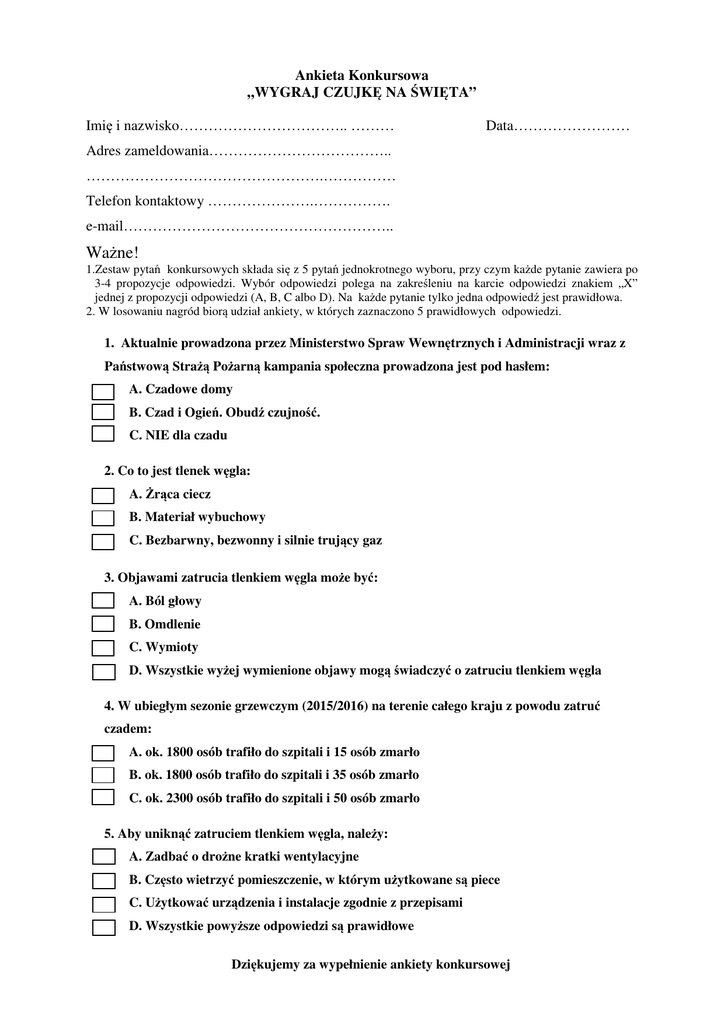 Ankieta Konkursowa „WYGRAJ CZUJKĘ NA ŚWIĘTA” Imię i nazwisko…………………………….. ……… Data…………………… Adres zameldowania……………………………….. ………………………………………….…………… Telefon kontaktowy ………………….……………. e-mail……………………………………………….. Ważne! 1.Zestaw pytań konkursowych składa się z 5 pytań jednokrotnego wyboru, przy czym każde pytanie zawiera po 3-4 propozycje odpowiedzi. Wybór odpowiedzi polega na zakreśleniu na karcie odpowiedzi znakiem „X” jednej z propozycji odpowiedzi (A, B, C albo D). Na każde pytanie tylko jedna odpowiedź jest prawidłowa. 2. W losowaniu nagród biorą udział ankiety, w których zaznaczono 5 prawidłowych odpowiedzi. 1. Aktualnie prowadzona przez Ministerstwo Spraw Wewnętrznych i Administracji wraz z Państwową Strażą Pożarną kampania społeczna prowadzona jest pod hasłem: A. Czadowe domy B. Czad i Ogień. Obudź czujność. C. NIE dla czadu 2. Co to jest tlenek węgla: A. Żrąca ciecz B. Materiał wybuchowy C. Bezbarwny, bezwonny i silnie trujący gaz 3. Objawami zatrucia tlenkiem węgla może być: A. Ból głowy B. Omdlenie C. Wymioty D. Wszystkie wyżej wymienione objawy mogą świadczyć o zatruciu tlenkiem węgla 4. W ubiegłym sezonie grzewczym (2015/2016) na terenie całego kraju z powodu zatruć czadem: A. ok. 1800 osób trafiło do szpitali i 15 osób zmarło B. ok. 1800 osób trafiło do szpitali i 35 osób zmarło C. ok. 2300 osób trafiło do szpitali i 50 osób zmarło 5. Aby uniknąć zatruciem tlenkiem węgla, należy: A. Zadbać o drożne kratki wentylacyjne B. Często wietrzyć pomieszczenie, w którym użytkowane są piece C. Użytkować urządzenia i instalacje zgodnie z przepisami D. Wszystkie powyższe odpowiedzi są prawidłowe Dziękujemy za wypełnienie ankiety konkursowej