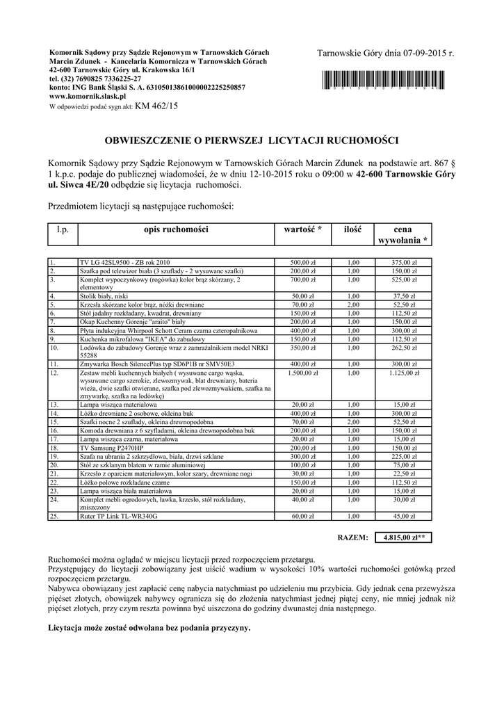Tarnowskie Góry dnia 07-09-2015 r. Komornik Sądowy przy Sądzie Rejonowym w Tarnowskich Górach Marcin Zdunek - Kancelaria Komornicza w Tarnowskich Górach 42-600 Tarnowskie Góry ul. Krakowska 16/1 tel. (32) 7690825 7336225-27 konto: ING Bank Śląski S. A. 63105013861000002225250857 www.komornik.slask.pl W odpowiedzi podać sygn.akt: KM *0015090700494* 462/15 OBWIESZCZENIE O PIERWSZEJ LICYTACJI RUCHOMOŚCI Komornik Sądowy przy Sądzie Rejonowym w Tarnowskich Górach Marcin Zdunek na podstawie art. 867 § 1 k.p.c. podaje do publicznej wiadomości, że w dniu 12-10-2015 roku o 09:00 w 42-600 Tarnowskie Góry ul. Siwca 4E/20 odbędzie się licytacja ruchomości. Przedmiotem licytacji są następujące ruchomości: l.p. 1. 2. 3. 4. 5. 6. 7. 8. 9. 10. 11. 12. 13. 14. 15. 16. 17. 18. 19. 20. 21. 22. 23. 24. 25. opis ruchomości wartość * ilość cena wywołania * TV LG 42SL9500 - ZB rok 2010 Szafka pod telewizor biała (3 szuflady - 2 wysuwane szafki) Komplet wypoczynkowy (rogówka) kolor brąz skórzany, 2 elementowy Stolik biały, niski Krzesła skórzane kolor brąz, nóżki drewniane Stół jadalny rozkładany, kwadrat, drewniany Okap Kuchenny Gorenje "araito" biały Płyta indukcyjna Whirpool Schott Ceram czarna czteropalnikowa Kuchenka mikrofalowa "IKEA" do zabudowy Lodówka do zabudowy Gorenje wraz z zamrażalnikiem model NRKI 55288 Zmywarka Bosch SilencePlus typ SD6P1B nr SMV50E3 Zestaw mebli kuchennych białych ( wysuwane cargo wąska, wysuwane cargo szerokie, zlewozmywak, blat drewniany, bateria wieża, dwie szafki otwierane, szafka pod zlewozmywakiem, szafka na zmywarkę, szafka na lodówkę) Lampa wisząca materiałowa Łóżko drewniane 2 osobowe, okleina buk Szafki nocne 2 szuflady, okleina drewnopodobna Komoda drewniana z 6 szyfladami, okleina drewnopodobna buk Lampa wisząca czarna, materiałowa TV Samsung P2470HP Szafa na ubrania 2 szkrzydłowa, biała, drzwi szklane Stół ze szklanym blatem w ramie aluminiowej Krzesło z oparciem materiałowym, kolor szary, drewniane nogi Łóżko polowe rozkładane czarne Lampa wisząca biała materiałowa Komplet mebli ogrodowych, ławka, krzesło, stół rozkładany, zniszczony Ruter TP Link TL-WR340G 500,00 zł 200,00 zł 700,00 zł 1,00 1,00 1,00 375,00 zł 150,00 zł 525,00 zł 50,00 zł 70,00 zł 150,00 zł 200,00 zł 400,00 zł 150,00 zł 350,00 zł 1,00 2,00 1,00 1,00 1,00 1,00 1,00 37,50 zł 52,50 zł 112,50 zł 150,00 zł 300,00 zł 112,50 zł 262,50 zł 400,00 zł 1.500,00 zł 1,00 1,00 300,00 zł 1.125,00 zł 20,00 zł 400,00 zł 70,00 zł 200,00 zł 20,00 zł 200,00 zł 300,00 zł 100,00 zł 30,00 zł 150,00 zł 20,00 zł 40,00 zł 1,00 1,00 2,00 1,00 1,00 1,00 1,00 1,00 1,00 1,00 1,00 1,00 15,00 zł 300,00 zł 52,50 zł 150,00 zł 15,00 zł 150,00 zł 225,00 zł 75,00 zł 22,50 zł 112,50 zł 15,00 zł 30,00 zł 60,00 zł 1,00 45,00 zł RAZEM: 4.815,00 zł** Ruchomości można oglądać w miejscu licytacji przed rozpoczęciem przetargu. Przystępujący do licytacji zobowiązany jest uiścić wadium w wysokości 10% wartości ruchomości gotówką przed rozpoczęciem przetargu. Nabywca obowiązany jest zapłacić cenę nabycia natychmiast po udzieleniu mu przybicia. Gdy jednak cena przewyższa pięćset złotych, obowiązek nabywcy ogranicza się do złożenia natychmiast jednej piątej ceny, nie mniej jednak niż pięćset złotych, przy czym reszta powinna być uiszczona do godziny dwunastej dnia następnego. Licytacja może zostać odwołana bez podania przyczyny.