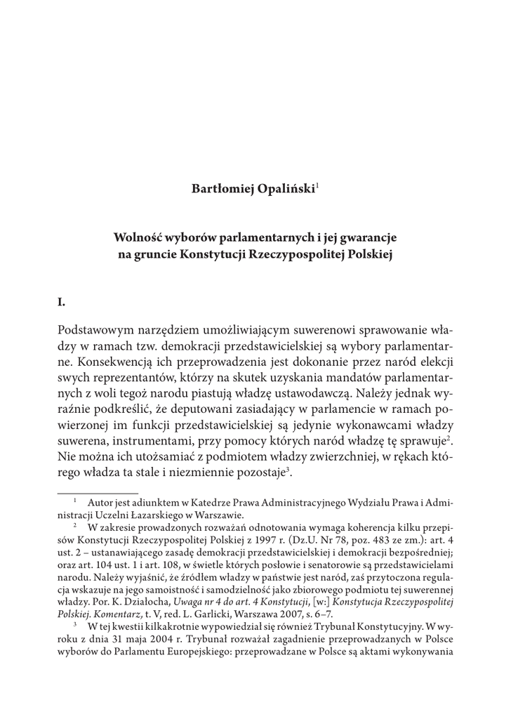 Bartłomiej Opaliński1 Wolność wyborów parlamentarnych i jej gwarancje na gruncie Konstytucji Rzeczypospolitej Polskiej I. Podstawowym narzędziem umożliwiającym suwerenowi sprawowanie władzy w ramach tzw. demokracji przedstawicielskiej są wybory parlamentarne. Konsekwencją ich przeprowadzenia jest dokonanie przez naród elekcji swych reprezentantów, którzy na skutek uzyskania mandatów parlamentarnych z woli tegoż narodu piastują władzę ustawodawczą. Należy jednak wyraźnie podkreślić, że deputowani zasiadający w parlamencie w ramach powierzonej im funkcji przedstawicielskiej są jedynie wykonawcami władzy suwerena, instrumentami, przy pomocy których naród władzę tę sprawuje2. Nie można ich utożsamiać z podmiotem władzy zwierzchniej, w rękach którego władza ta stale i niezmiennie pozostaje3. Autor jest adiunktem w Katedrze Prawa Administracyjnego Wydziału Prawa i Administracji Uczelni Łazarskiego w Warszawie. 2 W zakresie prowadzonych rozważań odnotowania wymaga koherencja kilku przepisów Konstytucji Rzeczypospolitej Polskiej z 1997 r. (Dz.U. Nr 78, poz. 483 ze zm.): art. 4 ust. 2 – ustanawiającego zasadę demokracji przedstawicielskiej i demokracji bezpośredniej; oraz art. 104 ust. 1 i art. 108, w świetle których posłowie i senatorowie są przedstawicielami narodu. Należy wyjaśnić, że źródłem władzy w państwie jest naród, zaś przytoczona regulacja wskazuje na jego samoistność i samodzielność jako zbiorowego podmiotu tej suwerennej władzy. Por. K. Działocha, Uwaga nr 4 do art. 4 Konstytucji, [w:] Konstytucja Rzeczypospolitej Polskiej. Komentarz, t. V, red. L. Garlicki, Warszawa 2007, s. 6–7. 3 W tej kwestii kilkakrotnie wypowiedział się również Trybunał Konstytucyjny. W wyroku z dnia 31 maja 2004 r. Trybunał rozważał zagadnienie przeprowadzanych w Polsce wyborów do Parlamentu Europejskiego: przeprowadzane w Polsce są aktami wykonywania 1 56 PRZEGLĄD PRAWA KONSTYTUCYJNEGO 2012/2 Na polskim gruncie ustrojowym regulacje determinujące zasady i funkcjonowanie systemu wyborczego zostały rozproszone w kilku aktach normatywnych. Fundamentem owych regulacji są przepisy Konstytucji Rzeczypospolitej Polskiej z 1997 r. Badanie systemu wyborczego wyłącznie z perspektywy regulacji konstytucyjnych należałoby jednak uznać za przedsięwzięcie niewystarczające. Ustawodawca konstytucyjny zwykł bowiem określać jedynie wybrane, najważniejsze zasady tego systemu stanowiące podstawę jego prawnej regulacji. Niemniej ich formalne oraz prawne znaczenie jest niebagatelne i bynajmniej nie może pozostawać niedocenione. Konstytucyjne zasady prawa wyborczego stanowią punkt wyjścia do dalszych prawnych regulacji tej problematyki, wyznaczając – niekiedy stosunkowo szerokie i elastyczne – ustrojowe ramy dla zwyczajów i procedur politycznych, czasem będących nawet preater legem. Są jednocześnie istotnym kryterium służącym ocenie ich konstytucyjnej legalności. Argumenty te w sposób wystarczający uzasadniają, że konstytucyjne zasady prawa wyborczego mogą bez wątpienia stanowić przedmiot wyodrębnionej refleksji teoretycznej4. Stosownie do tytułu niniejszego opracowania, dalsze uwagi zostaną poświęcone ustanowionym na gruncie Konstytucji Rzeczypospolitej gwarancjom zapewniającym poszanowanie jednej z istotnych zasad funkcjonujących w polskim systemie wyborczym – wolności wyborów. Funkcjowładzy zwierzchniej. Stwierdzono w nim, że „wybory do jako jednego z przejawów uczestnictwa Polski w Unii Europejskiej, o którym to uczestnictwie naród polski – zgodnie z art. 4 Konstytucji RP – zadecydował w trybie określonym przez art. 90 Konstytucji. Wybory te nie stanowią procedury realizowanej w celu wykonywania władzy zwierzchniej w Rzeczypospolitej Polskiej”. Zob. wyrok Trybunału Konstytucyjnego z dnia 31 maja 2004 r., K 15/04, OTK 2004, seria A, nr 5, poz. 47. Z kolei w wyroku z dnia 12 stycznia 2005 r. Trybunał zwrócił uwagę na przedstawicielski charakter Senatu przy okazji orzekania w sprawie tzw. ustawy kooperacyjnej, tj. ustawy z dnia 11 marca 2004 r. o współpracy Rady Ministrów z Sejmem i Senatem w sprawach związanych z członkostwem Rzeczypospolitej Polskiej w Unii Europejskiej (Dz.U. Nr 52, poz. 515 ze zm.). Jak wywiódł Trybunał, „zasadnicze znaczenie ma fakt, że uprawnienia i sam charakter Senatu wynikają wprost z zasady przedstawicielstwa, a pośrednio również z suwerenności Narodu. Jak stanowi art. 4 Konstytucji, władza zwierzchnia w Rzeczypospolitej należy do Narodu – to on jest suwerenem, sprawującym swą władzę bezpośrednio (referendum, obywatelska inicjatywa ustawodawcza) lub przez swoich przedstawicieli, zgromadzonych w Sejmie i Senacie Rzeczypospolitej. Wynika stąd, że obowiązkiem i prawem Senatu jest reprezentowanie Narodu”. Zob. wyrok Trybunału Konstytucyjnego z dnia 12 stycznia 2005 r., K 24/04, OTK 2005, seria A, nr 1, poz. 3. 4 Zob. W. Sokolewicz, Podstawowe zasady prawa wyborczego i ich ujęcie w konstytucji, „Państwo i Prawo” 1987, z. 10, s. 77. Bartłomiej Opaliński • Wolność wyborów parlamentarnych i jej gwarancje... 57 nowanie tej zasady zostanie omówione na tle wyborów do organów przedstawicielskich suwerena – Sejmu i Senatu5. II. W zakresie regulacji systemu wyborczego Konstytucja Rzeczypospolitej Polskiej z 1997 r. nie wyróżnia się na tle uregulowań ustrojowych innych krajów. Formułuje bowiem – jak już wzmiankowano – fundamentalne zasady dotyczące wyborów i prawa wyborczego, określając również podstawowe reguły systemu wyborczego do Sejmu i Senatu6. Reguły te choć dotyczą tej samej problematyki, nie zostały jednak ujęte w ramy jednego rozdziału ustawy zasadniczej. Rozproszono je, sytuując zarówno w rozdziale II, traktującym o wolnościach, prawach i obowiązkach człowieka i obywatela7, jak również w rozdziale IV poświęconym problematyce Sejmu i Senatu8. Podobnie jak we wcześniejszych