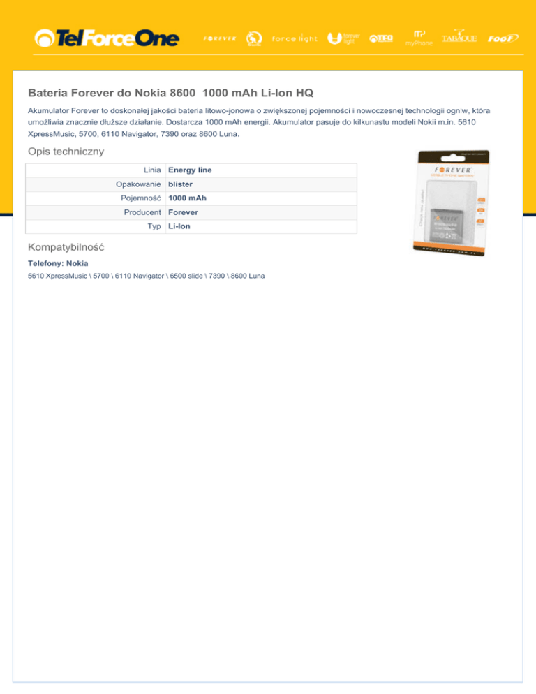 Bateria Forever do Nokia 8600 1000 mAh Li-Ion HQ Akumulator Forever to doskonałej jakości bateria litowo-jonowa o zwiększonej pojemności i nowoczesnej technologii ogniw, która umożliwia znacznie dłuższe działanie. Dostarcza 1000 mAh energii. Akumulator pasuje do kilkunastu modeli Nokii m.in. 5610 XpressMusic, 5700, 6110 Navigator, 7390 oraz 8600 Luna. Opis techniczny Linia Energy line Opakowanie blister Pojemność 1000 mAh Producent Forever Typ Li-Ion Kompatybilność Telefony: Nokia 5610 XpressMusic \ 5700 \ 6110 Navigator \ 6500 slide \ 7390 \ 8600 Luna