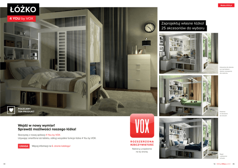 Meble.VOX.pl ŁÓŻKO 4 YOU by VOX Zaprojektuj własne łóżko! 25 akcesoriów do wyboru Kołysanka dla dziecka tuż nad łóżkiem idealne rozwiązanie dla rodziców. POLECAMY TEN PRODUKT Drabinka na akcesoria do ćwiczeń. Wejdź w nowy wymiar! Sprawdź możliwości naszego łóżka! Skorzystaj z nowej aplikacji 4 You by VOX. Używając smartfona lub tabletu, odkryj wszystkie funkcje łóżka 4 You by VOX. Więcej informacji na 6. stronie katalogu! ROZSZERZONA RZECZYWISTOŚĆ Nakieruj urządzenie na tę stronę. Regał i podręczne schowki. 44 VOX.pl/4YoubyVOX 45 Meble.VOX.pl SZAFA 4 YOU by VOX To nie szafa, to prawdziwa garderoba Idealnie zorganizowana przestrzeń na małej powierzchni kawalerki. Doskonale uporządkowana przestrzeń w sypialni. Bardzo pojemna szafa zorganizowana jak garderoba. Dostępna w trzech rozmiarach wysokości. Co kryje w sobie szafa? 1. Łatwy dostęp dzięki składanym drzwiom. 2. Regał boczny zwiększa pojemność szafy. 3. Ruchomy drążek na ubrania długie i krótkie. 4. 3 warianty wysokości do wyboru: 206, 240, 260 cm. 5. Wysuwane szuflady na mnóstwo mniejszych rzeczy. 46 Ma wygodne składane drzwi, półki z podwieszanymi drążkami na ubrania oraz wygodne drążki wysuwane, dzięki czemu masz łatwy dostęp do całej zawatości szafy. Szuflady i regulowane półki ułatwiają Ci porządkowanie i układanie ubrań. ROZSZERZONA RZECZYWISTOŚĆ Nakieruj urządzenie na tę stronę. VOX.pl/4YoubyVOX 47 Meble.VOX.pl STÓŁ 4 YOU by VOX Stół, który ma ambicję być czymś więcej Idealne miejsce na Twoje hobby. Domowy zielnik tuż przy Twoim talerzu. Wejdź w nowy wymiar! Sprawdź możliwości naszego stołu! Skorzystaj z nowej aplikacji 4 You by VOX. Używając smartfona lub tabletu, odkryj wszystkie funkcje stołu 4 You by VOX. Więcej informacji na 6. stronie katalogu! ROZSZERZONA RZECZYWISTOŚĆ Nakieruj urządzenie na tę stronę. Baw się i pracuj bez ograniczeń. 50 VOX.pl/4YoubyVOX 51