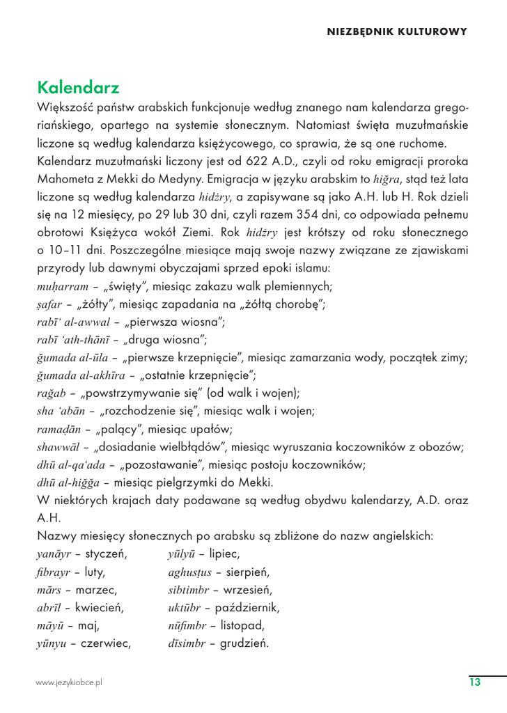NIEZBĘDNIK KULTUROWY Kalendarz Większość państw arabskich funkcjonuje według znanego nam kalendarza gregoriańskiego, opartego na systemie słonecznym. Natomiast święta muzułmańskie liczone są według kalendarza księżycowego, co sprawia, że są one ruchome. Kalendarz muzułmański liczony jest od 622 A.D., czyli od roku emigracji proroka Mahometa z Mekki do Medyny. Emigracja w języku arabskim to hi÷ra, stąd też lata liczone są według kalendarza hidĪry, a zapisywane są jako A.H. lub H. Rok dzieli się na 12 miesięcy, po 29 lub 30 dni, czyli razem 354 dni, co odpowiada pełnemu obrotowi Księżyca wokół Ziemi. Rok hidĪry jest krótszy od roku słonecznego o 10–11 dni. Poszczególne miesiące mają swoje nazwy związane ze zjawiskami przyrody lub dawnymi obyczajami sprzed epoki islamu: muarram – „święty”, miesiąc zakazu walk plemiennych; Ñafar – „żółty”, miesiąc zapadania na „żółtą chorobę”; rabƯ‘ al-awwal – „pierwsza wiosna”; rabƯ ‘ath-thƗnƯ – „druga wiosna”; ÷umada al-njla – „pierwsze krzepnięcie”, miesiąc zamarzania wody, początek zimy; ÷umada al-akhƯra – „ostatnie krzepnięcie”; ra÷ab – „powstrzymywanie się” (od walk i wojen); sha ‘abƗn – „rozchodzenie się”, miesiąc walk i wojen; ramaƗn – „palący”, miesiąc upałów; shawwƗl – „dosiadanie wielbłądów”, miesiąc wyruszania koczowników z obozów; dhnj al-qa‘ada – „pozostawanie”, miesiąc postoju koczowników; dhnj al-hi÷÷a – miesiąc pielgrzymki do Mekki. W niektórych krajach daty podawane są według obydwu kalendarzy, A.D. oraz A.H. Nazwy miesięcy słonecznych po arabsku są zbliżone do nazw angielskich: yanƗyr – styczeń, ynjlynj – lipiec, fibrayr – luty, aghusÓus – sierpień, mƗrs – marzec, sibtimbr – wrzesień, abrƯl – kwiecień, uktnjbr – październik, mƗynj – maj, nnjfimbr – listopad, ynjnyu – czerwiec, dƯsimbr – grudzień. www.jezykiobce.pl 13 ARABSKI DLA POCZĄTKUJĄCYCH W Libanie i Syrii miesiące słoneczne pokrywają się z kalendarzem gregoriańskim i mają swoje własne nazwy: kƗnnjn ath-thƗnƯ – styczeń, tammnjz – lipiec, shabƗÓ – luty, Ɨb – sierpień, ƗdhƗr – marzec, aylnjl – wrzesień, nƯsƗn – kwiecień, tishrƯn al-awwal – październik, ayyƗr – maj, tishrƯn ath-thƗnƯ – listopad, azƯrƗn – czerwiec, kƗnnjn al-awwal – grudzień. W Libii od momentu przewrotu wojskowego z 1 września 1969 r. wprowadzono nowy kalendarz, nieuznawany nigdzie indziej w świecie arabskim. Jest on mało znany, stąd też większość dat zapisuje się podwójnie – według kalendarza libijskiego i gregoriańskiego. Nie istnieje żaden system dni wolnych, który obejmowałby wszystkie kraje arabskie. Dniem świątecznym jest piątek – dzień modlitwy w meczecie. Część państw uznaje za weekend czwartek i piątek (Algieria, Syria), niektóre natomiast piątek i sobotę (Kuwejt). W Egipcie weekend jest ruchomy: jest to czwartek i piątek albo piątek i sobota. W dni wolne i świąteczne zamknięte są wszystkie urzędy, natomiast otwarta jest większość sklepów. Jedynie na czas piątkowej modlitwy w meczecie, około południa, drobni sklepikarze zamykają swoje stragany na ok. godzinę, a bazary i ulice wyludniają się. 14