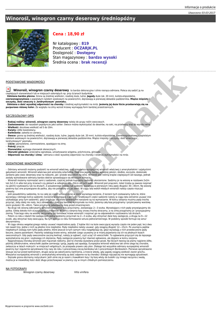 Informacje o produkcie Utworzono 03-03-2017 Winorośl, winogron czarny deserowy średniopóźny Cena : 18,90 zł Nr katalogowy : 819 Producent : OCZARJK.PL Dostępność : Dostępny Stan magazynowy : bardzo wysoki Średnia ocena : brak recenzji er m ar k PODSTAWOWE WIADOMOŚCI Winorośl, winogron czarny deserowy to bardzo dekoracyjna i silnie rosnąca odmiana. Poleca się sadzić ją na cieplejszych stanowiskach lub w miejscach osłoniętych np. przy ścianach budynków. Odmiana bardzo plenna. Grona są średniej wielkości, rzadziej duże, luźne. Jagody duże (ok. 20 mm), kulisto-elipsoidalne, czerwonogranatowe z popielatym nalotem woskowym na powierzchni, dojrzewają w pierwszej dekadzie października. Miąższ mięsisty i soczysty, dość smaczny o „landrynkowym” posmaku. Odmiana o dość wysokiej odporności na choroby i średniej wytrzymałości na mróz. Jesienią jej duże liście przebarwiają się na purpurowo różowy kolor. Ze względu na silny wzrost krzewy wymagają form bardziej przestrzennych. SZCZEGÓŁOWY OPIS - Rodzaj rośliny: winorośl, winogron czarny deserowy należy do grupy roślin owocowych. - Zastosowanie: do nasadzeń pojedynczo jako soliter. Owoce można wykorzystać do deserów, na soki, na przetwory oraz do wyrobu wina. - Wielkość: docelowa wielkość od 5 do 10m. - Kwiaty: żółte kwiatostany. - Kwitnienie: zakwita w czerwcu. - Owoce: grona są średniej wielkości, rzadziej duże, luźne. Jagody duże (ok. 20 mm), kulisto-elipsoidalne, czerwonogranatowe z popielatym nalotem woskowym na powierzchni, dojrzewają w pierwszej dekadzie października. Miąższ mięsisty i soczysty, dość smaczny o „ landrynkowym” posmaku. - Liście: jasnozielone, ciemnozielone, opadające na zimę. - Pokrój: pnącze. - Stanowisko: wymaga stanowisk słonecznych. - Warunki glebowe: przeciętna ogrodowa, umiarkowanie wilgotna, próchniczna, gliniasta. - Odporność na choroby i zimę: odmiana o dość wysokiej odporności na choroby i średniej wytrzymałości na mróz. DODATKOWE WIADOMOŚCI w at - Odmiany winorośli możemy podzielić na winorośl właściwą, oraz mieszańce europejskiej winorośli właściwej z amerykańskimi i azjatyckimi gatunkami winorośli. Winorośl właściwa jest winoroślą szlachetną. Daje ona jagody bardzo wysokiej jakości, słodkie, soczyste, doskonałe zarówno jako owoc deserowy oraz na rodzynki, jak i przede wszystkim na wino. Winorośl jest rośliną krajów cieplejszych od naszego, jednak zostały wyhodowane odmiany bardzo dobrze sprawdzające się w naszym klimacie. - Winorośl możemy rozmnażać sami z sadzonek, częściej jednak kupujemy sadzonki ukorzenione. Sadzimy je na wiosnę w rozstawie 2x2m lub 2x1,5 m albo też przy ścianach czy płotach w odległości 40—50cm od tych osłon. Winorośl jest pnączem, toteż trzeba ją zawsze rozpinać na jakimś rusztowaniu lub na drutach. Z posadzonego krzewu lub sadzonki wyrastają w pierwszym roku pędy długości 30—40cm. Na wiosnę powinny być one przywiązane do palika, aby nie pokładały się po ziemi. W ciągu lata wokół młodych winorośli należy często niszczyć chwasty. - Jeśli posadziliśmy sadzonkę, to na całej jej części umieszczonej w ziemi wyrastają korzenie, Z korzeni tych zostawiamy tylko te, które wyrastają z dolnego końca sadzonki; korzenie wyrastające z górnych i środkowych części sadzonki należy w ciągu lata ostrożnie usuwać (nie uszkadzając przy tym sadzonki), gdyż znajdując się blisko powierzchni narażone są na wymarzanie. W końcu sierpnia musimy pędy trochę przyciąć, żeby dalej nie rosły, lecz zdrewniały i stały się bardziej wytrzymałe na mróz. Jesienią całą łozę przyginamy i przykrywamy warstwą ziemi grubości 30—40cm. Takie przykrycie zabezpieczy łozę przed zmarznięciem. - Na drugi rok wiosną odkrywamy winorośl i wszystkie łozy przycinamy, zostawiając 2—3 oczka. Wyrastające z nich pędy przywiązujemy do palika. Glebę dokoła nich oczyszczamy z chwastów. W końcu sierpnia łozy znowu trochę skracamy, a na zimę przyginamy je i przysypujemy ziemią. Trzeciego roku na wiosnę zaczynamy już formować krzew winorośli i rozpinać go na odpowiednim rusztowaniu lub drutach. - Potem co roku z dwóch łóz zastępczych jedną będziemy przycinali na 2—3 oczka, aby otrzymać dwie łozy zastępcze, a drugą na 9—12 oczek, aby otrzymać łozę owocującą. Na tym polega co roku formowanie sznura jednoramiennego. W podobny sposób formuje się sznur dwuramienny. - W ciągu okresu wegetacyjnego należy usuwać niepotrzebne pędy. Z kątów liści na łozie owocującej wyrasta często nie jeden pęd, lecz dwa lub nawet trzy. Jedne z nich są płodne inne niepłodne. Pędy niepłodne należy usuwać, gdy osiągną długość 12—15cm. Po usunięciu pędów niepłodnych zostają nam tylko pędy płodne, które jeszcze w tym samym roku rozgałęziają się, gdyż wyrastają z nich przedwczesne pędy boczne, zwane pasierbami. Pasierby osłabiają krzew winny, wskutek czego usuwamy je w miarę pojawiania się ich na płodnych łozach owoconośnych. Gdy pędy owoconośne zaczną kwitnąć, należy je ogłowić, czyli uciąć ich wierzchołki. To ogławianie przyczyni się do lepszego wykształcenia się gron i szybszego ich dojrzenia. Pędy zastępcze powinny być również ogłowione, ale dopiero w końcu sierpnia. - Najgroźniejszą chorobą winorośli jest mączniak rzekomy. Jest to choroba wywołana przez grzyb. Na liściach tworzą się plamy najpierw żółte, później żółtobrunatne, wierzchołki pędów zamierają i gniją, jagody zaś opadają. Europejska winorośl właściwa tak silnie ulega tej chorobie, zwłaszcza w latach mokrych i w miejscach wilgotnych, że przepada prawie cały plon. Dlatego też wszystkie odmiany europejskiej winorośli powinny być regularnie opryskiwane trzy razy do roku 1-procentową cieczą bordoską lub 1-procentowym Bordosolem. Pierwsze opryskiwanie stosuje się t