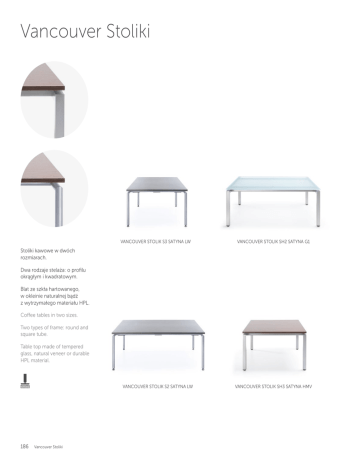 Vancouver Stoliki Vancouver Stolik S3 satyna LW Vancouver Stolik SH2 satyna G1 Stoliki kawowe w dwóch rozmiarach. Dwa rodzaje stelaża: o profilu okrągłym i kwadratowym. Blat ze szkła hartowanego, w okleinie naturalnej bądź z wytrzymałego materiału HPL. Coffee tables in two sizes. Two types of frame: round and square tube. Table top made of tempered glass, natural veneer or durable HPL material. Vancouver Stolik S2 satyna LW 186 Vancouver Stoliki Vancouver Stolik SH3 satyna HMV Stoły, stoliki, wieszaki / Tables and coat stands 187
