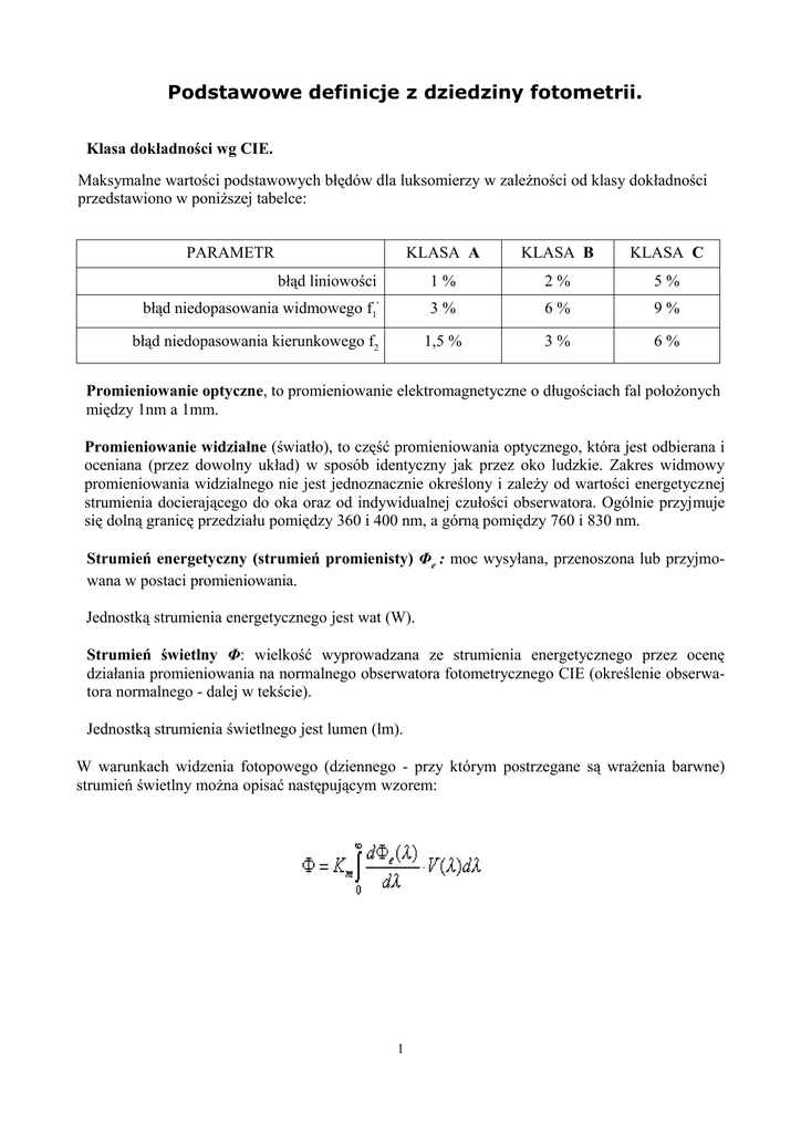 Podstawowe definicje z dziedziny fotometrii. Klasa dokładności wg CIE. Maksymalne wartości podstawowych błędów dla luksomierzy w zależności od klasy dokładności przedstawiono w poniższej tabelce: PARAMETR KLASA A KLASA B KLASA C błąd liniowości 1% 2% 5% błąd niedopasowania widmowego f1' 3% 6% 9% 1,5 % 3% 6% błąd niedopasowania kierunkowego f2 Promieniowanie optyczne, to promieniowanie elektromagnetyczne o długościach fal położonych między 1nm a 1mm. Promieniowanie widzialne (światło), to część promieniowania optycznego, która jest odbierana i oceniana (przez dowolny układ) w sposób identyczny jak przez oko ludzkie. Zakres widmowy promieniowania widzialnego nie jest jednoznacznie określony i zależy od wartości energetycznej strumienia docierającego do oka oraz od indywidualnej czułości obserwatora. Ogólnie przyjmuje się dolną granicę przedziału pomiędzy 360 i 400 nm, a górną pomiędzy 760 i 830 nm. Strumień energetyczny (strumień promienisty) Φe : moc wysyłana, przenoszona lub przyjmowana w postaci promieniowania. Jednostką strumienia energetycznego jest wat (W). Strumień świetlny Φ: wielkość wyprowadzana ze strumienia energetycznego przez ocenę działania promieniowania na normalnego obserwatora fotometrycznego CIE (określenie obserwatora normalnego - dalej w tekście). Jednostką strumienia świetlnego jest lumen (lm). W warunkach widzenia fotopowego (dziennego - przy którym postrzegane są wrażenia barwne) strumień świetlny można opisać następującym wzorem: 1 Światłość I: stosunek strumienia świetlnego dΦ, wysyłanego przez źródło promieniowania w elementarnym kącie przestrzennym dΩ, obejmującym dany kierunek, do wartości tego elementarnego kąta przestrzennego: Jednostką światłości jest kandela (cd). Luminancja L: iloraz strumienia świetlnego przenikającego w danym kierunku daną powierzchnię i iloczynu rzutu tej powierzchni na płaszczyznę prostopadłą do kierunku promieniowania i objętego promieniowaniem kąta bryłowego: gdzie: Φ - strumień świetlny θ - kąt zawarty między normalną do powierzchni A, a kierunkiem rozchodzenia się wiązki promieniowania. Ω - kąt przestrzenny obejmujący wiązkę promieniowania. Jeżeli powierzchnia dA jest źródłem promieniowania o światłości I, wówczas wzorem równoważnym jest: Jeżeli na powierzchnię dA pada wiązka światła wywołując na niej natężenie oświetlenia E, wówczas wzorem równoważnym jest: Jednostką luminancji jest kandela na metr kwadratowy (cd·m–2 ). 2 Natężenie oświetlenia E: stosunek strumienia świetlnego dΦ, padającego na elementarną powierzchnię dA, do wartości tej powierzchni: Jednostką natężenia oświetlenia jest luks (lx). Obserwator fotometryczny normalny CIE: idealny obserwator, którego krzywa względnej czułości widmowej jest zgodna z funkcją V(λ) w warunkach widzenia fotopowego (dziennego - przy którym postrzegane są wrażenia barwne) i funkcją V’(λ) w warunkach widzenia skotopowego (zmierzchowego). Przyjmuje się, że światło odbierane jest przez oko tylko poprzez aparat widzenia dziennego przy poziomach luminancji wyższych od kilku cd/m2, natomiast z widzeniem skotopowym mamy do czynienia przy poziomach luminancji mniejszych od kilku setnych cd/m2. Pomiędzy „czystym” widzeniem fotopowym a skotopowym rozróżnia się zakres widzenia mezopowego (mieszanego), który nie ma zastosowania metrologicznego. Fizjologia oka Pobudzenie siatkówki oka jest wprost proporcjonalne do natężenia oświetlenia E na jej powierzchni. Natężenie to można przedstawić (przy pominięciu różnych strat) jako: E = L· Ω gdzie: L - luminancja obserwowanego przedmiotu, Ω - kąt bryłowy zależny od średnicy źrenicy oka i odległości między soczewką a siatkówką. 3 Z powyższego wynika, że pobudzenie siatkówki oka jest wprost proporcjonalne do luminancji powierzchni świecącej. Luminancja jest więc właściwą miarą wrażenia jaskrawości. W przypadku stanowisk pracy z powierzchniami emitującymi strumień świetlny, np. stanowiska komputerowe, jedynie miernikiem luminancji można właściwie określić warunki świetlne w jakich znajduje się człowiek. INFORMACJE DODATKOWE Wiele ciekawych informacji można znaleźć także w publikacjach Centralnego Instytutu Ochrony Pracy (CIOP). Opisano w nich w przystępny sposób nie tylko definicje wielkości używanych w fotometrii, ale także zasady dokonywania pomiarów oraz dobór źródeł światła i sposób ich rozmieszczenia dla różnych zastosowań. Godne polecenia są m.in. dwie publikacje CIOP-u: "Oświetlenie ogólne i miejscowe stanowisk pracy", autorstwa A. Pawlaka i A. Wolskiej oraz "Oświetlenie pomieszczeń i stanowisk pracy", tych samych autorów. CIOP organizuje również kursy i szkolenia z zakresu fotometrii i pomiarów hałasu, przeznaczone głównie dla służb BHP. POLSKIE NORMY ZWIĄZANE Z TECHNIKĄ ŚWIETLNĄ I OŚWIETLENIOWĄ Przed wykorzystaniem należy sprawdzić, czy dana norma jest aktualna. PN-90/E-01005 "Technika świetlna. Terminologia" PN-EN 12464-1:2004 "Oświetlenie miejsc pracy. Część 1: Miejsca pracy we wnętrzach" PN-EN 12665:2003 "Światło i oświetlenie -Podstawowe terminy oraz kryteria określania wymagań dotyczących oświetlenia". W normie omówiono podstawowe terminy oraz podano w formie stabelaryzowanej wymagania oświetleniowe dotyczące wnętrz w zależności od rodzaju wykonywanej pracy. PN-89/E-04040.00 "Pomiary promieniowania optycznego. Pomiary fotometryczne. Wymagania ogólne" PN-89/E-04040.01 "Pomiary promieniowania optycznego. Pomiary fotometryczne. Pomiar i wyznaczanie strumienia świetlnego" PN-89/E-04040.02 "Pomiary promieniowania optycznego. Pomiary fotometryczne. Pomiar światłości" PN-89/E-04040.03 "Pomiary fotometryczne i radiometryczne. Pomiar natężenia oświetlenia" PN-89/E-04040.04 "Pomiary fotometryczne i radiometryczne. Pomiar luminancji" PN-89/E-04040.05 "Pomiary fotomet