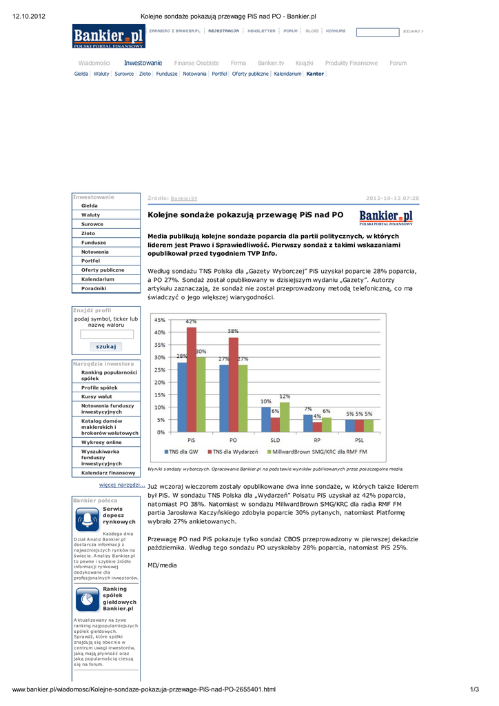 12.10.2012 Kolejne sondaże pokazują przewagę PiS nad PO - Bankier.pl Inwestowanie Wiadomości Giełda Waluty Surowce Inwestowanie Złoto Finanse Osobiste Fundusze Notowania Portfel Firma Bankier.tv Oferty publiczne Książki Produkty Finansowe Forum Kalendarium Kantor Źródło: Bankier24 2012-10-12 07:28 Giełda Kolejne sondaże pokazują przewagę PiS nad PO Waluty Surowce Złoto Fundusze Notowania Media publikują kolejne sondaże poparcia dla partii politycznych, w których liderem jest Prawo i Sprawiedliwość. Pierwszy sondaż z takimi wskazaniami opublikował przed tygodniem TVP Info. Portfel Oferty publiczne Kalendarium Poradniki Według sondażu TNS Polska dla „Gazety Wyborczej” PiS uzyskał poparcie 28% poparcia, a PO 27%. Sondaż został opublikowany w dzisiejszym wydaniu „Gazety”. Autorzy artykułu zaznaczają, że sondaż nie został przeprowadzony metodą telefoniczną, co ma świadczyć o jego większej wiarygodności. Znajdź profil podaj symbol, ticker lub nazwę waloru Narzędzia inwestora Ranking popularności spółek Profile spółek Kursy walut Notowania funduszy inwestycyjnych Katalog domów maklerskich i brokerów walutowych Wykresy online Wyszukiwarka funduszy inwestycyjnych Kalendarz finansowy Wyniki s ondaży wyborczych. Opracowanie Bankier.pl na pods tawie wyników publikowanych przez pos zczegolne media. więcej narzędzi... Już wczoraj wieczorem zostały opublikowane dwa inne sondaże, w których także liderem Bankier poleca Serwis depesz rynkowych Każdego dnia D ział A naliz Bankier.pl dos tarc za informac ji z najważniejs zyc h rynków na ś wiec ie. A nalizy Bankier.pl to pewne i s zybkie źródło informac ji rynkowej dedykowane dla profes jonalnyc h inwes torów. był PiS. W sondażu TNS Polska dla „Wydarzeń” Polsatu PiS uzyskał aż 42% poparcia, natomiast PO 38%. Natomiast w sondażu MillwardBrown SMG/KRC dla radia RMF FM partia Jarosława Kaczyńskiego zdobyła poparcie 30% pytanych, natomiast Platformę wybrało 27% ankietowanych. Przewagę PO nad PiS pokazuje tylko sondaż CBOS przeprowadzony w pierwszej dekadzie października. Według tego sondażu PO uzyskałaby 28% poparcia, natomiast PiS 25%. MD/media Ranking spółek giełdowych Bankier.pl A ktualizowany na żywo ranking najpopularniejs zyc h s półek giełdowyc h. Sprawdź, które s półki znajdują s ię obec nie w c entrum uwagi inwes torów, jaką mają płynnoś ć oraz jaką popularnoś c ią c ies zą s ię na forum. www.bankier.pl/wiadomosc/Kolejne-sondaze-pokazuja-przewage-PiS-nad-PO-2655401.html 1/3