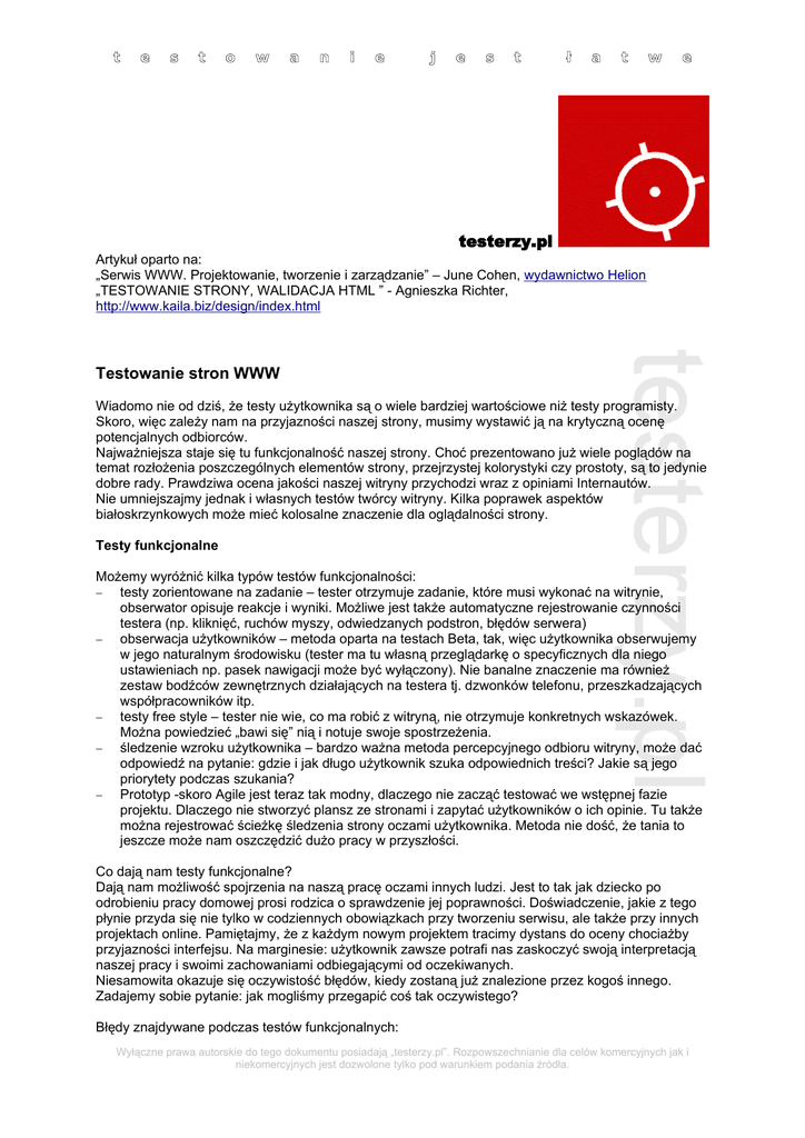t e s t o w a n i e j e s t ł a t w e testerzy.pl Artykuł oparto na: „Serwis WWW. Projektowanie, tworzenie i zarządzanie” – June Cohen, wydawnictwo Helion „TESTOWANIE STRONY, WALIDACJA HTML ” - Agnieszka Richter, http://www.kaila.biz/design/index.html Testowanie stron WWW Wiadomo nie od dziś, że testy użytkownika są o wiele bardziej wartościowe niż testy programisty. Skoro, więc zależy nam na przyjazności naszej strony, musimy wystawić ją na krytyczną ocenę potencjalnych odbiorców. Najważniejsza staje się tu funkcjonalność naszej strony. Choć prezentowano już wiele poglądów na temat rozłożenia poszczególnych elementów strony, przejrzystej kolorystyki czy prostoty, są to jedynie dobre rady. Prawdziwa ocena jakości naszej witryny przychodzi wraz z opiniami Internautów. Nie umniejszajmy jednak i własnych testów twórcy witryny. Kilka poprawek aspektów białoskrzynkowych może mieć kolosalne znaczenie dla oglądalności strony. Testy funkcjonalne Możemy wyróżnić kilka typów testów funkcjonalności: − testy zorientowane na zadanie – tester otrzymuje zadanie, które musi wykonać na witrynie, obserwator opisuje reakcje i wyniki. Możliwe jest także automatyczne rejestrowanie czynności testera (np. kliknięć, ruchów myszy, odwiedzanych podstron, błędów serwera) − obserwacja użytkowników – metoda oparta na testach Beta, tak, więc użytkownika obserwujemy w jego naturalnym środowisku (tester ma tu własną przeglądarkę o specyficznych dla niego ustawieniach np. pasek nawigacji może być wyłączony). Nie banalne znaczenie ma również zestaw bodźców zewnętrznych działających na testera tj. dzwonków telefonu, przeszkadzających współpracowników itp. − testy free style – tester nie wie, co ma robić z witryną, nie otrzymuje konkretnych wskazówek. Można powiedzieć „bawi się” nią i notuje swoje spostrzeżenia. − śledzenie wzroku użytkownika – bardzo ważna metoda percepcyjnego odbioru witryny, może dać odpowiedź na pytanie: gdzie i jak długo użytkownik szuka odpowiednich treści? Jakie są jego priorytety podczas szukania? − Prototyp -skoro Agile jest teraz tak modny, dlaczego nie zacząć testować we wstępnej fazie projektu. Dlaczego nie stworzyć plansz ze stronami i zapytać użytkowników o ich opinie. Tu także można rejestrować ścieżkę śledzenia strony oczami użytkownika. Metoda nie dość, że tania to jeszcze może nam oszczędzić dużo pracy w przyszłości. Co dają nam testy funkcjonalne? Dają nam możliwość spojrzenia na naszą pracę oczami innych ludzi. Jest to tak jak dziecko po odrobieniu pracy domowej prosi rodzica o sprawdzenie jej poprawności. Doświadczenie, jakie z tego płynie przyda się nie tylko w codziennych obowiązkach przy tworzeniu serwisu, ale także przy innych projektach online. Pamiętajmy, że z każdym nowym projektem tracimy dystans do oceny chociażby przyjazności interfejsu. Na marginesie: użytkownik zawsze potrafi nas zaskoczyć swoją interpretacją naszej pracy i swoimi zachowaniami odbiegającymi od oczekiwanych. Niesamowita okazuje się oczywistość błędów, kiedy zostaną już znalezione przez kogoś innego. Zadajemy sobie pytanie: jak mogliśmy przegapić coś tak oczywistego? Błędy znajdywane podczas testów funkcjonalnych: Wyłączne prawa autorskie do tego dokumentu posiadają „testerzy.pl”. Rozpowszechnianie dla celów komercyjnych jak i niekomercyjnych jest dozwolone tylko pod warunkiem podania źródła. t e s t o w a n i e j e s t ł a t w e problem z określeniem celu witryny problemy z wyszukiwaniem elementów witryny problemy z nazwami podstron i/lub ich oznaczeniami problemy z grupowaniem elementów podobnych problemy z tempem lub kolejnością czynności np. nie możemy poprosić o numer karty kredytowej na pierwszej stronie naszego serwisu! Błędy przeoczane przy testach funkcjonalnych: • używalność funkcji • czy wszystkie funkcje zostały umieszczone. Nie każdy może pozwolić sobie na zatrudnienie testerów do sprawdzania własnej witryny. Okazuje się, że nie jest to tak naprawdę konieczne. Nie musisz zawsze zapłacić za testowanie. Tam gdzieś w sieci zawsze znajdzie się ktoś, kto zechce ci pomóc. A może czasami warto poprosić znajomych, czy rodzinę o test twojej strony. Sprawdź się sam Najtaniej i najszybciej, choć nie koniecznie najlepiej sprawdzisz się sam. Spróbuj wcielić się w użytkownika i spojrzeć jego oczami na swój serwis. Co będzie go irytować? Co będzie zniechęcać go do kolejnego odwiedzenia twojej strony? Poprawność językowa i stylistyczna. Są błędy, które możesz znaleźć sam i należą do nich ortografia i interpunkcja. W czasach komputeryzacji nie jest to silna strona nikogo z nas, ale warto się czasami pochylić nad tym tematem. Gwarantuje wam, że jeśli Internauta znajdzie na waszej stronie informację „Witaj w mojim serwisie” nigdy więcej was już nie odwiedzi. Dbałość o szczegóły to okazywanie szacunku ludziom, którzy oglądają waszą stronę. Może nam w tym pomóc wbudowany w wiele narzędzi słownik ortograficzny. Najłatwiej można sprawdzić to przy pomocy MS Word. Dbałość o szczegóły na przykład unikanie stawiania spacji przed kropką może cię uchronić od przerzucenia tejże do następnej linii. Obsługa przeglądarek. Jednym z podstawowych pytań, jakie musi zadać sobie każdy programista www jest jak jego serwis będzie pracował w różnych przeglądarkach. Oczywiście możemy się oprzeć na testach w IE 6.0 i zapomnieć o całej reszcie, ale może nam to wykluczyć np. wszystkich użytkowników Linux-a (wrogów Windows-a). Nie można zapomnieć o innych przeglądarkach. Zalecam skoncentrowanie się przynajmniej na zyskującym popularność FireFox. Poprawność odnośników. Oceńcie swój poziom zdenerwowania, gdy na portalu klikacie w link, z którym nie kryje się żadna treść za wyjątkiem błędu. Warto, w