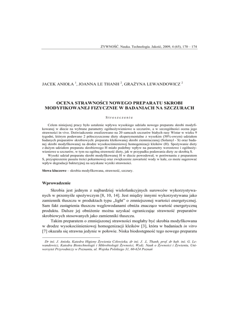 ŻYWNOŚĆ. Nauka. Technologia. Jakość, 2009, 4 (65), 170 – 174 JACEK ANIOŁA 1, JOANNA LE THANH 2, GRAŻYNA LEWANDOWICZ 2 OCENA STRAWNOŚCI NOWEGO PREPARATU SKROBI MODYFIKOWANEJ FIZYCZNIE W BADANIACH NA SZCZURACH Streszczenie Celem niniejszej pracy było ustalenie wpływu wysokiego udziału nowego preparatu skrobi modyfikowanej w diecie na wybrane parametry ogólnożywieniowe u szczurów, a w szczególności ocena jego strawności in vivo. Doświadczenie zrealizowano na 20 samcach szczurów białych rasy Wistar w wieku 9 tygodni, którym podawano 2 półoczyszczone diety eksperymentalne z wysokim (50%-owym) udziałem badanych preparatów skrobiowych: preparatu kleikowanej skrobi ziemniaczanej (Solamyl - S) oraz badanej skrobi modyfikowanej na drodze wysokociśnieniowej homogenizacji kleików (H). Spożywanie diety z dużym udziałem preparatu skrobiowego H miało podobny wpływ na parametry wzrostowe i ogólnożywieniowe u szczurów, w tym na ogólną strawność diety, jak w przypadku podawania diety ze skrobią S. Wysoki udział preparatu skrobi modyfikowanej H w diecie powodował, w porównaniu z preparatem S, przyspieszenie pasażu treści pokarmowej oraz zwiększenie zawartość wody w kale, co może sugerować wpływ degradacji bakteryjnej na uzyskane wyniki strawności. Słowa kluczowe – skrobia modyfikowana, strawność, szczury. Wprowadzenie Skrobia jest jednym z najbardziej wielofunkcyjnych surowców wykorzystywanych w przemyśle spożywczym [8, 10, 14]. Jest między innymi wykorzystywana jako zamiennik tłuszczu w produktach typu „light” o zmniejszonej wartości energetycznej. Sam fakt zastąpienia tłuszczu węglowodanami obniża znacząco wartość energetyczną produktu. Dalsze jej obniżenie można uzyskać ograniczając strawność preparatów skrobiowych stosowanych jako zamienniki tłuszczu. Takim preparatem o zmniejszonej strawności mogłaby być skrobia modyfikowana w drodze wysokociśnieniowej homogenizacji kleików [3], która w badaniach in vitro [7] okazała się strawna jedynie w połowie. Niska biodostępność tego nowego preparatu 1 rDr inż. J. Anioła, Katedra Higieny Żywienia Człowieka, dr inż. J. .L. Thanh, prof. dr hab. inż. G. Lewandowicz, Katedra Biotechnologii i Mikrobiologii Żywności, Wydz. Nauk o Żywności i Żywieniu, Uniwersytet Przyrodniczy w Poznaniu, ul. Wojska Polskiego 31, 60-624 Poznań OCENA STRAWNOŚCI NOWEGO PREPARATU SKROBI MODYFIKOWANEJ FIZYCZNIE… 1 171 skrobi nie była dotychczas potwierdzona w badaniach in vivo, stąd było to celem niniejszej pracy. Materiał i metody badań Ocenie biologicznej poddano nowy preparat skrobi modyfikowanej fizycznie „H”, otrzymany na drodze wysokociśnieniowej homogenizacji kleików [3]. Doświadczenie zrealizowano, za zgodą Lokalnej Komisji Etycznej nr 23/2008, na 20. samcach szczurów białych rasy Wistar w wieku 9 tygodni o średniej masie początkowej 278 ± 20 g. Zwierzęta pochodzące z hodowli Uniwersytetu Medycznego w Poznaniu podzielono na 2 równoliczne grupy, które otrzymywały ad libitum diety eksperymentalne złożone z: preparatów skrobiowych (50%), kazeiny (20%), oleju słonecznikowego (10%), cukru (10%), skrobi ziemniaczanej (5%), mieszanek: witaminowej (1%) i mineralnej (4%) sporządzonych wg AIN-93 [12]. Grupa badana (H) otrzymywała dietę ze skrobią ziemniaczaną modyfikowaną w drodze wysokociśnieniowej homogenizacji kleików, a grupa referencyjna (S) dietę z preparatem wstępnie kleikowanej skrobi ziemniaczanej „Solamyl”, produkcji P.P.H.U. Chemet Sp. z o.o., Plewiska k/Poznania. Doświadczenie trwało 15 dni, przy czym od dnia 5 do 13 przeprowadzono badania bilansowe metodą klasyczną. W dietach oraz kale oznaczono podstawowy skład za pomocą powszechnie stosowanych metod analitycznych, a zawartość węglowodanów obliczono z różnicy [13]. Wyniki i dyskusja Jak wynika z tabeli 1 obie grupy doświadczalne różniły się istotnie ilością spożytej paszy, ilością wydalonego kału i jego uwodnieniem oraz czasem pasażu jelitowego. Nie było natomiast istotnych statystycznie różnic w efektywności żywienia i współczynnikach strawności, chociaż odnotowano tendencje do mniejszej strawności pozornej suchej masy diety i skrobi w grupie żywionej preparatem H, otrzymanym na drodze wysokociśnieniowej homogenizacji kleików. Zwierzęta grupy H, karmione dietą z 50% udziałem preparatu skrobi modyfikowanej spożywały statystycznie więcej paszy, niż szczury grupy referencyjnej S. Bardzo zbliżone wartości wskaźnika efektywności żywienia w obu grupach szczurów wskazują, iż nie wynikało to z potrzeby kompensacji różnic w ilości dostępnej energii - a efekt taki był wcześniej obserwowany, m.in. przez Zhou i Kaplana [15], ale raczej z większej atrakcyjności sensorycznej diety zawierającej nowy preparat skrobi. Różnica w składzie obu diet testowych okazała się zbyt mała by spowodować istotne różnice w przyrostach masy ciała szczurów. Nieznacznie wyższe przyrosty w grupie zwierząt karmionych dietą H wynikały z większego spożycia diety w tej grupie. Z tego samego 172 Jacek Anioła, Joanna Le Thanh, Grażyna Lewandowicz powodu w grupie tej odnotowano też większe wydalanie kału, w przeliczeniu na jego suchą masę. Istotnie większa zawartość wody w stolcu zwierząt grupy H sugeruje, iż skrobia modyfikowana wpływa na zdolność do wiązania wody przez kał, ale może też świadczyć o intensywniejszym rozwoju mikroflory jelitowej [5, 6, 11]. W przypadku pasażu treści pokarmowej, średni jego czas był wyraźnie krótszy w grupie H, co wskazuje na to, iż skrobia modyfikowana H pobudzała silniej motorykę układu pokarmowego, niż skrobia niemodyfikowana S. Sugeruje to, iż w górnych odcinkach przewodu pokarmowego badana skrobia H pozostaje niestrawiona w stopniu istotnym dla oddziaływania na motorykę przewodu pokarmowego. Tabela 1 Oddziaływanie rodzaju skrobi na wybrane parametry doświadczalne. Star